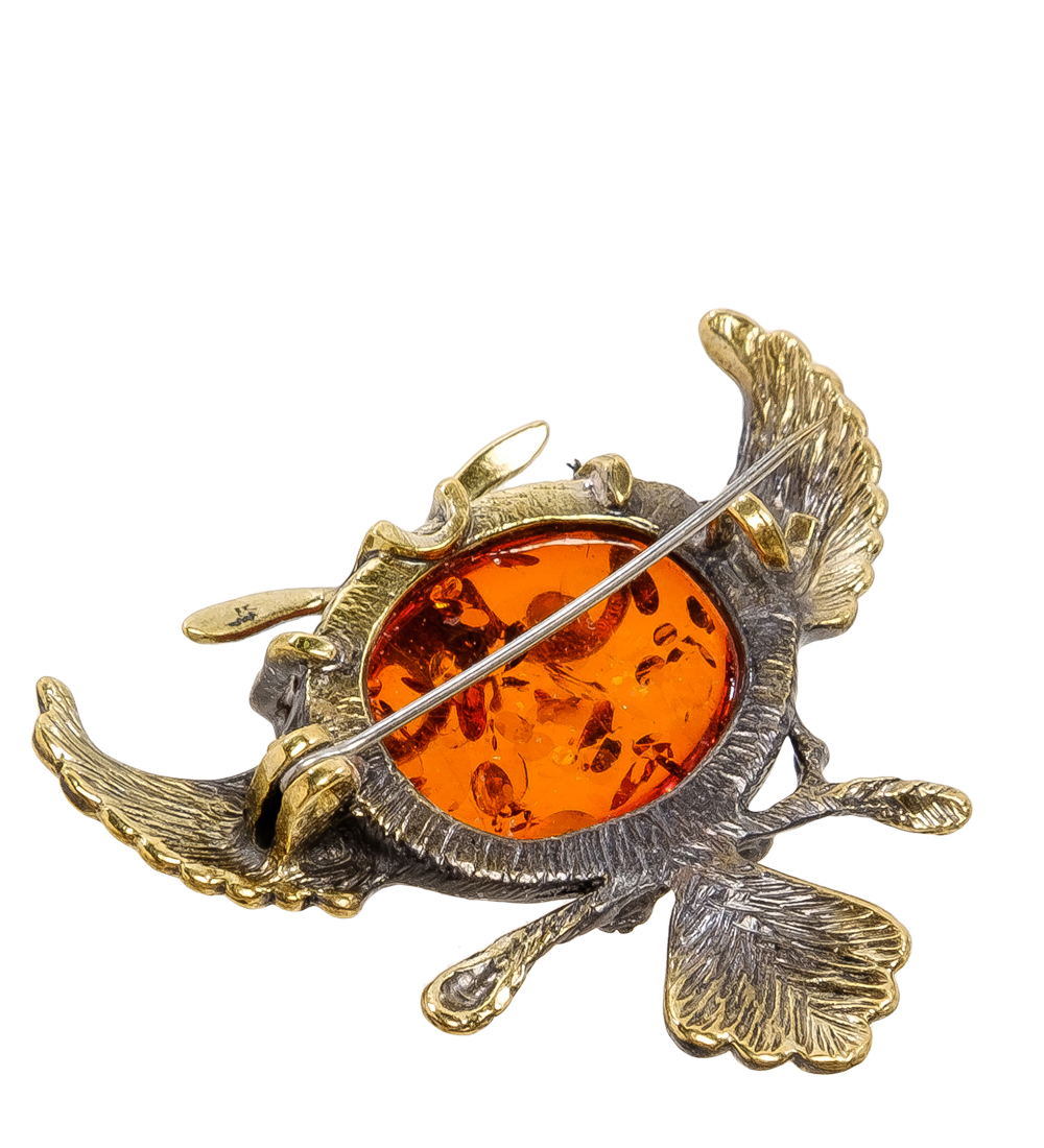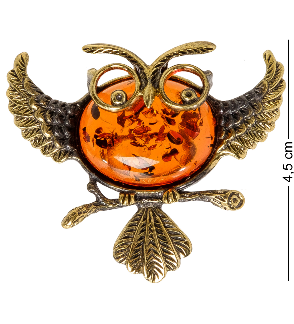 Am-2111 брошь сова ученая (латунь, янтарь)