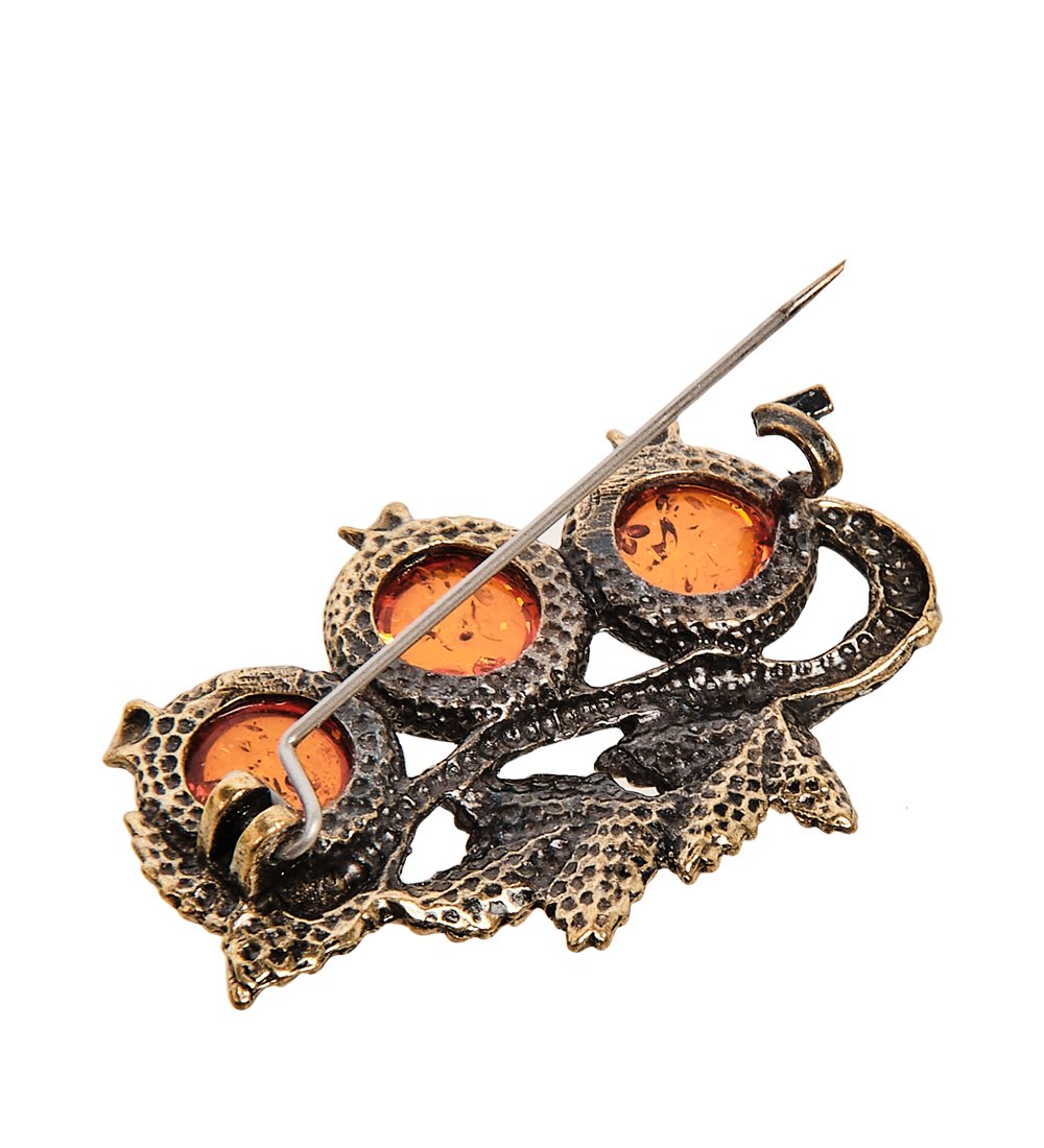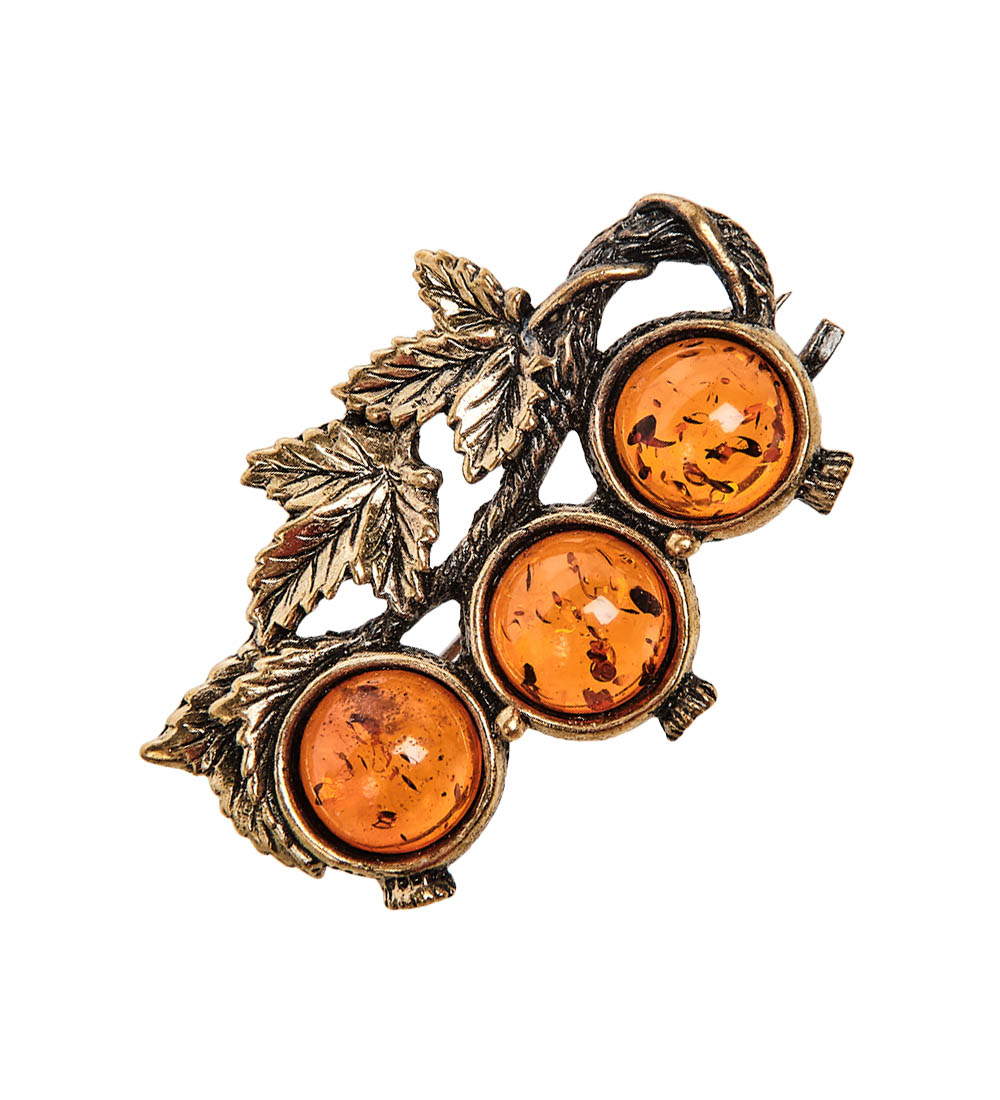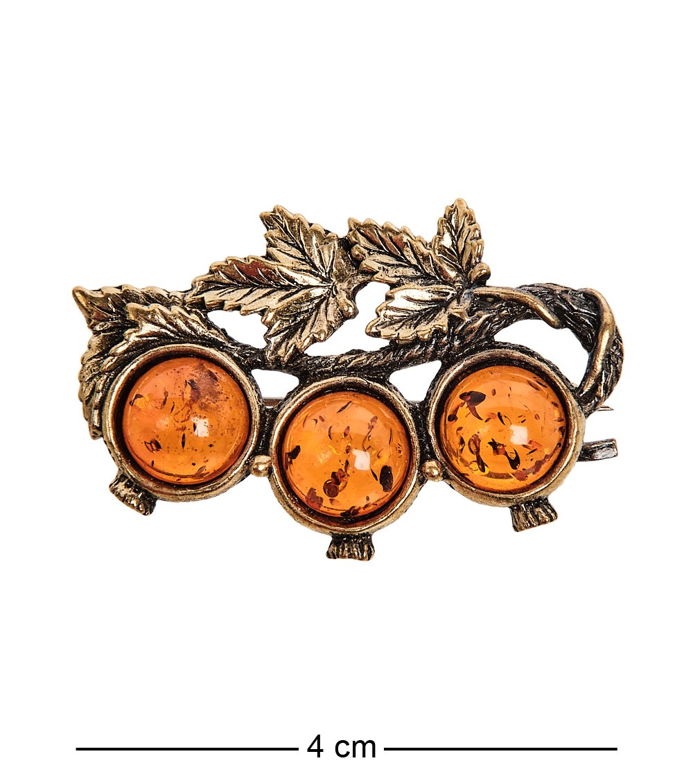 Am-2355 брошь лист смородины (латунь, янтарь)