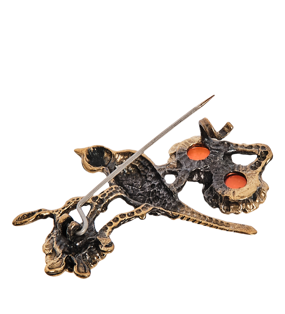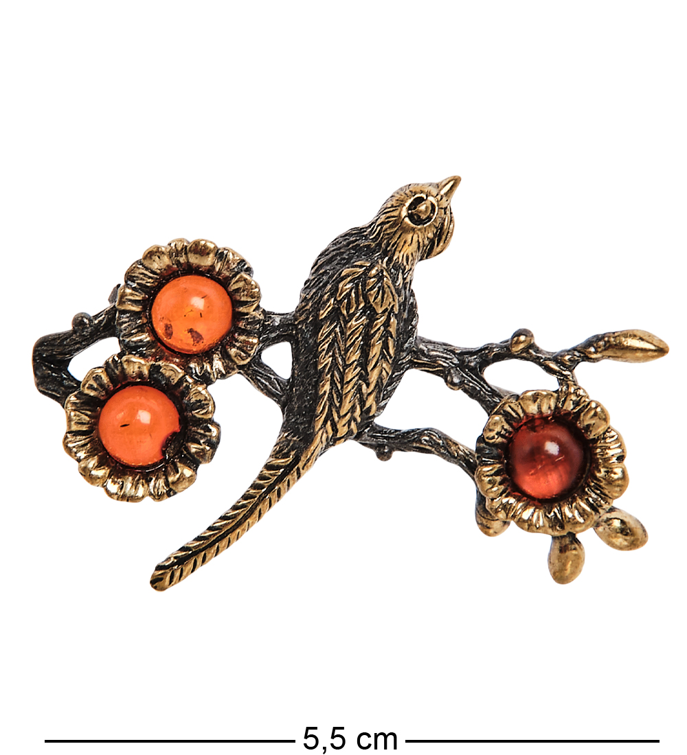 Am-2379 брошь райская птичка (латунь, янтарь)