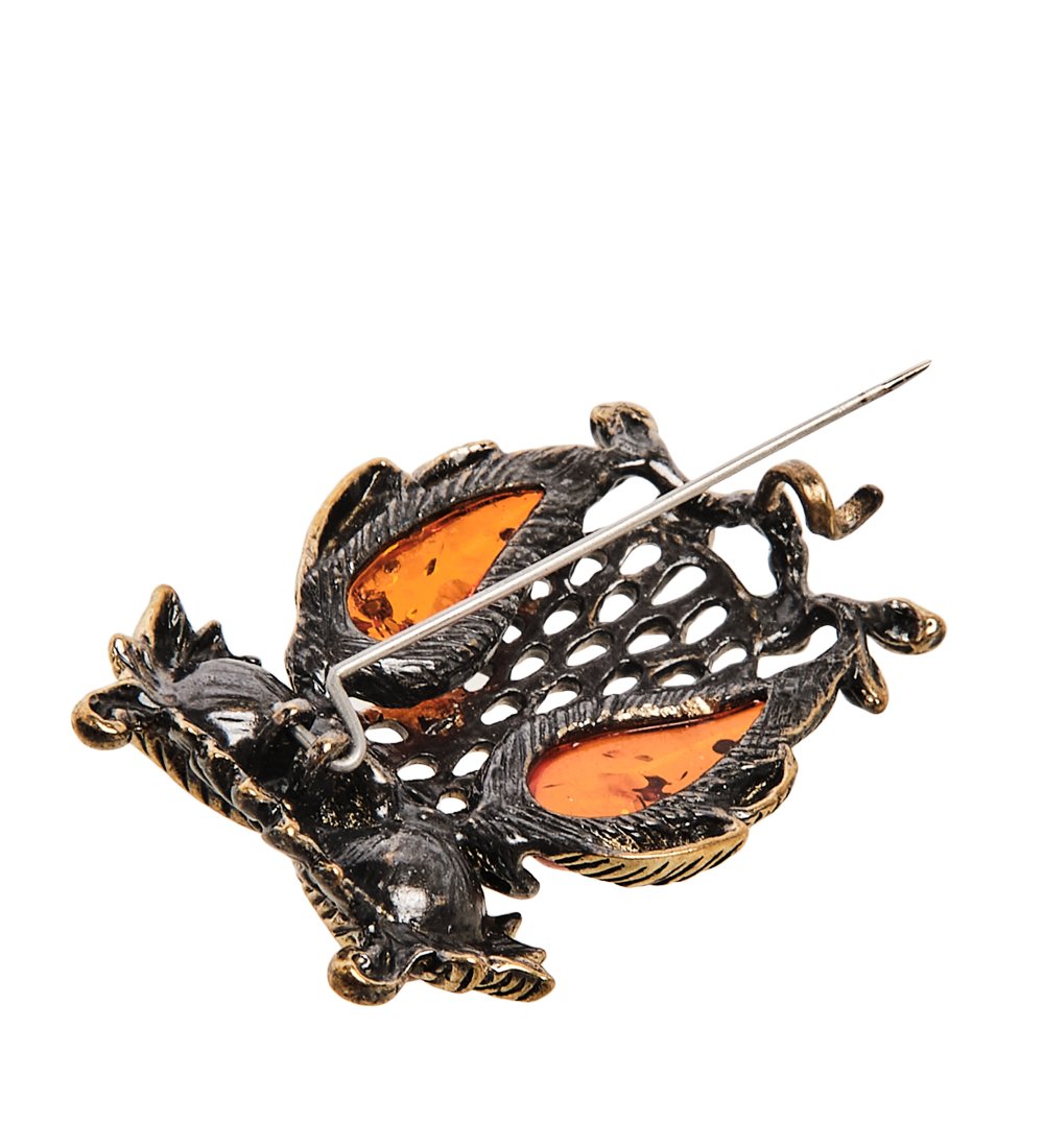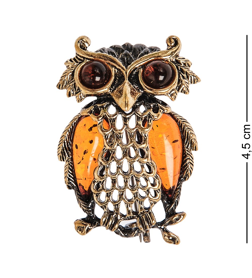 Am-2392 брошь сова на веточке (латунь, янтарь)