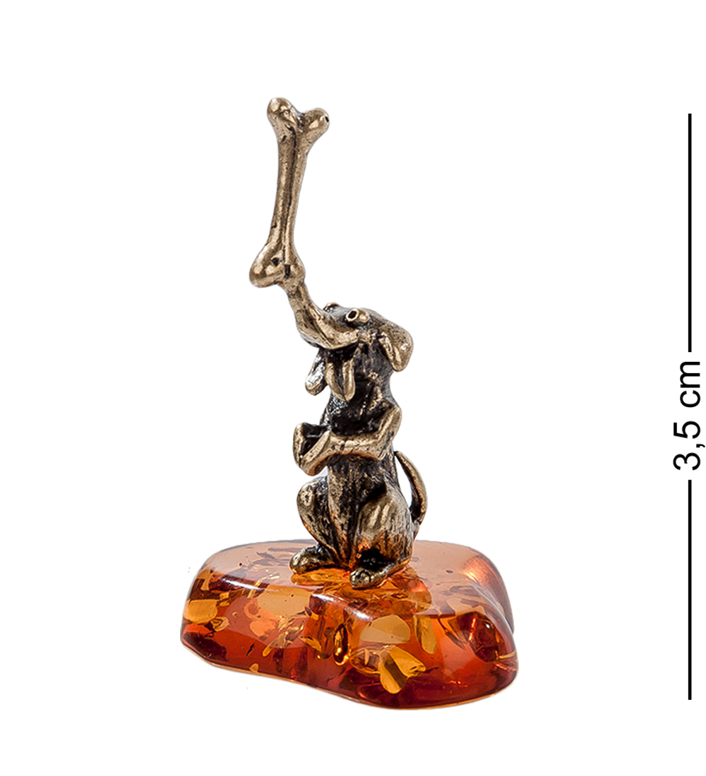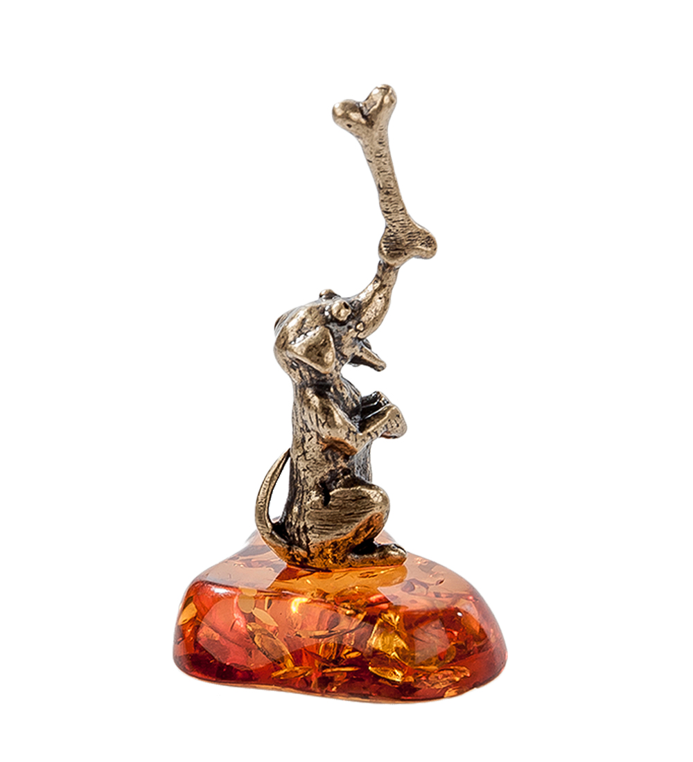Am-559 фигурка собака с косточкой (латунь, янтарь)
