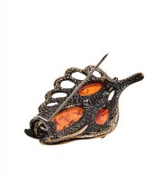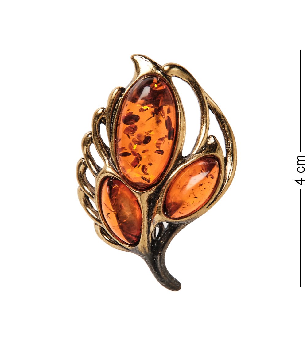 Am-2573 брошь «винтажный листик» (латунь, янтарь)