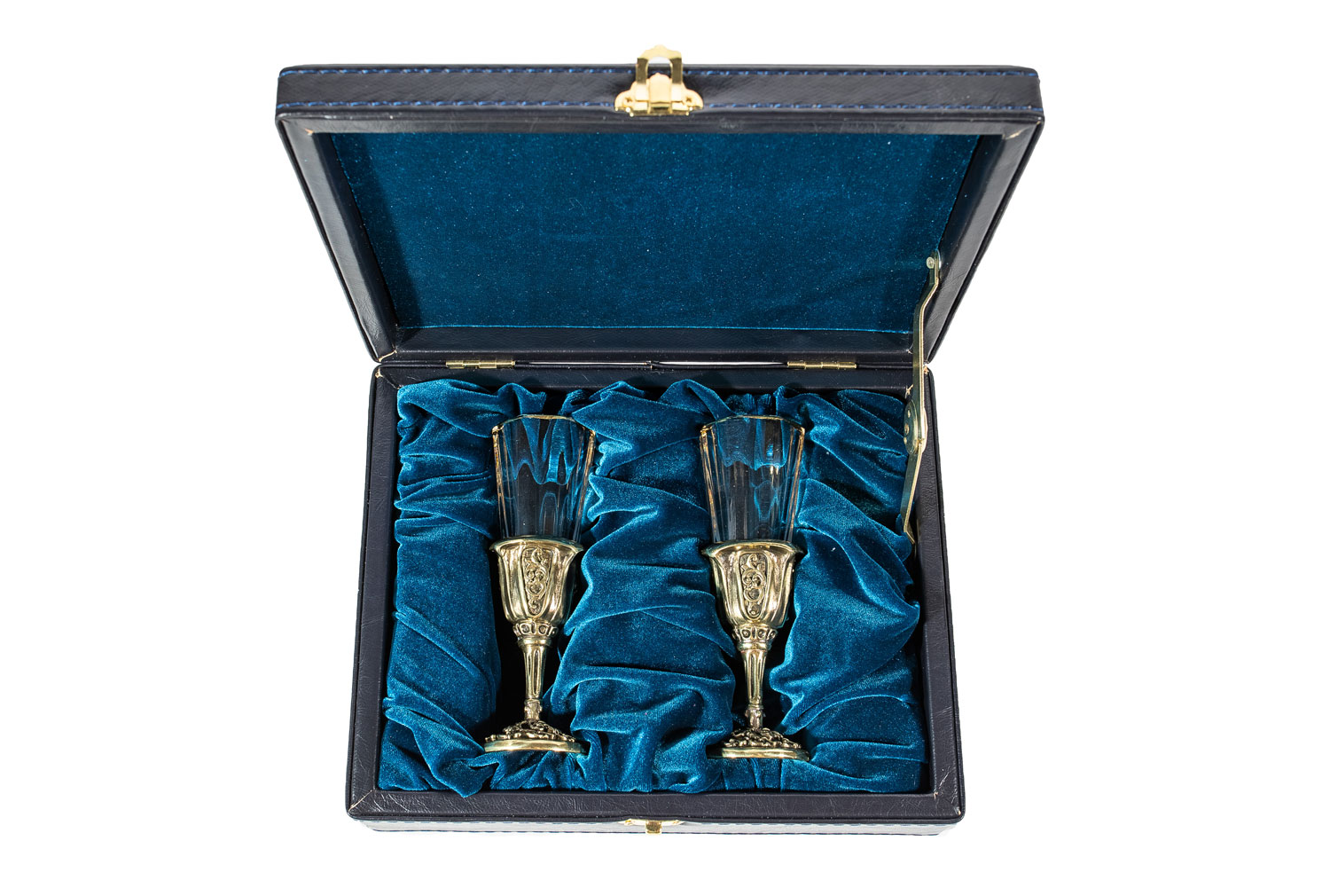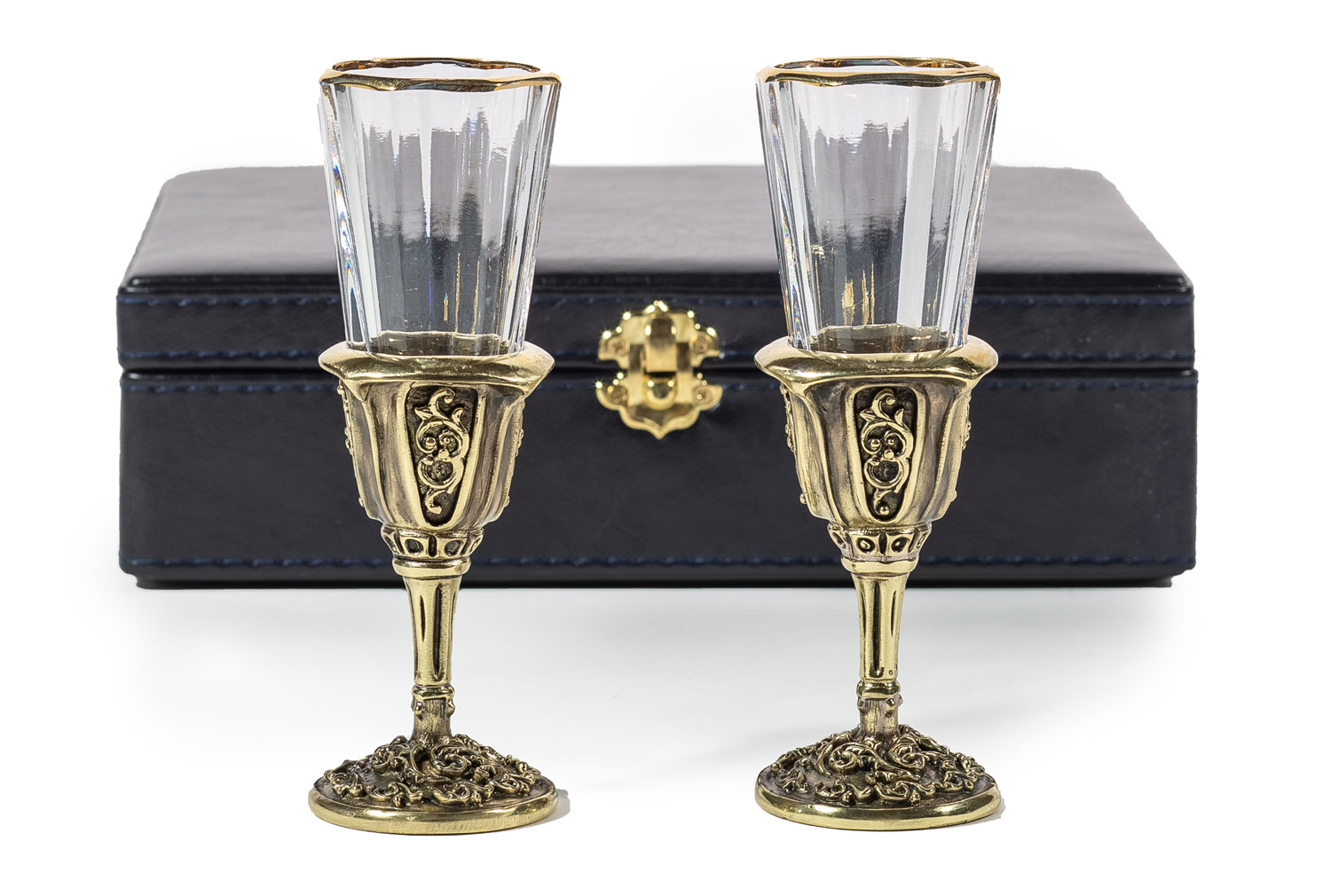 Лафитник грап 2 шт (уп. кожа). Описание: Что может быть универсальней подарка в виде хрустальных водочных рюмок в эксклюзивных лафитниках ручной работы Презент уместен к профессиональному празднику, дню рождения, ко Дню защитника отечества и на новогодние торжества. Престижности набору придает стильная упаковка из кожзаменителя. Метод изготовления:  художественное литье из латуни (ручная работа) Рюмка: Хрусталь, Производитель: Бахметьевский завод, Страна: Россия, Объем: 50 мл  Комплектация:  2 рюмки, основание (латунь) Упаковка:  кож.зам, ложемент: бархат