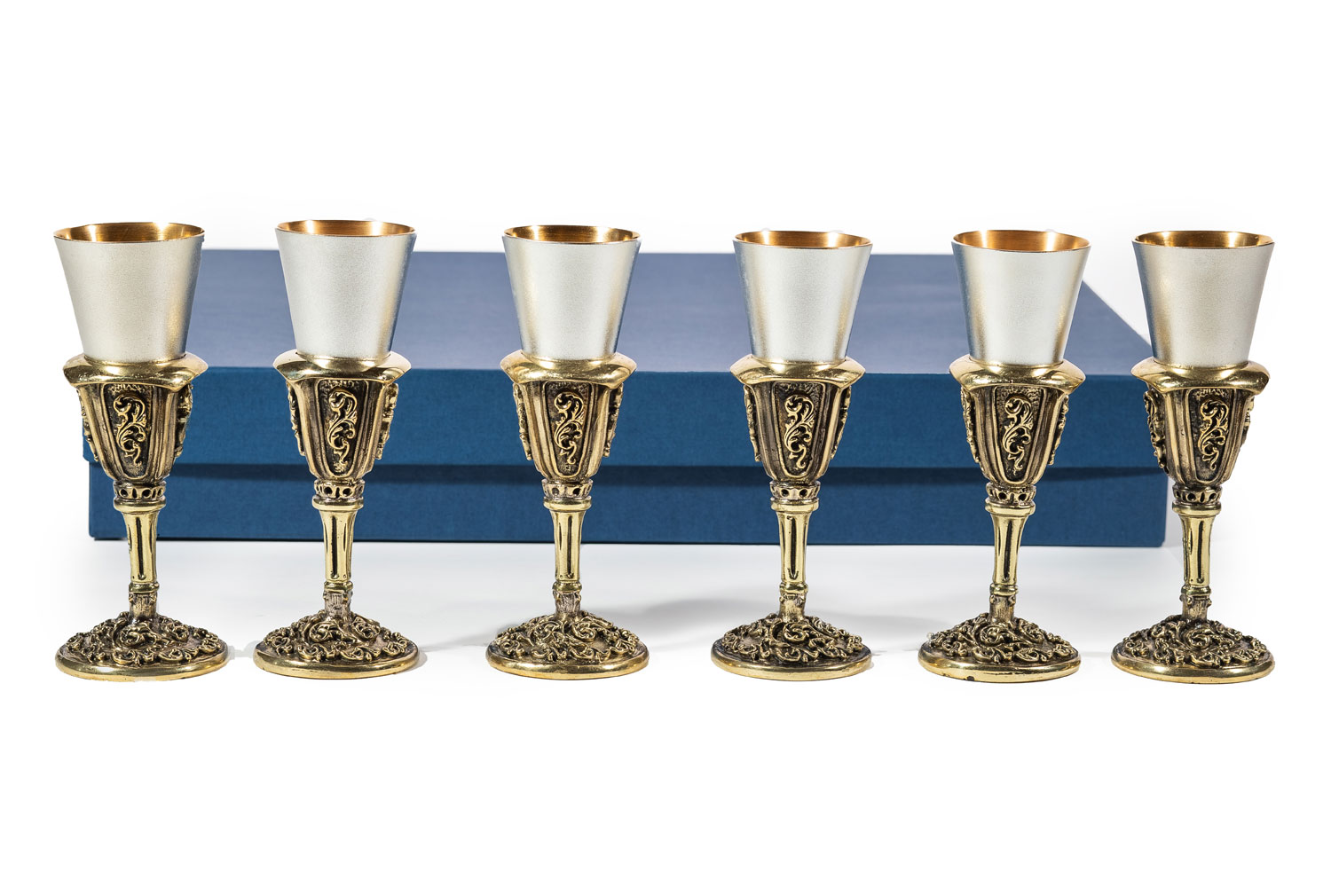 Лафитник грап (мстера) 6 шт. Описание: Прекрасный набор с элементами из серебра и золота – лафитники ручной работы с рюмками для водки, выполненные в стиле настоящего аристократизма. Комплект подойдет в качестве эксклюзивного и престижного презента для настоящих мужчин, обладающих хорошим вкусом и ценящих искусство. Метод изготовления:  художественное литье из латуни (ручная работа) Рюмка: Мельхиор, Производитель: Мстерский Ювелир, Страна: Россия, Объем: 30 мл, Покрытие на 1 изделие: Серебра 2,97г, Золота 0,06г Комплектация:  6 рюмок, основание (латунь), мстера Упаковка:  дизайнерский картон, ложемент: атлас