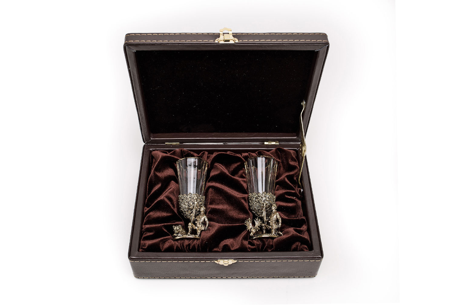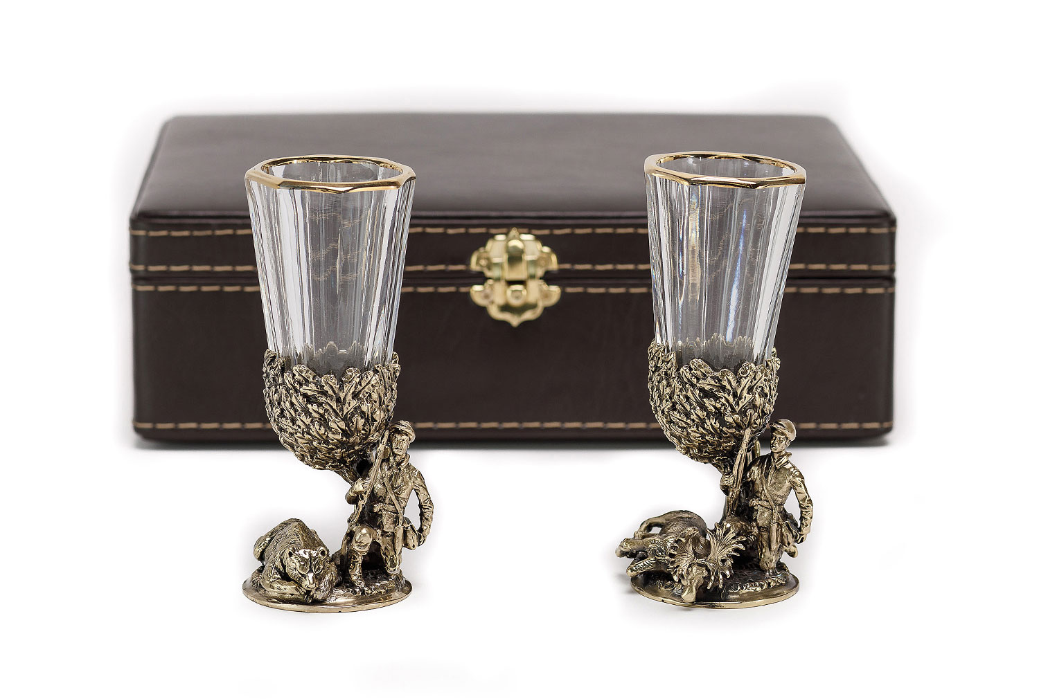 Лафитник охота 2 шт (уп. кожа). Описание: Хотите порадовать охотника красивым подарком Вы на нужной странице! Такому подарку будет рад любой мужчина. Лафитник так и блещет роскошью! Главный козырь этого подарочного набора – ручная работа. А возможность выбрать зверей поможет Вам попасть с подарком в самое сердце! Доступно для заказа 6 вариантов зверей: кабан, медведь, лось, заяц, волк,  утка. Выбрать нужные чарки вы можете указав при оформлении заказа в комментарии Метод изготовления:  художественное литье из латуни (ручная работа) Рюмка: Хрусталь, Производитель: Бахметьевский завод, Страна: Россия, Объем: 50 мл Комплектация:  2 рюмки, основание (латунь) Упаковка:  кож.зам, ложемент: бархат