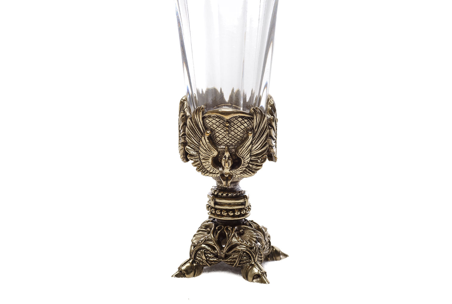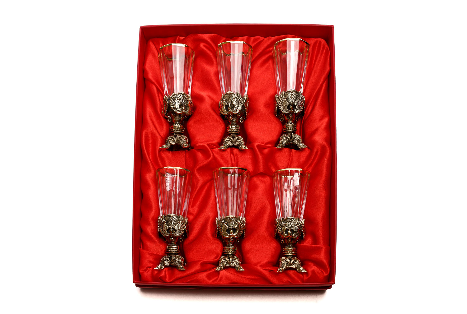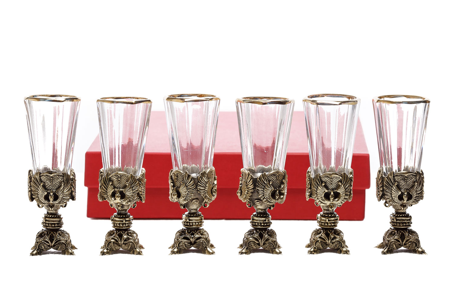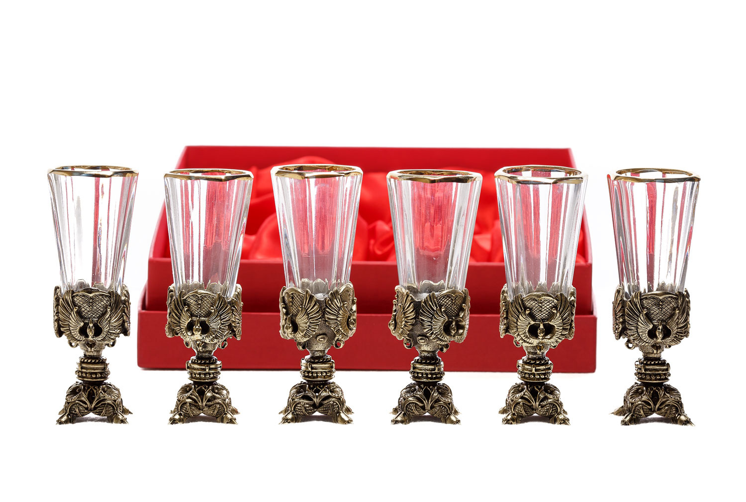 6 рюмок стандартного классического направления, выполненные из латуни и стекла чешского происхождения от марки «Rona» с выделкой ручной художественной работы профессиональных мастеров. Набор внешне оформлен картонной коробкой, обделанной поролоном и дорогим атласным материалом. Все это создаёт эффект ренессансного периода.