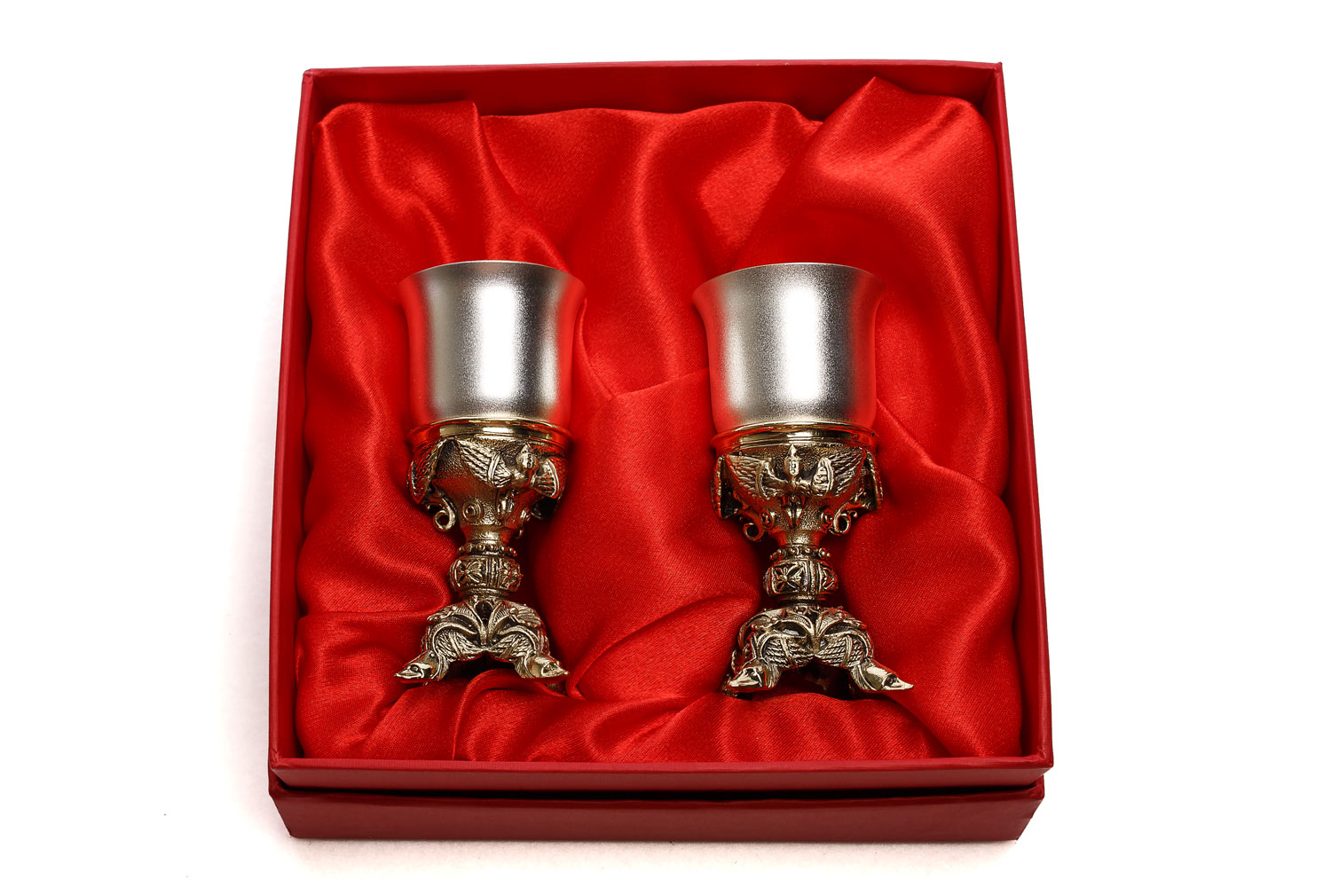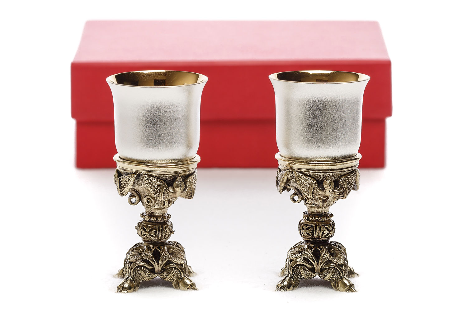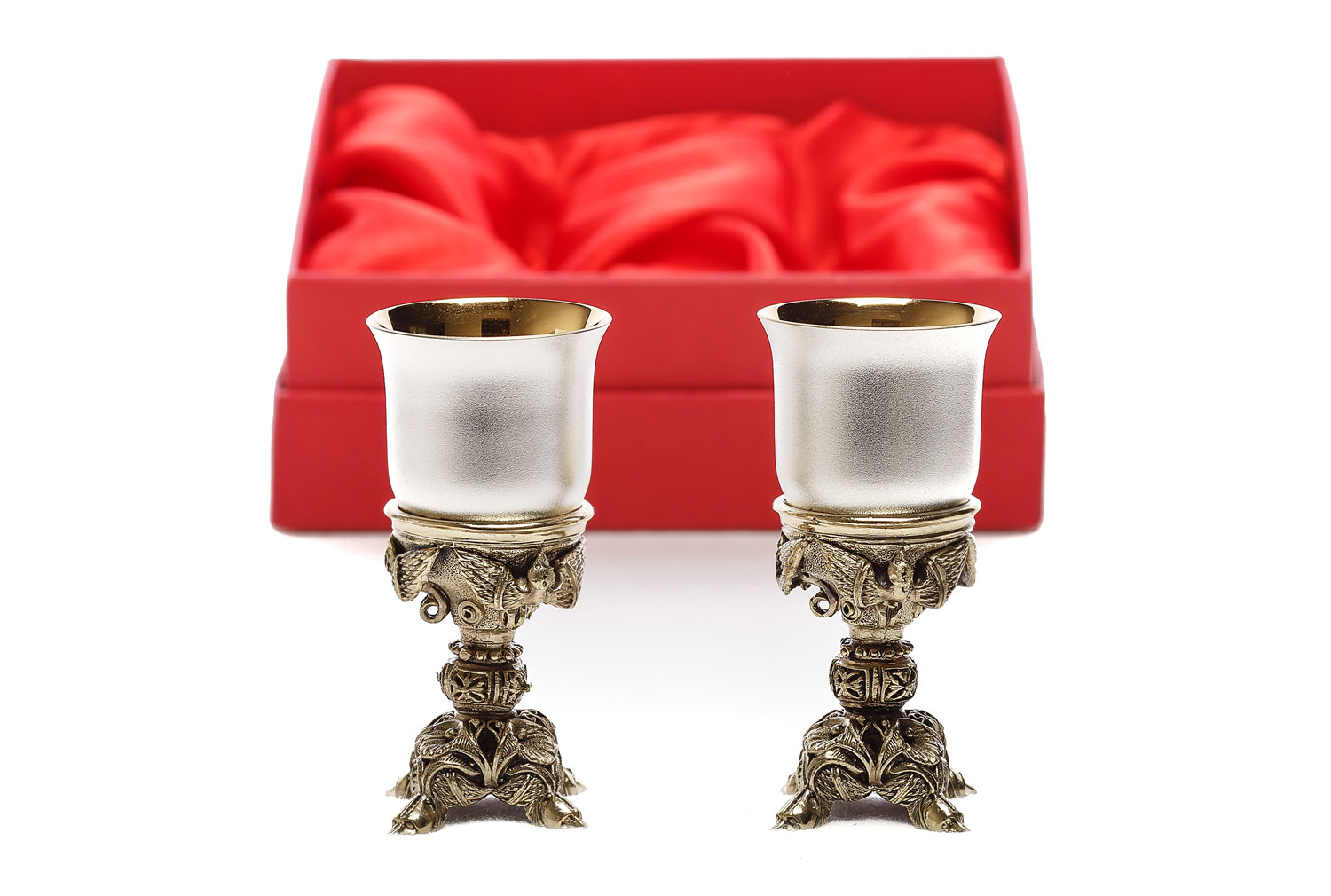 Лафитник классический (мстера) 2 шт. Описание: Эксклюзивные рюмки представлены набором из 2 штук, являются филигранными творения творческих мастеров. Идеально подойдут для подарка ценителю художественных вещей, способному созерцать красоту человеческих созданий, находящему в них глубинный смысл и Вселенную. Метод изготовления:  художественное литье из латуни (ручная работа) Рюмка: Мельхиор, Производитель: Мстерский Ювелир, Страна: Россия, Объем: 30 мл, Покрытие на 1 изделие: Серебра 2,97г, Золота 0,06г Комплектация:  2 рюмки, основание (латунь), мстера Упаковка:  дизайнерский картон, ложемент: атлас