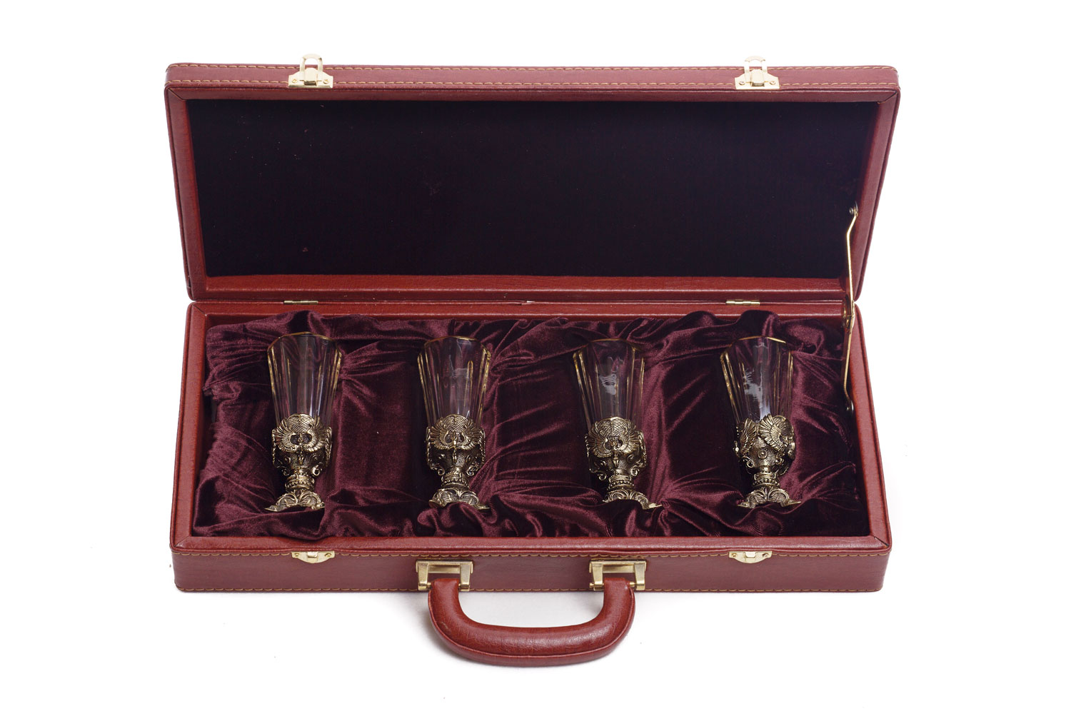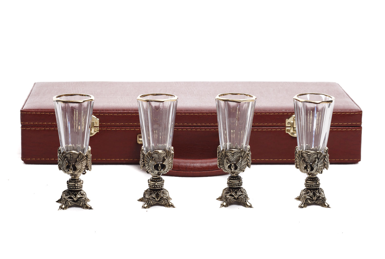Лафитник классический 4 шт (уп. кожа). Описание: В русском языке, классическая рюмка имеет четкое лексическое употребление. Связано это с предметностью обозначения сосуда для крепких алкогольных напитков. Вместимость классических рюмок равна 50-100 гр, исключение – коньячная до 250 мл. На нашем сайте, вы найдете бокалы для вина и чайные наборы.   Метод изготовления:  художественное литье из латуни (ручная работа) Рюмка: Хрусталь, Производитель: Бахметьевский завод, Страна: Россия, Объем: 50 мл  Комплектация: 4  рюмки, основание (латунь) Упаковка:  кож.зам, ложемент: бархат