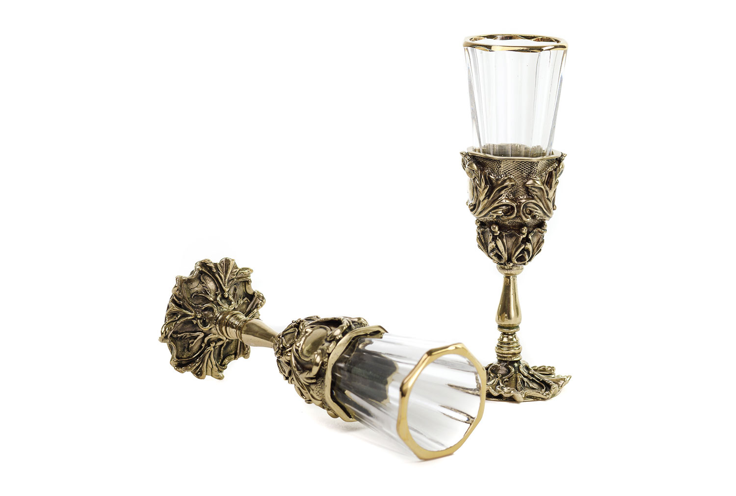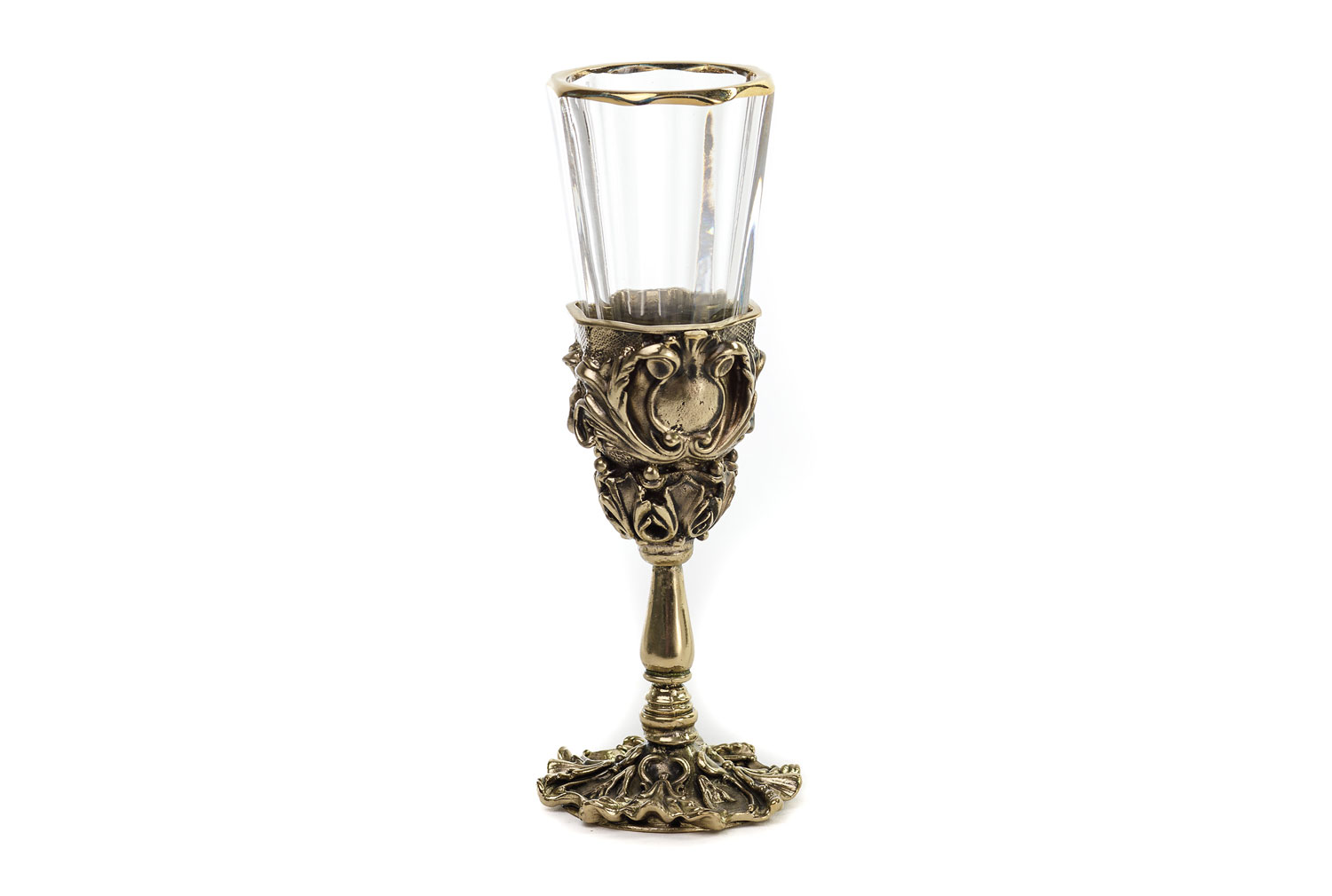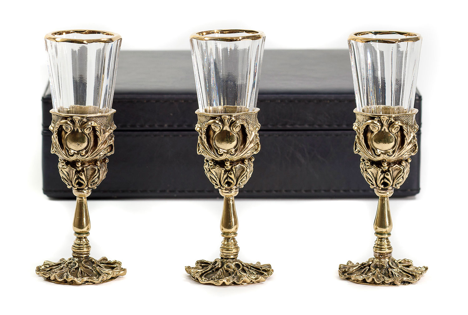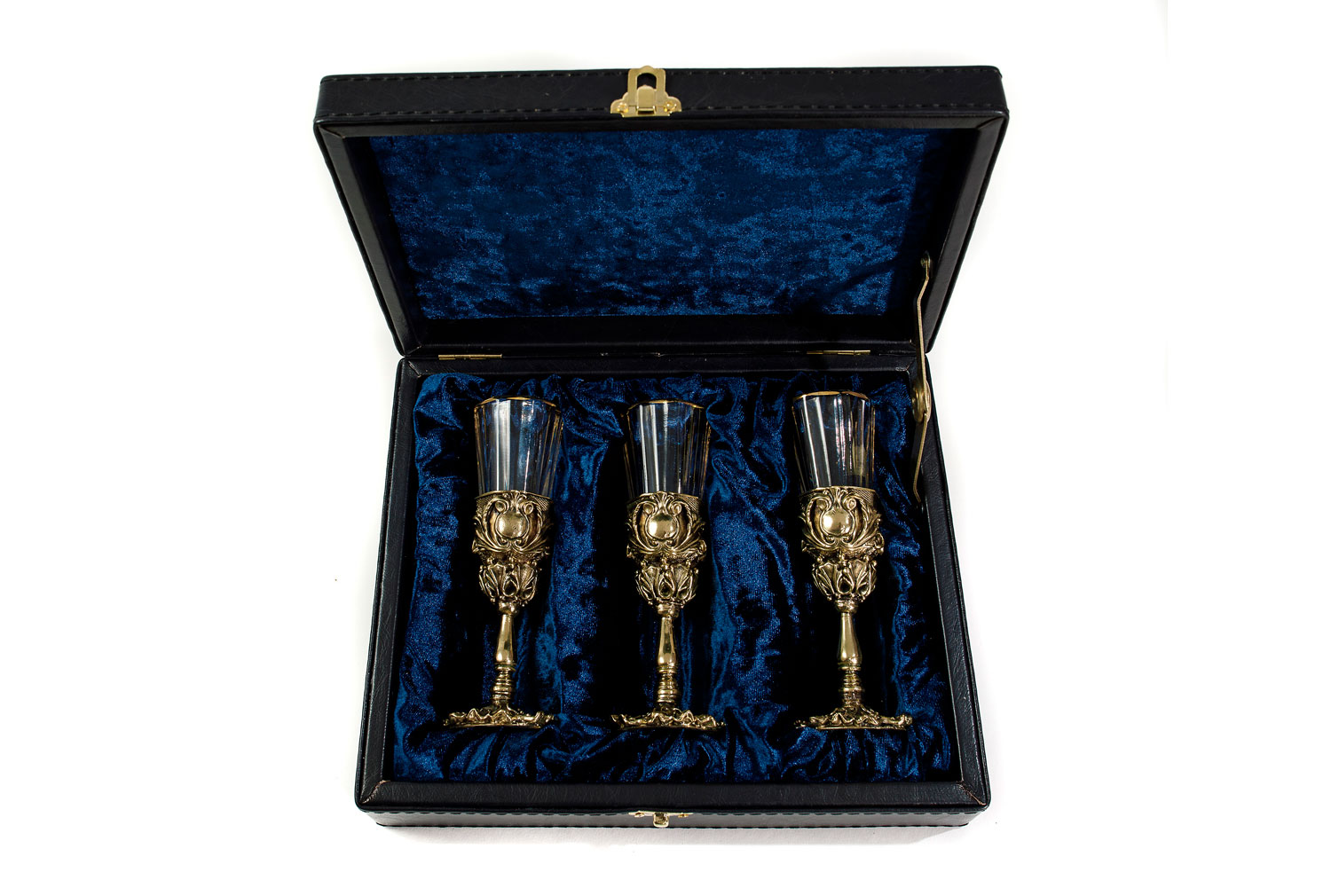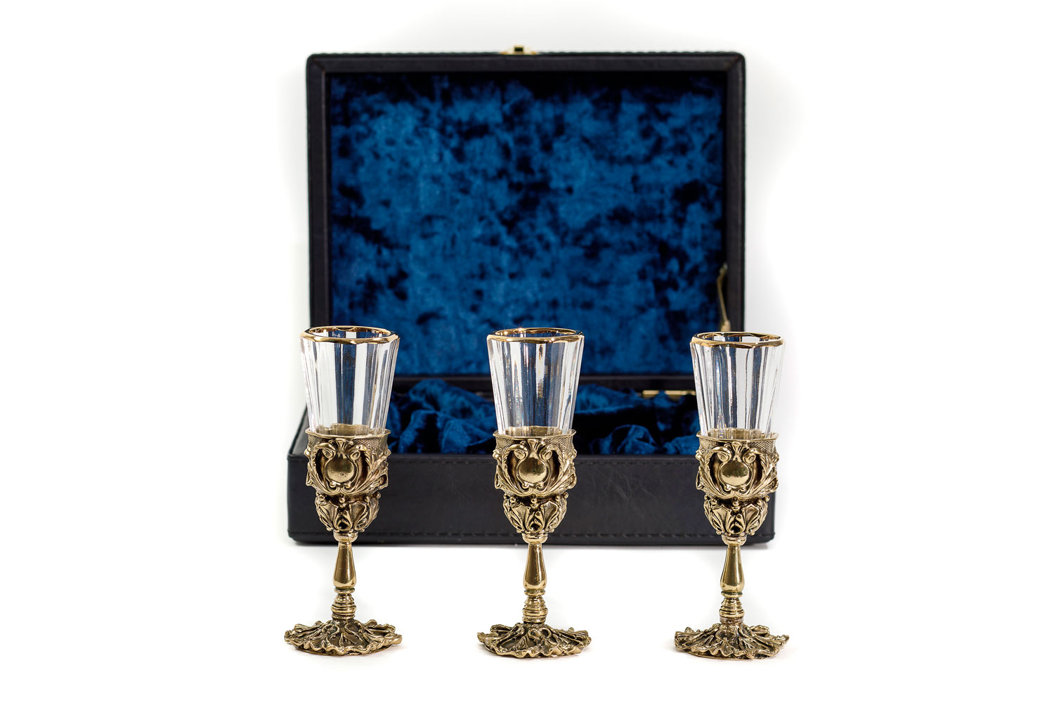 Лафитник барокко 3 шт (уп. кожа). Описание: Подарок должен выбираться от души, поэтому если лично вам нравиться данный набор, то смело покупайте его для близкого человека. Он станет неким связующим между вами и одаряемым. Приходя в гости к нему, вы вместе сможете обсуждать не только насущные проблемы и мечты, но и то, насколько гармонично сочетается данный набор с интерьером и обстановкой в доме. Метод изготовления:  художественное литье из латуни (ручная работа) Рюмка: Хрусталь, Производитель: Бахметьевский завод, Страна: Россия, Объем: 50 мл Комплектация:  3 рюмки, основание (латунь) Упаковка:  кож.зам, ложемент: бархат