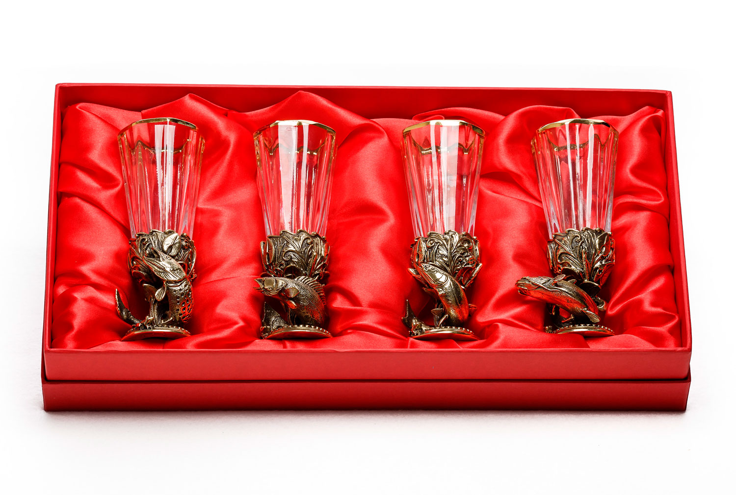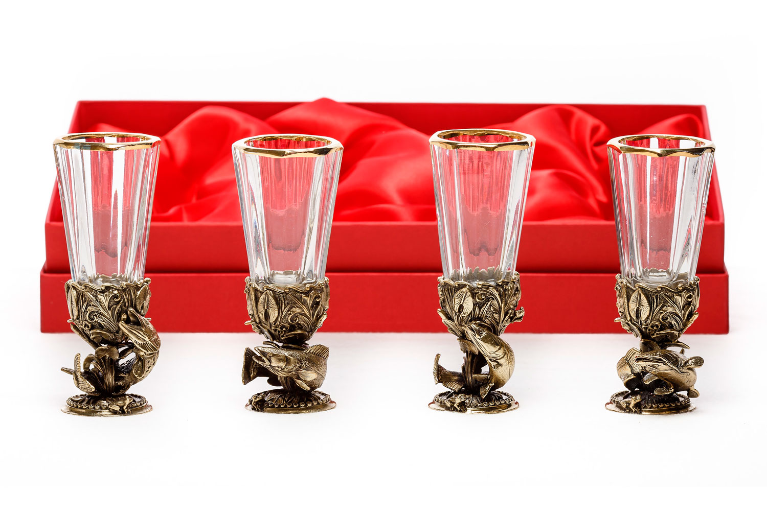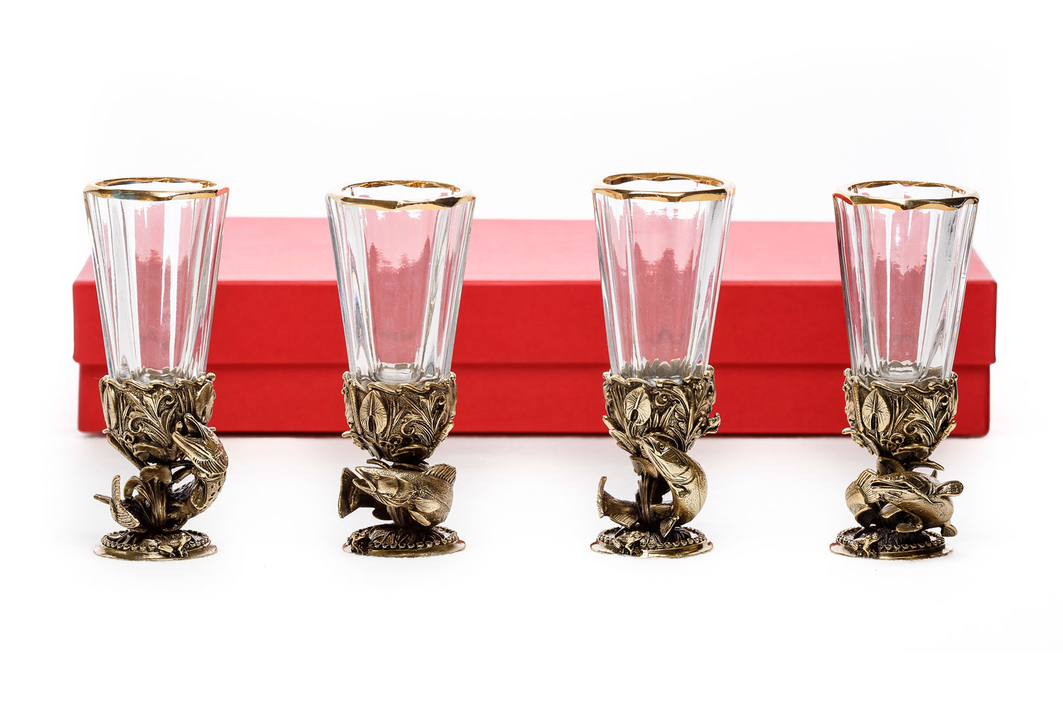 Художественные стопки «Рыбы» формируют набор количеством 4 штуки. Данный товар наделен своеобразным дизайном, характерными формами и линиями стиля барокко. Превосходно подойдет для распивания мужских напитков в небольшой дружной компании.