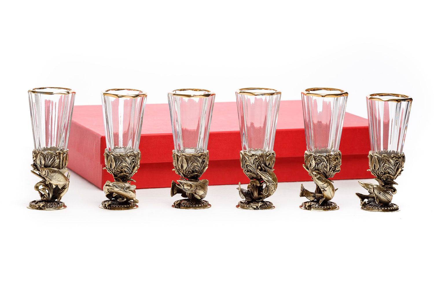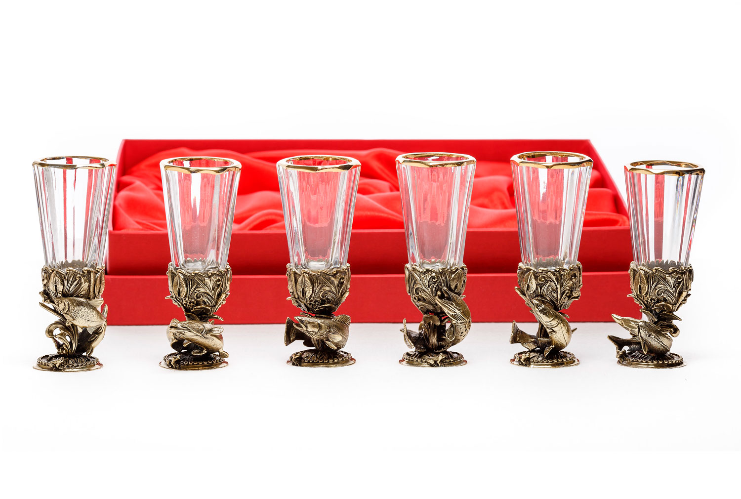 Лафитник рыбы 6 шт. Описание: Набор «Рыбы» являет собой шесть уникальных рюмок, которые выполнены при помощи художественного литья из латуни. Рисунок на ёмкости символизирует богатство, гармонию, положительные эмоции. Он станет оригинальным подарком для настоящего мужчины. Метод изготовления:  художественное литье из латуни (ручная работа) Рюмка: Хрусталь, Производитель: Бахметьевский завод, Страна: Россия, Объем: 50 мл Комплектация:  6 рюмок, основание (латунь) Упаковка:  дизайнерский картон, ложемент: атлас