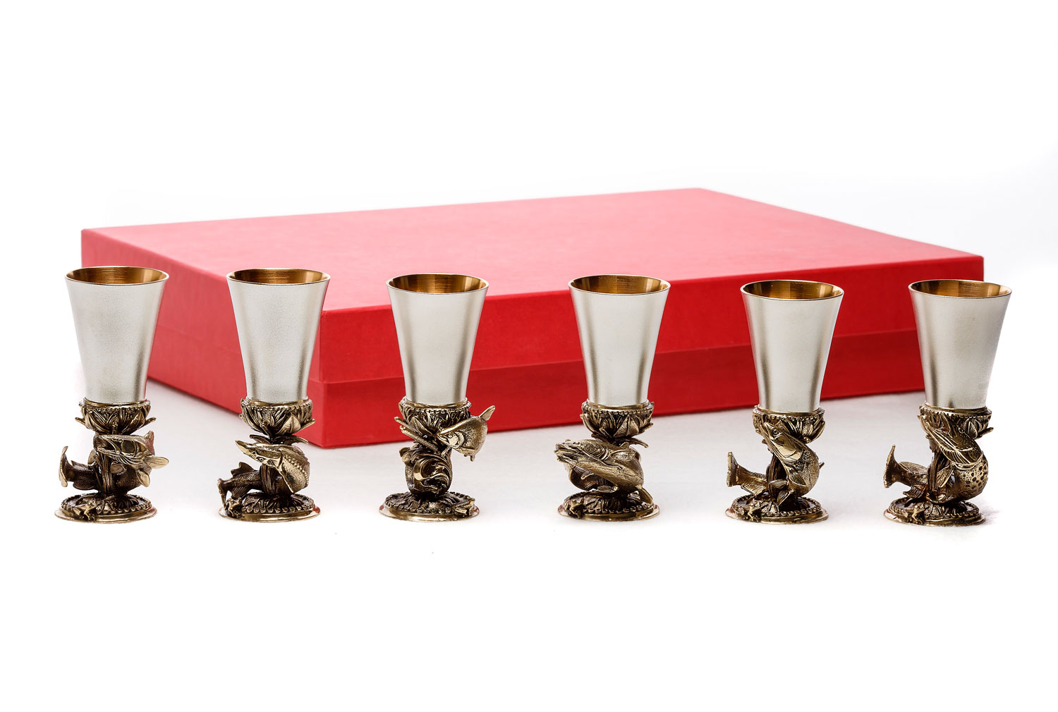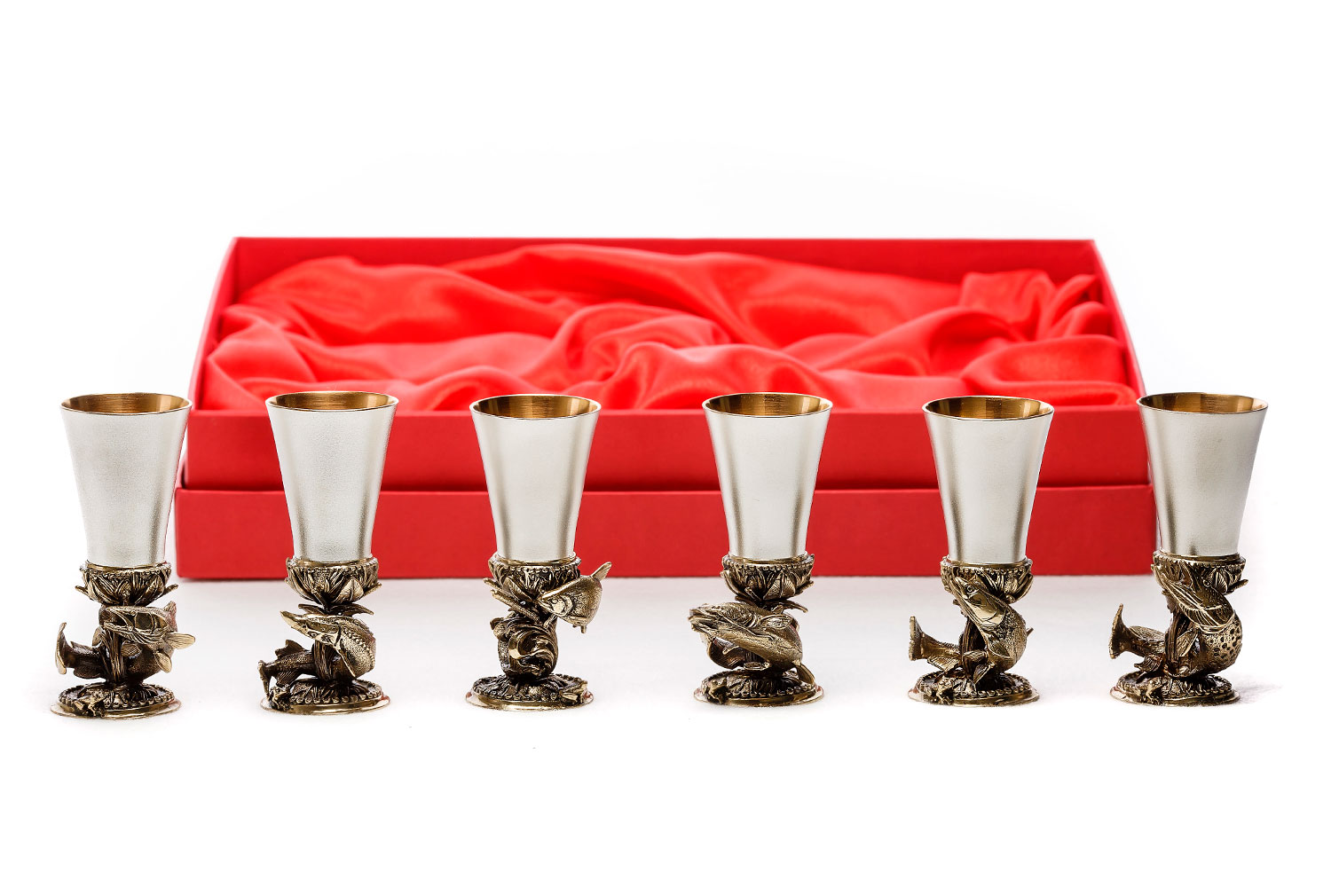 Лафитник рыбы (мстера) 6 шт. Описание: Набор рюмок «Рыба» представлен шестью изделиями художественной, тончайшей работы. Мини-коллекцию преподносят в знак восхищения персоне, которая не только увлекается рыбалкой, а также ловит «сетями» разнообразные жизненные успехи. Метод изготовления:  художественное литье из латуни (ручная работа) Рюмка: Мельхиор, Производитель: Мстерский Ювелир, Страна: Россия, Объем: 30 мл, Покрытие на 1 изделие: Серебра 2,97г, Золота 0,06г  Комплектация:  6 рюмок, основание (латунь), мстера Упаковка:  дизайнерский картон, ложемент: атлас