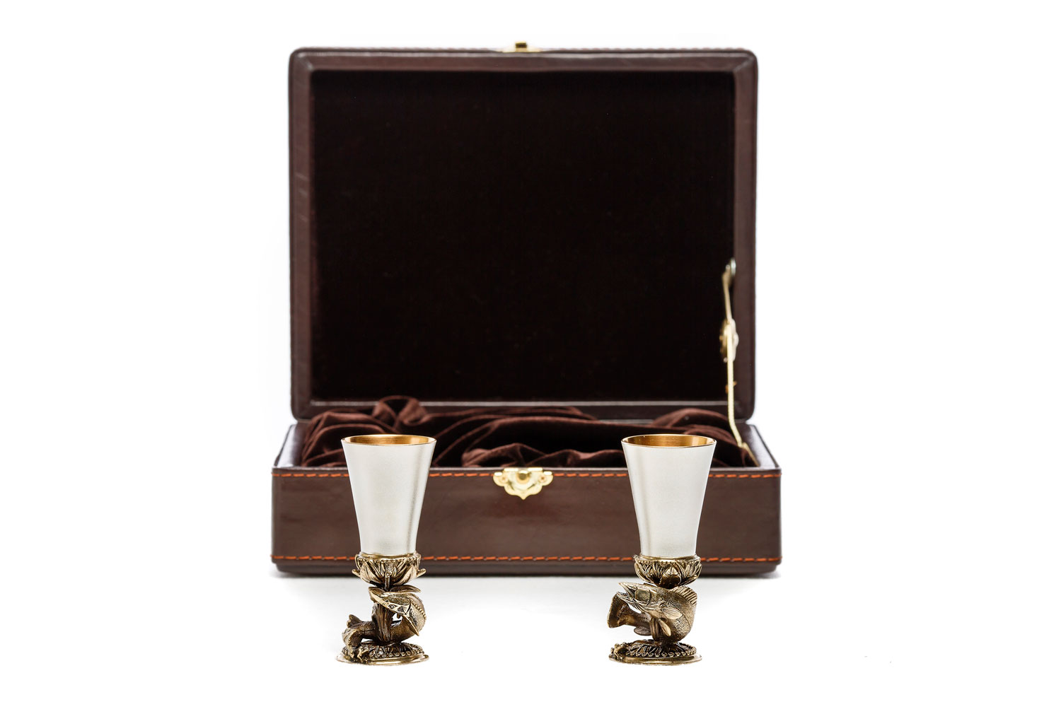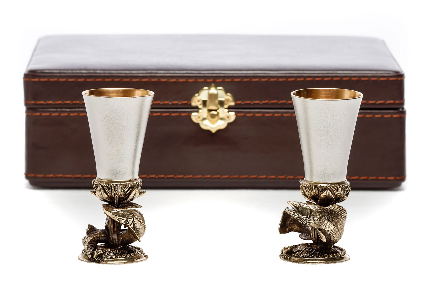 Лафитник рыбы (мстера) 2 шт (уп. кожа). Описание: Данный набор представляет собой сочетание оригинальности, изысканности и многогранности. Рюмки «Рыбы» станут отличным сюрпризом для тех людей, которые смогут оценить использование уникальных материалов. Отличительной характеристикой является то, что дно изготавливается в форме рыбы. Метод изготовления:  художественное литье из латуни (ручная работа) Рюмка: Мельхиор, Производитель: Мстерский Ювелир, Страна: Россия, Объем: 30 мл, Покрытие на 1 изделие: Серебра 2,97г, Золота 0,06г  Комплектация:  2 рюмки, основание (латунь), мстера Упаковка:  кож.зам, ложемент: бархат