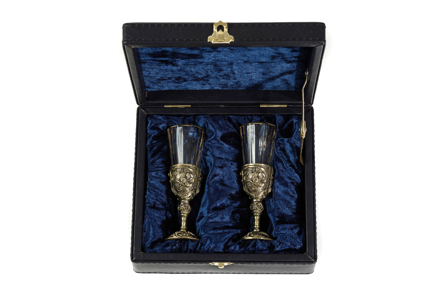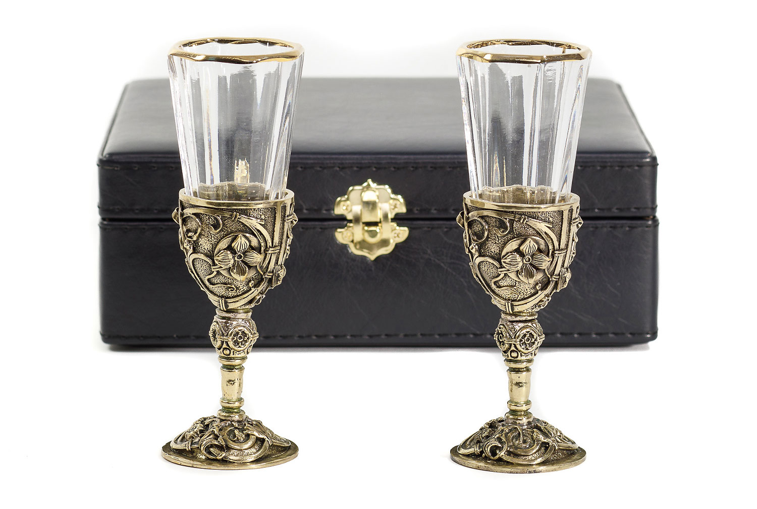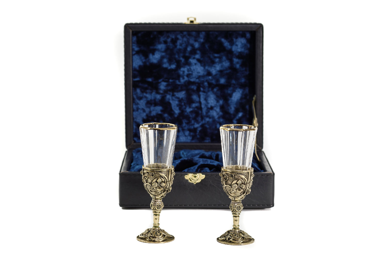 Лафитник цветок 2 шт (уп. кожа). Описание: Если обращаться к истории, то впервые данное название было упомянуто в конце 19 века. Сегодня, такой вариант названия рюмки используется редко, но появление на столе конусообразного, высокого сосуда под красное вино вызывает непреодолимый восторг и удивление. Изящная ножка, сделанная по индивидуальному проекту, тонкое чешское стекло – разве не о таком подарке мечтает каждая современная хозяйка Метод изготовления:  художественное литье из латуни (ручная работа) Рюмка: Хрусталь, Производитель: Бахметьевский завод, Страна: Россия, Объем: 50 мл  Комплектация:  2 рюмки, основание (латунь) Упаковка:  кож.зам, ложемент: бархат