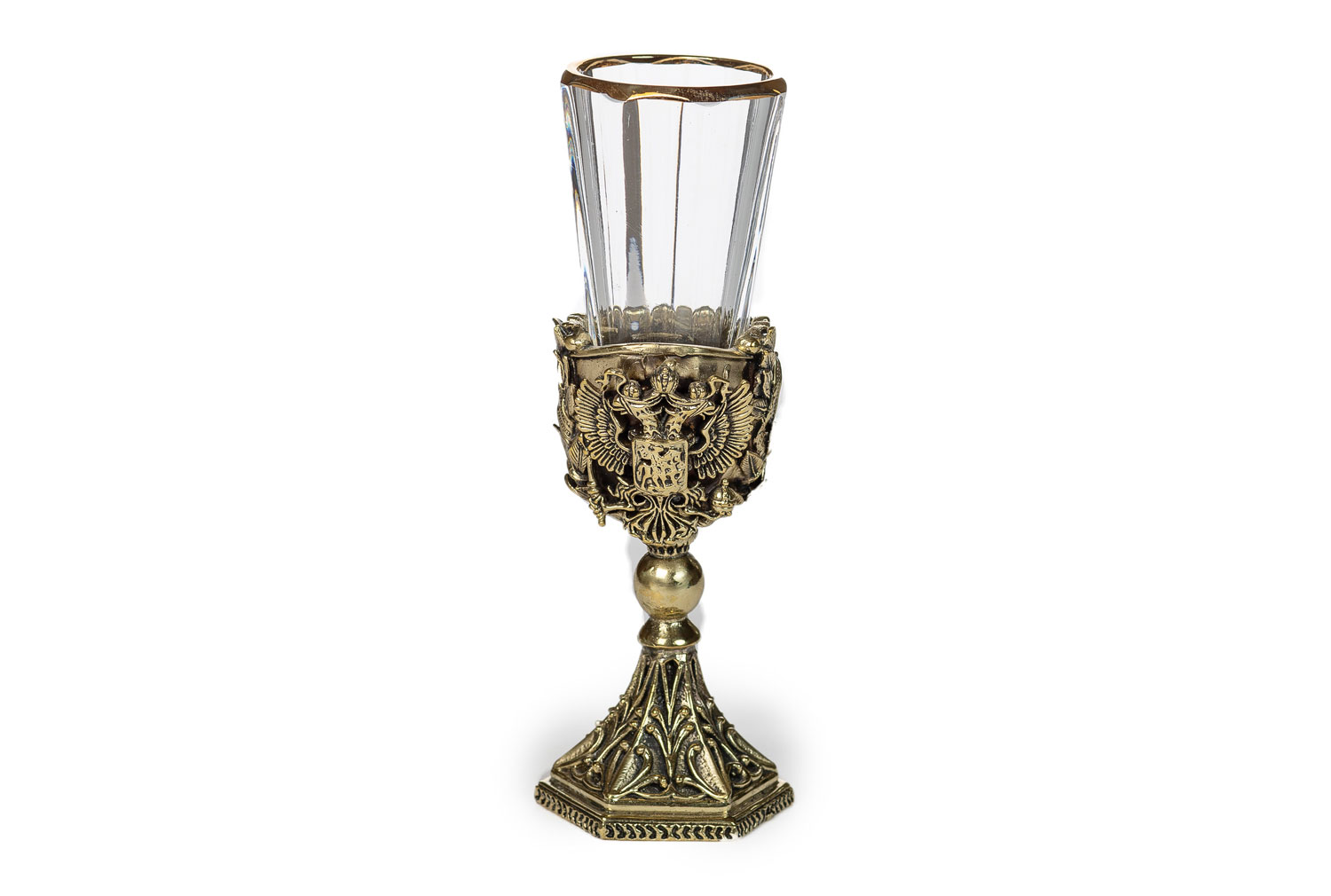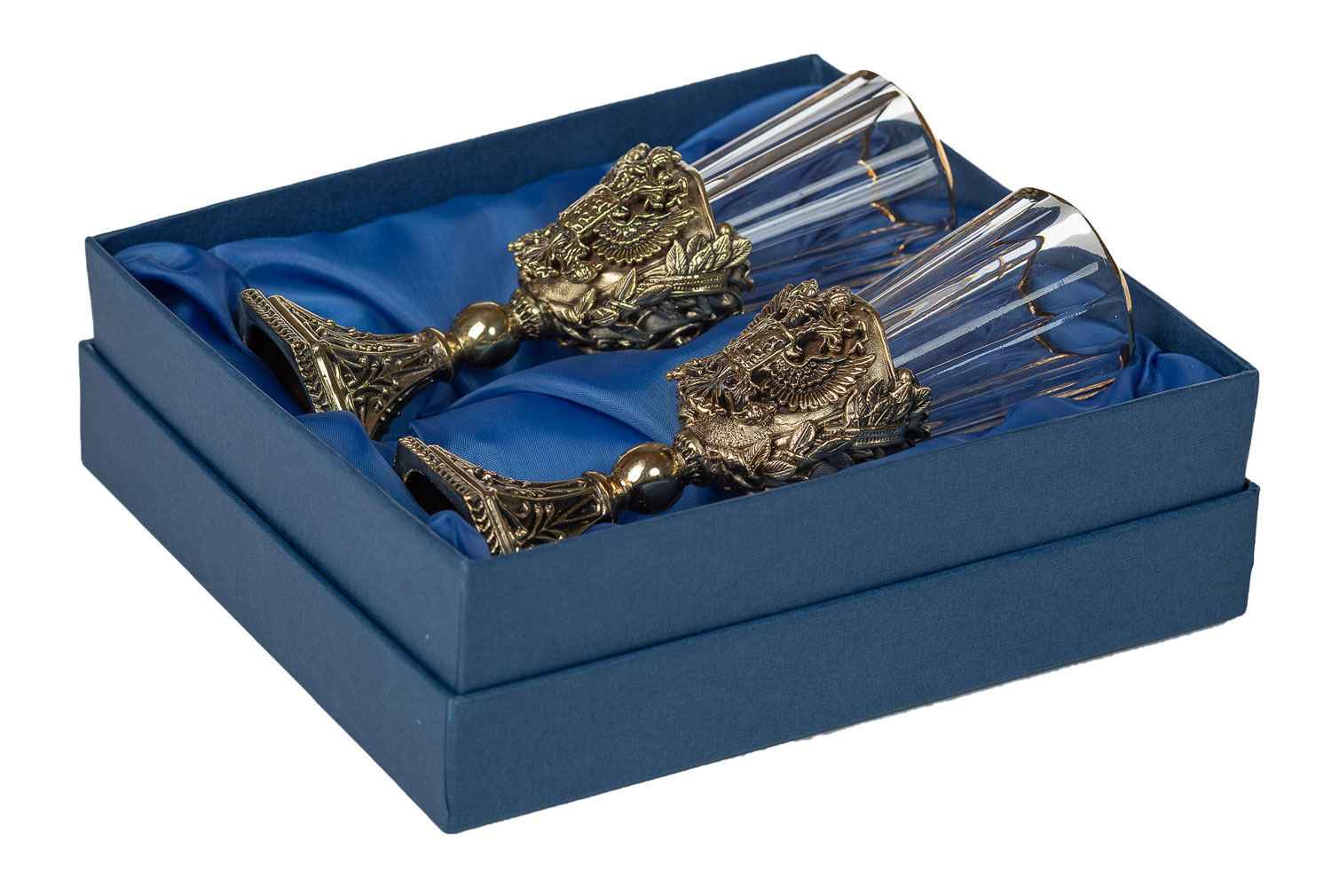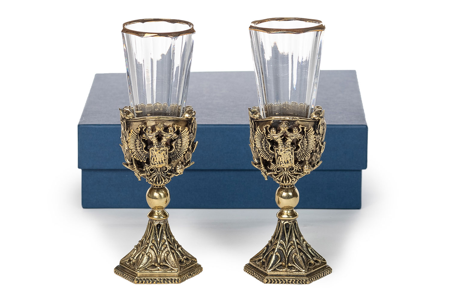 Лафитник герб объемный 2 шт. Метод изготовления:  художественное литье из латуни (ручная работа) Рюмка: Хрусталь, Производитель: Бахметьевский завод, Страна: Россия, Объем: 50 мл Комплектация:  2 рюмки, основание (латунь) Упаковка:  дизайнерский картон, ложемент: атлас
