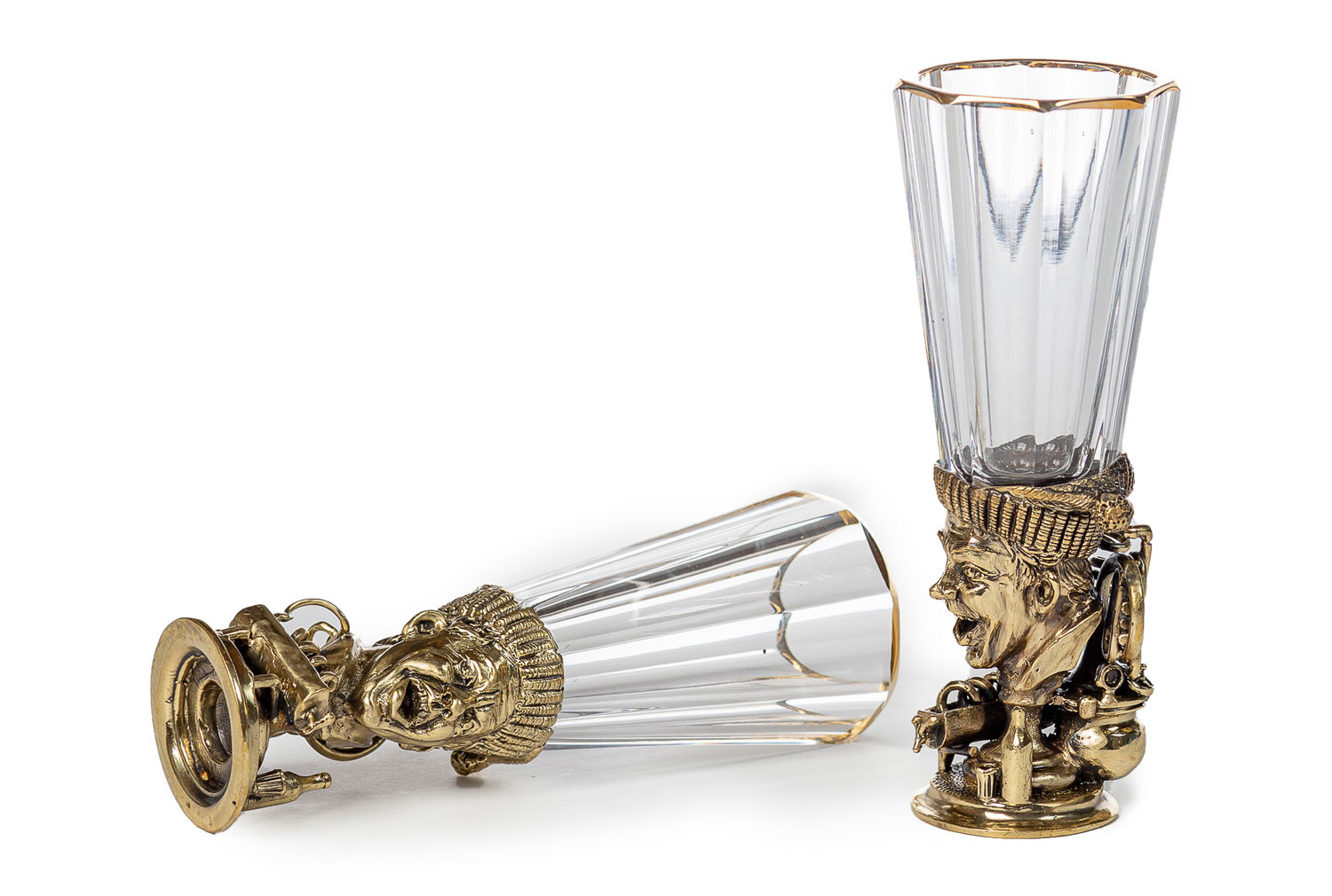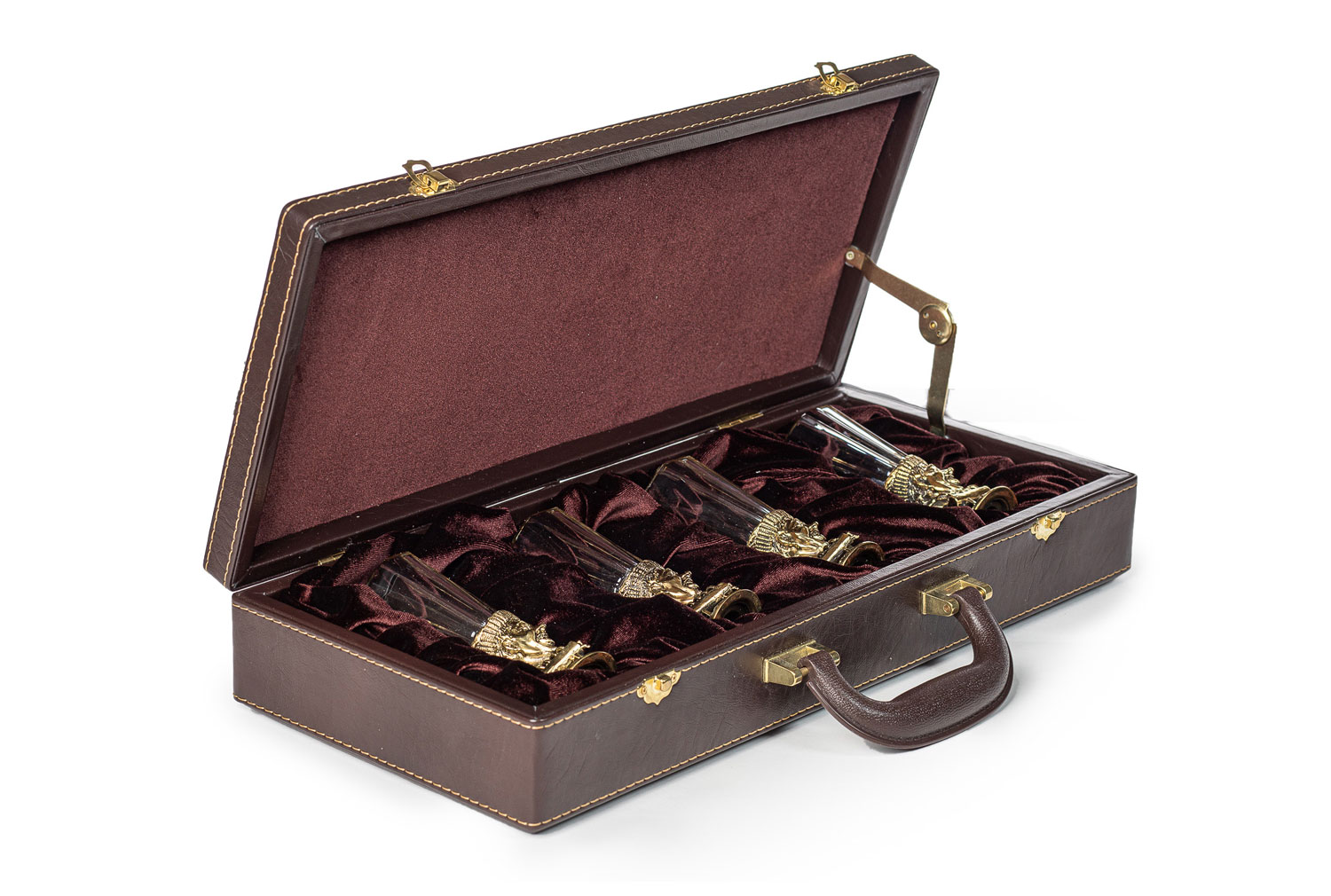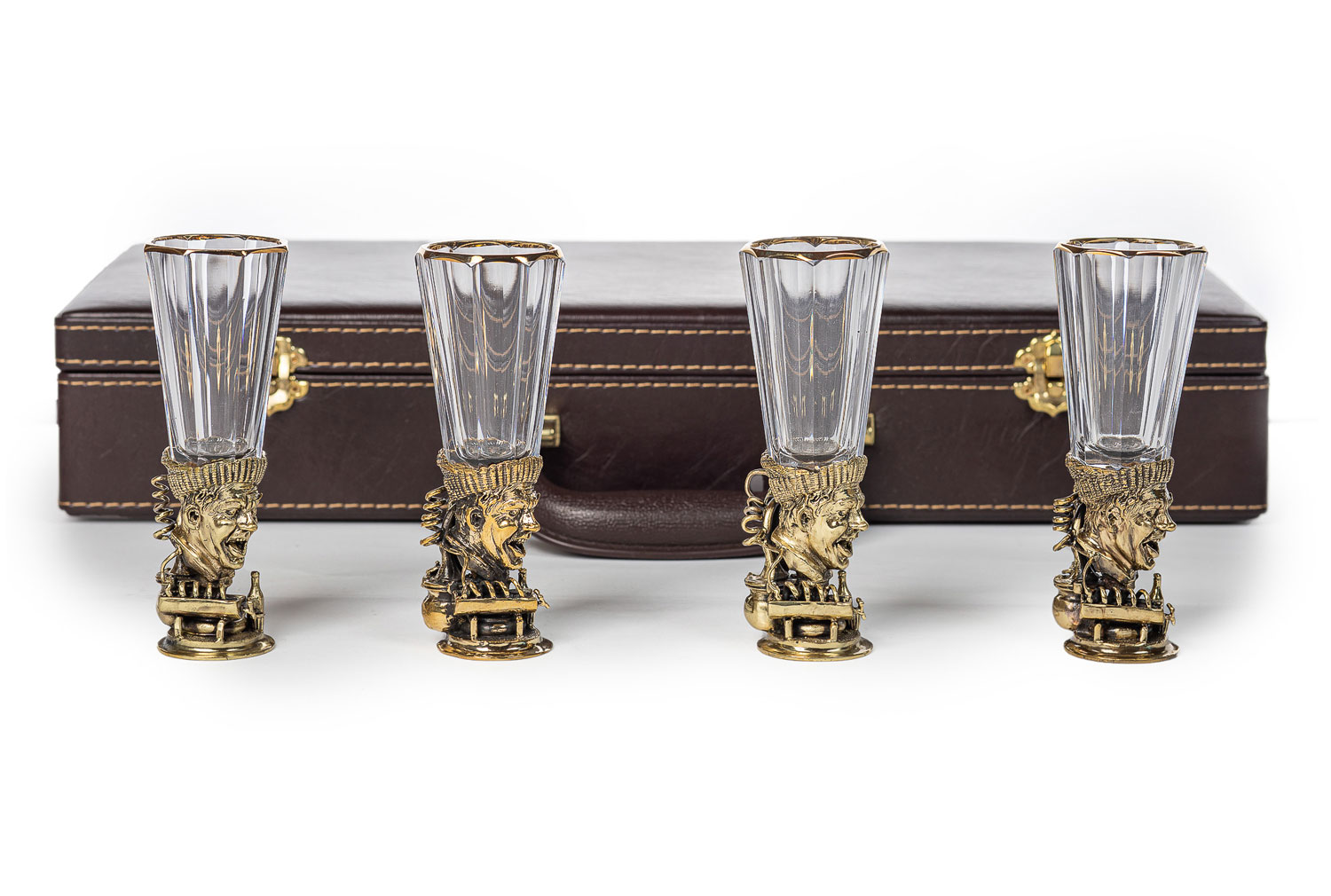 Лафитник самогонщик 4 шт (уп. кожа). Метод изготовления:  художественное литье из латуни (ручная работа) Рюмка: Хрусталь, Производитель: Бахметьевский завод, Страна: Россия, Объем: 50 мл  Комплектация:  4 рюмки, основание (латунь) Упаковка:  кож.зам, ложемент: бархат