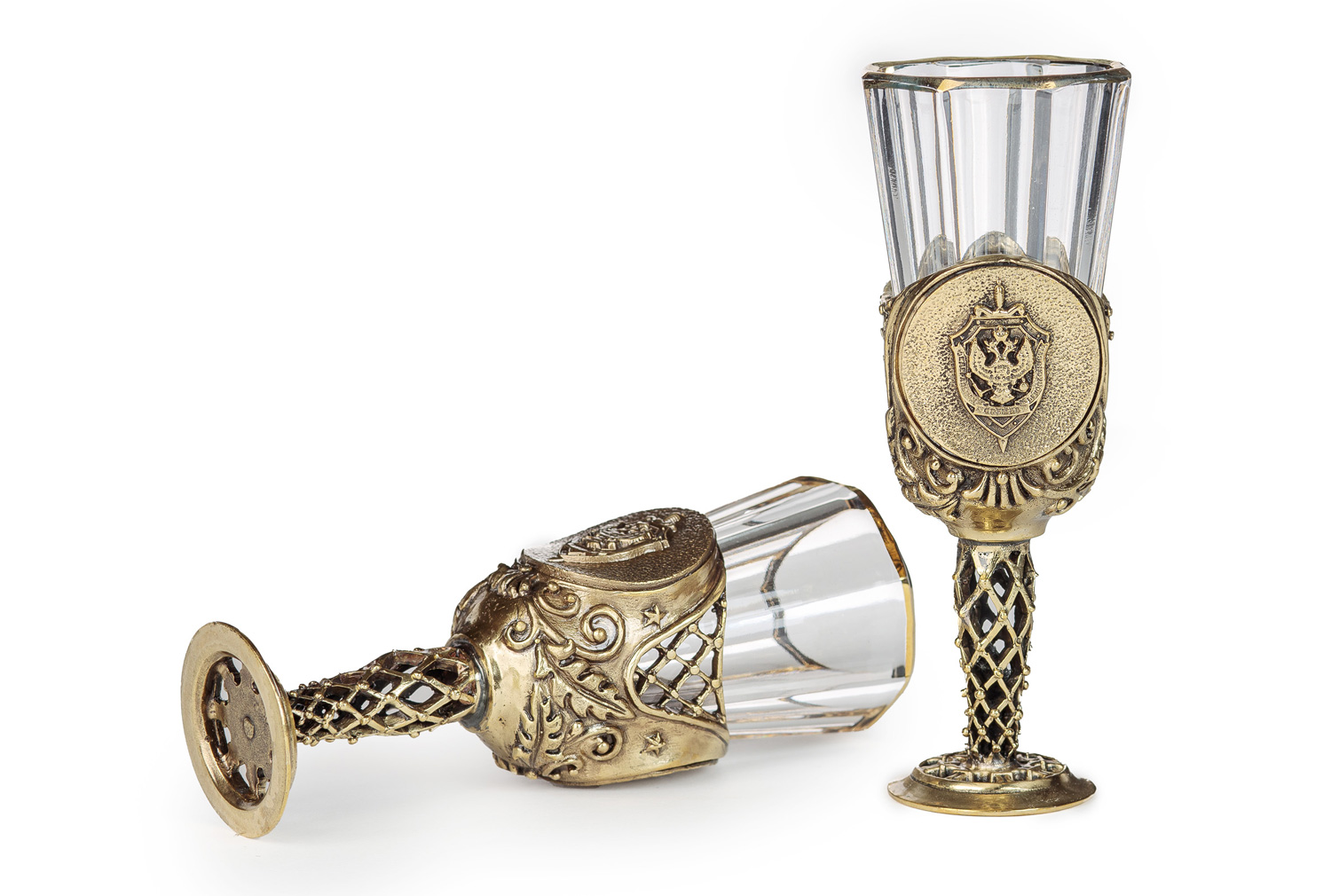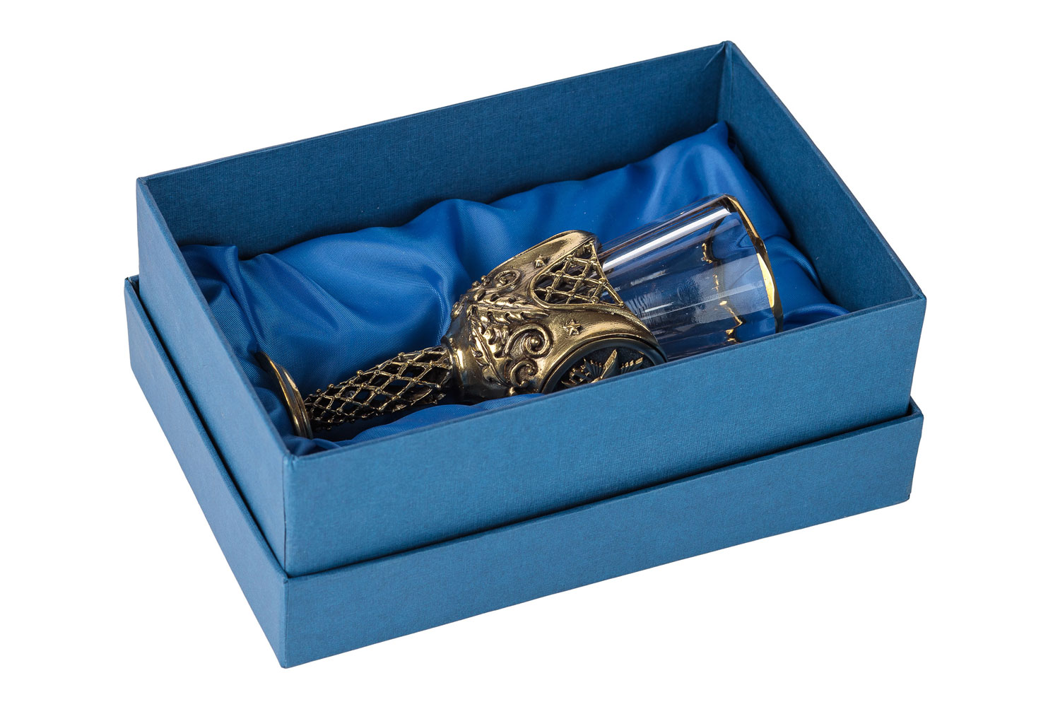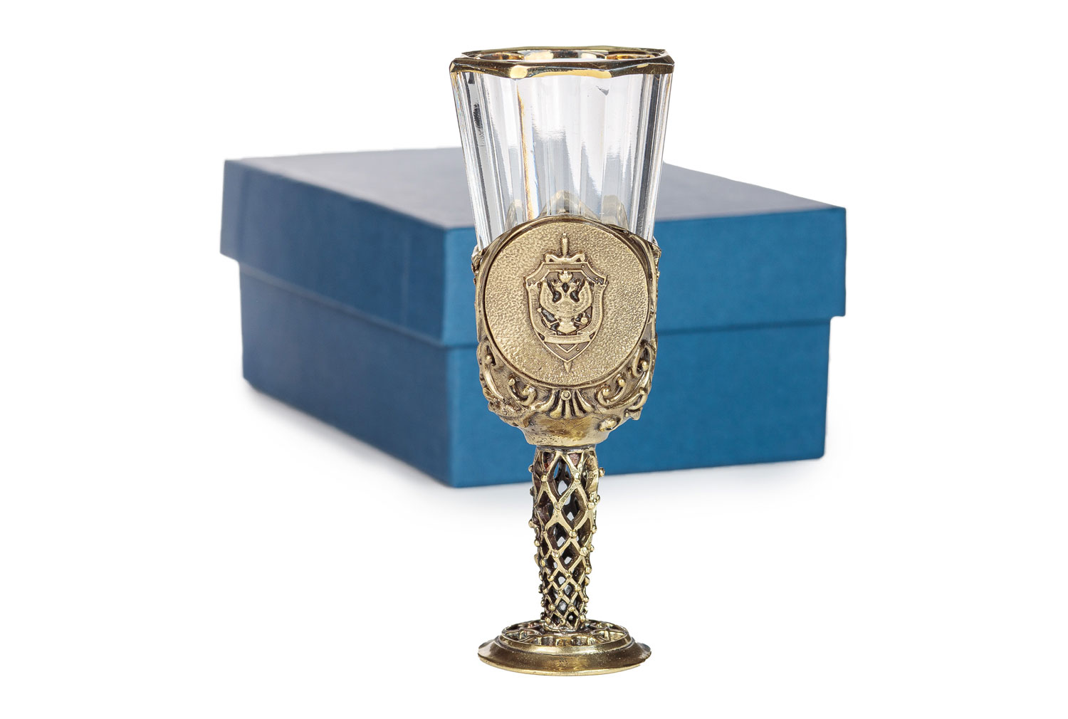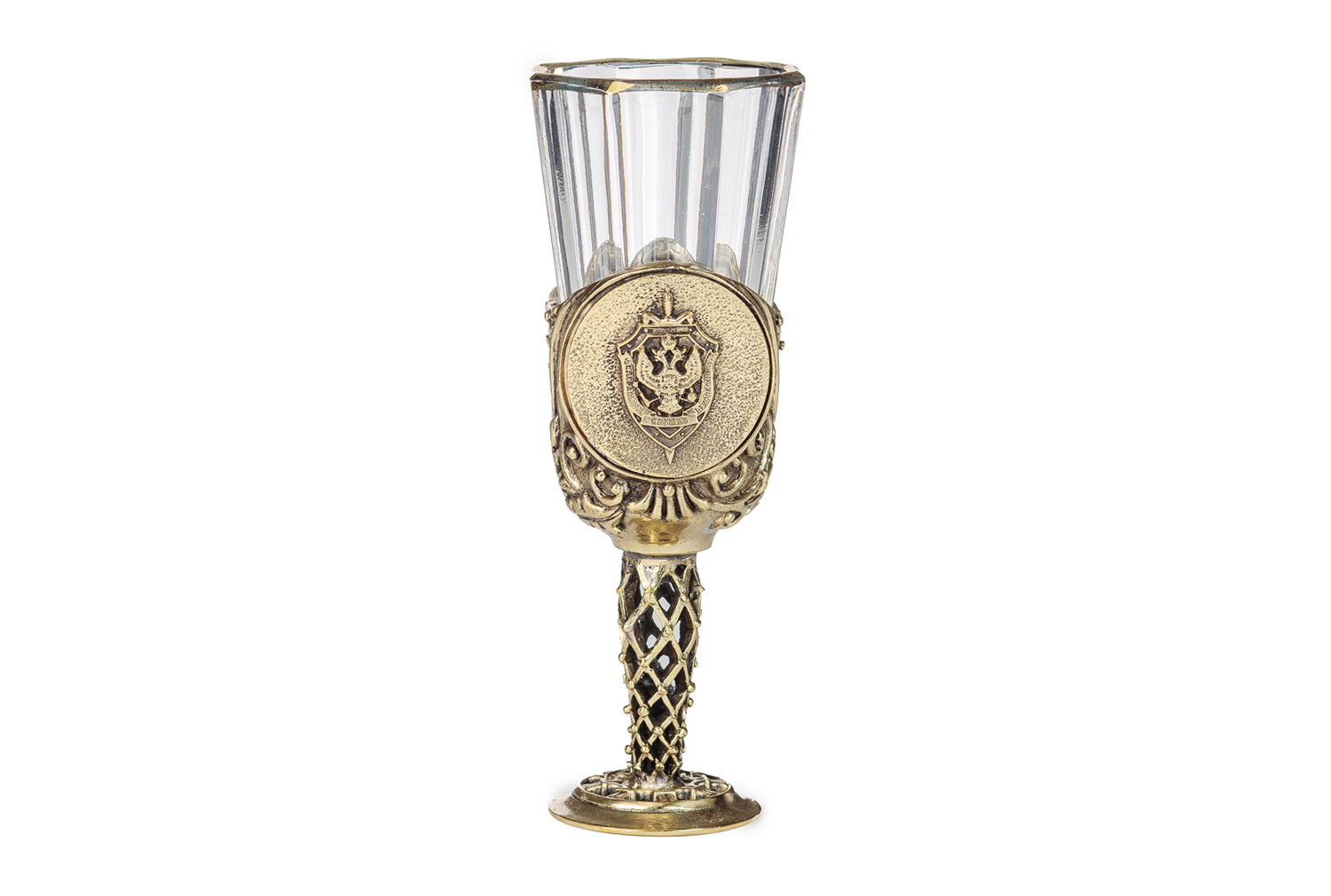 Лафитник фсб 1 шт. Метод изготовления: nbsp художественное литье из латуни (ручная работа) Рюмка: Хрусталь, Производитель: Бахметьевский завод, Страна: Россия, Объем: 50 мл nbsp Комплектация: nbsp 1 рюмка, основание (латунь) Упаковка: nbsp дизайнерский картон, ложемент: атлас