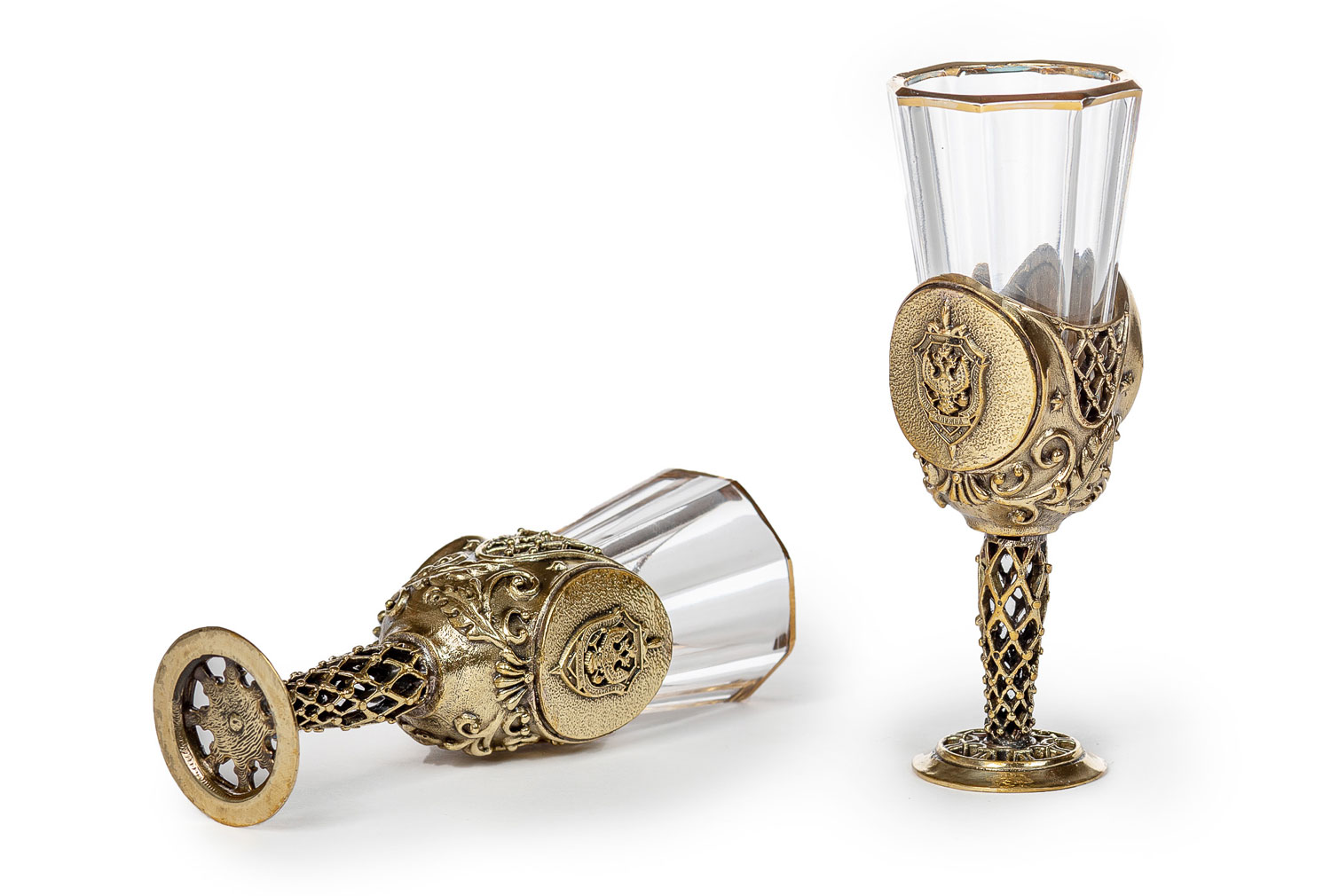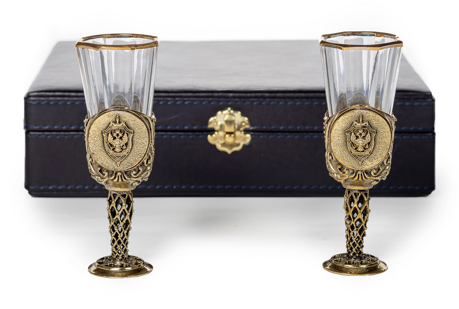 Лафитник фсб 2 шт (уп. кожа). Описание: nbsp Изысканные, утонченные, сделанные из хрусталя, лафитники станут прекрасным подарком для любого мужчины. Особенно для того, кто служит в ФСБ. Значок ФСБ изготовлен художественным литьем из латуни и изображен на ножке рюмки. Два лафитника можно приобрести в упаковке из кожзама. nbsp Метод изготовления: nbsp художественное литье из латуни (ручная работа) Рюмка: Хрусталь, Производитель: Бахметьевский завод, Страна: Россия, Объем: 50 мл nbsp Комплектация: nbsp 2 рюмки, основание (латунь) Упаковка: nbsp кож.зам, ложемент: бархат