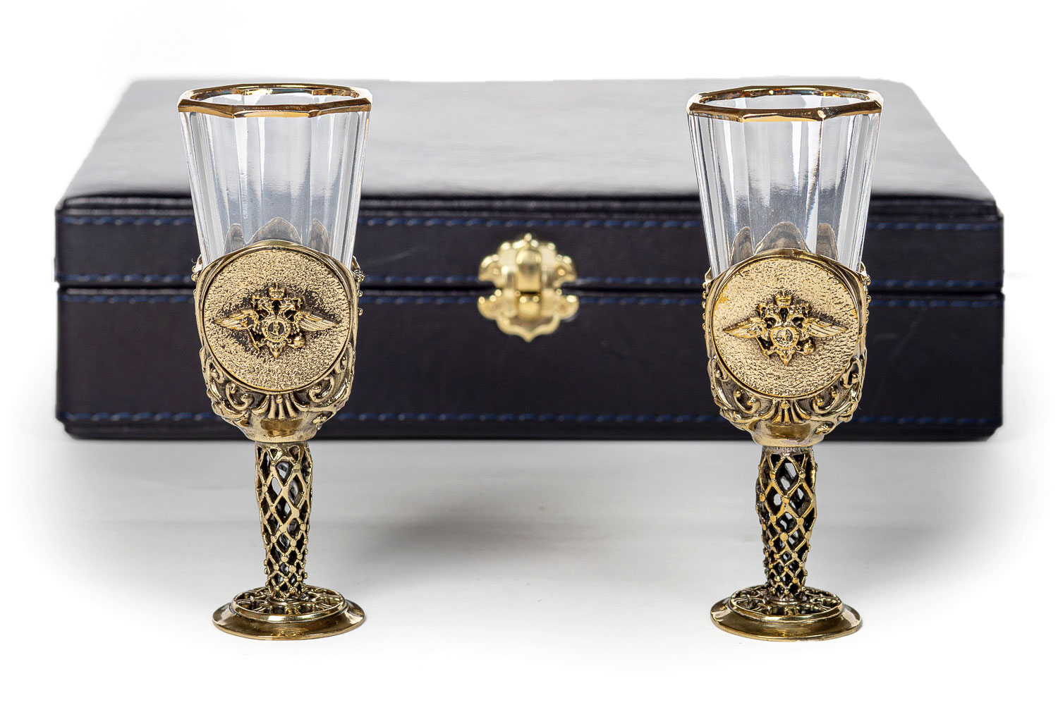 Лафитник мвд 2 шт (уп. кожа). Описание: Министерство внутренних дел - орган власти, который вызывает у всех доверие и в какой-то степени даже страх. Работают там настоящие профессионалы, люди серьезные и ответственные. Потому и подарки дарить им нужно соответствующие. Чемоданчик из кожзама с двумя хрустальными лафитниками. На ножках - знак МВД России. nbsp Метод изготовления: nbsp художественное литье из латуни (ручная работа) Рюмка: Хрусталь, Производитель: Бахметьевский завод, Страна: Россия, Объем: 50 мл nbsp Комплектация: nbsp 2 рюмки, основание (латунь) Упаковка: nbsp кож.зам, ложемент: бархат