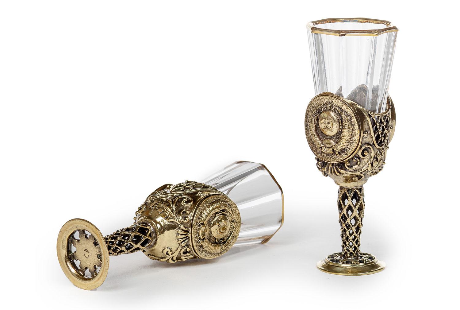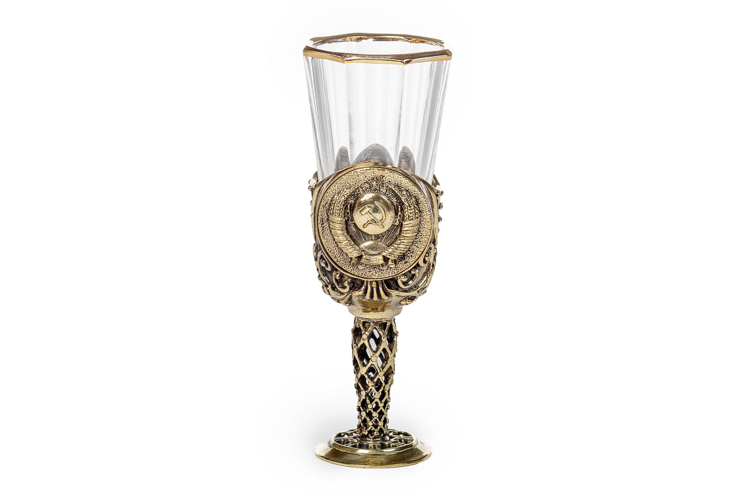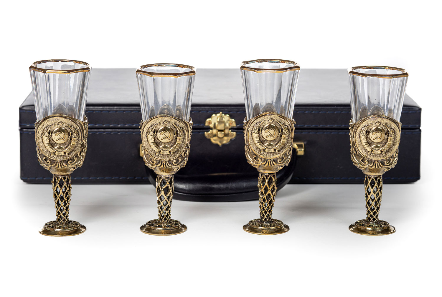 Лафитник герб ссср 4 шт (уп. кожа). Описание: Коллекционеры по всему миру ищут настоящие сокровища. Предметы, которые представляют собой большую ценность. Но ведь у каждого свое понятие о ценности. Для наших родителей ценно то, что они жили в Советском Союзе, и любое напоминание о тех временах для них очень важно. Специально для тех, кто родился и жил во времена СССР четыре лафитника с гербом советского союза. nbsp Метод изготовления: nbsp художественное литье из латуни (ручная работа) Рюмка: Хрусталь, Производитель: Бахметьевский завод, Страна: Россия, Объем: 50 мл nbsp Комплектация: nbsp 4 рюмки, основание (латунь) Упаковка: nbsp кож.зам, ложемент: бархат