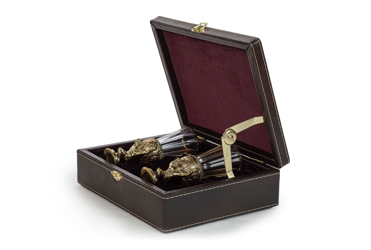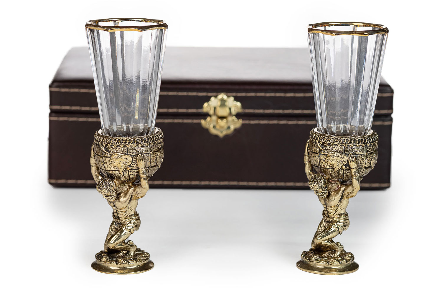 Лафитник атлант 2 шт (уп. кожа). Метод изготовления:  художественное литье из латуни (ручная работа) Рюмка: Хрусталь, Производитель: Бахметьевский завод, Страна: Россия, Объем: 50 мл  Комплектация:  2 рюмки, основание (латунь) Упаковка:  кож.зам, ложемент: бархат