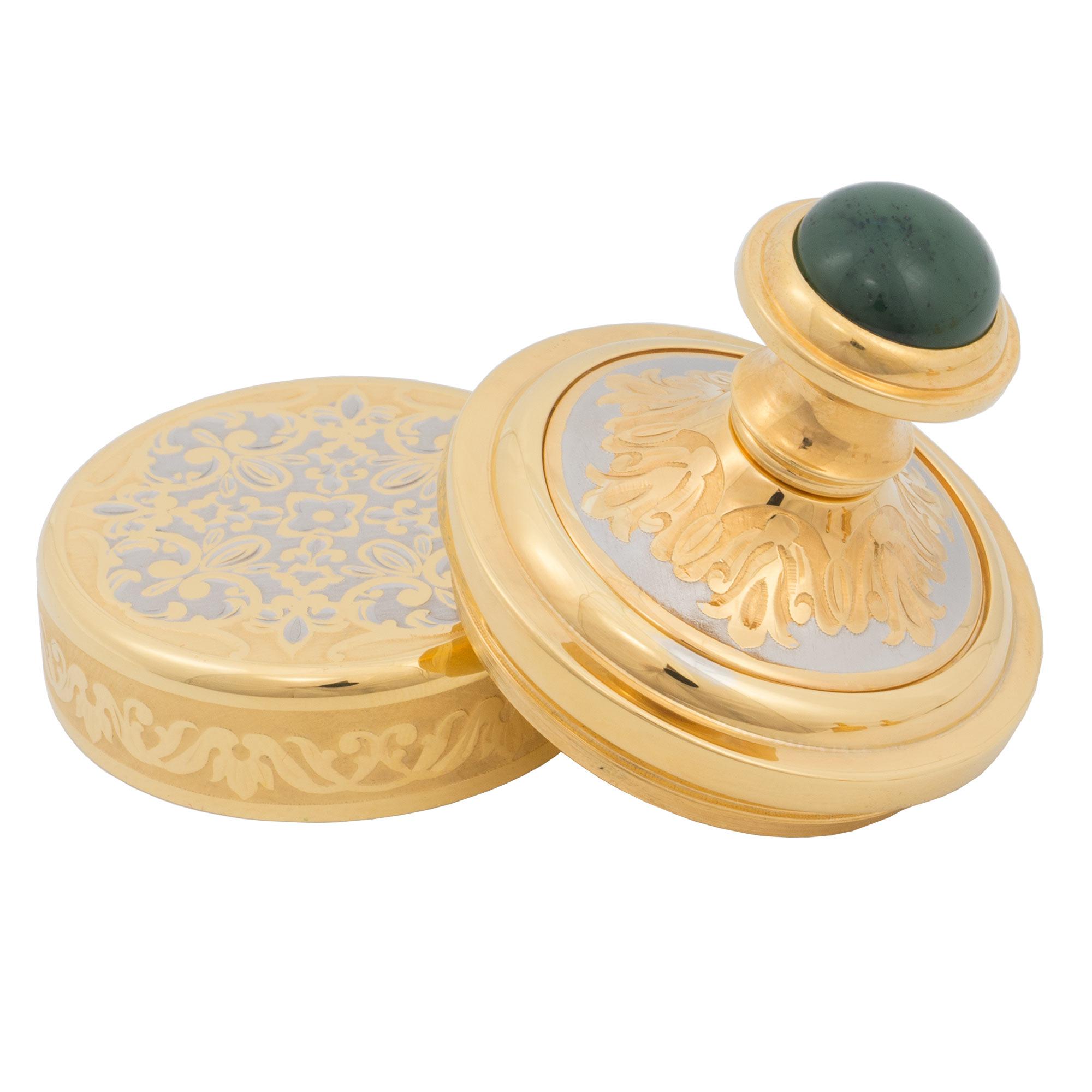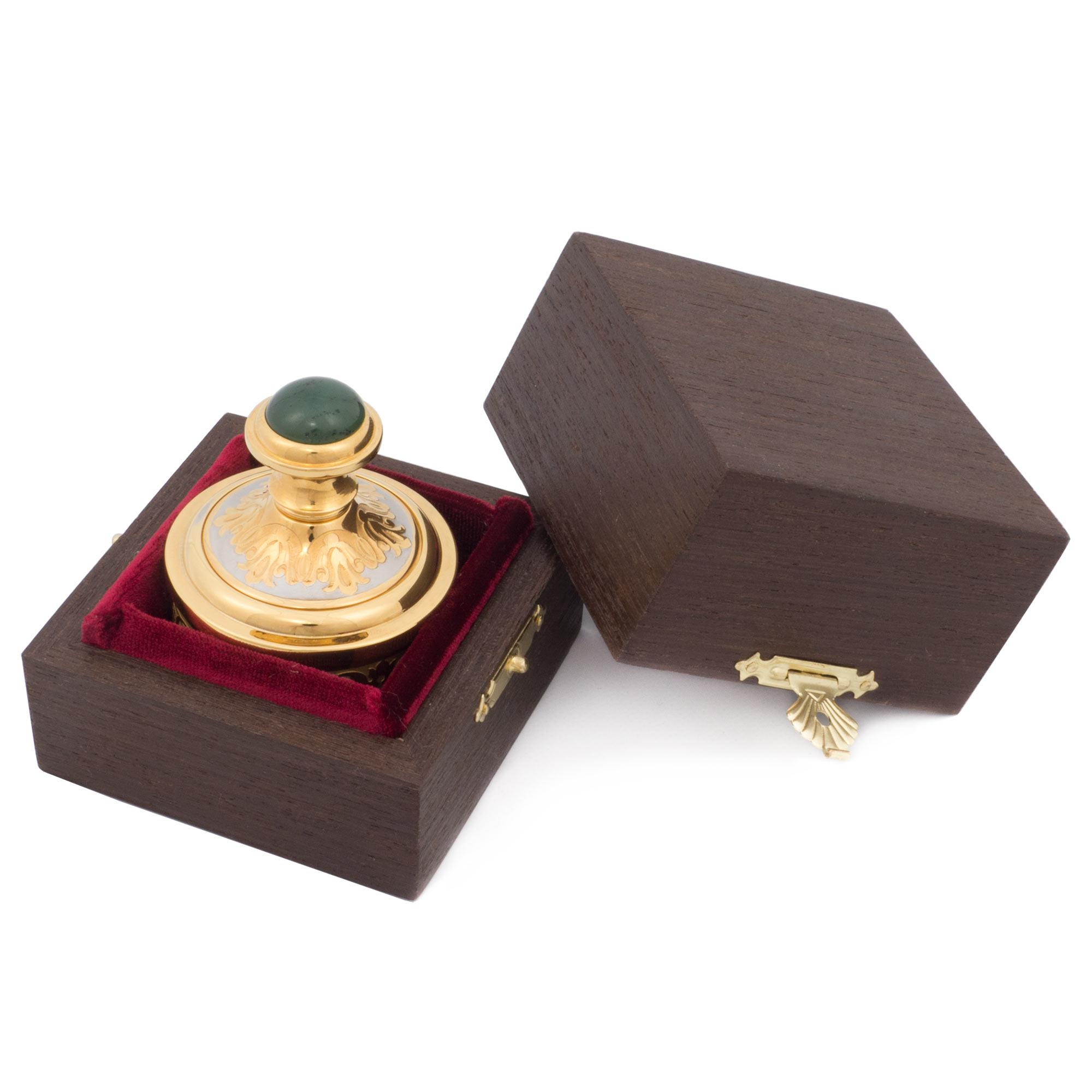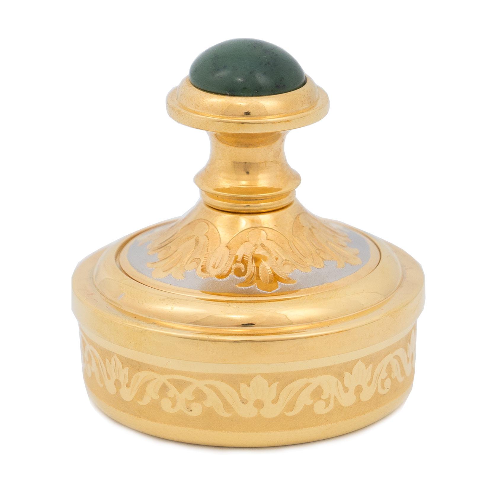 Печать "нефритовая". Вес 500 г Размер Высота: 5,5 см. Диаметр: 5 см. Материал латунь, нефрит, никель, покрытие золотом (999,9). Месторождение Миасское, Челябинская область, Россия  развернуть описание ▼