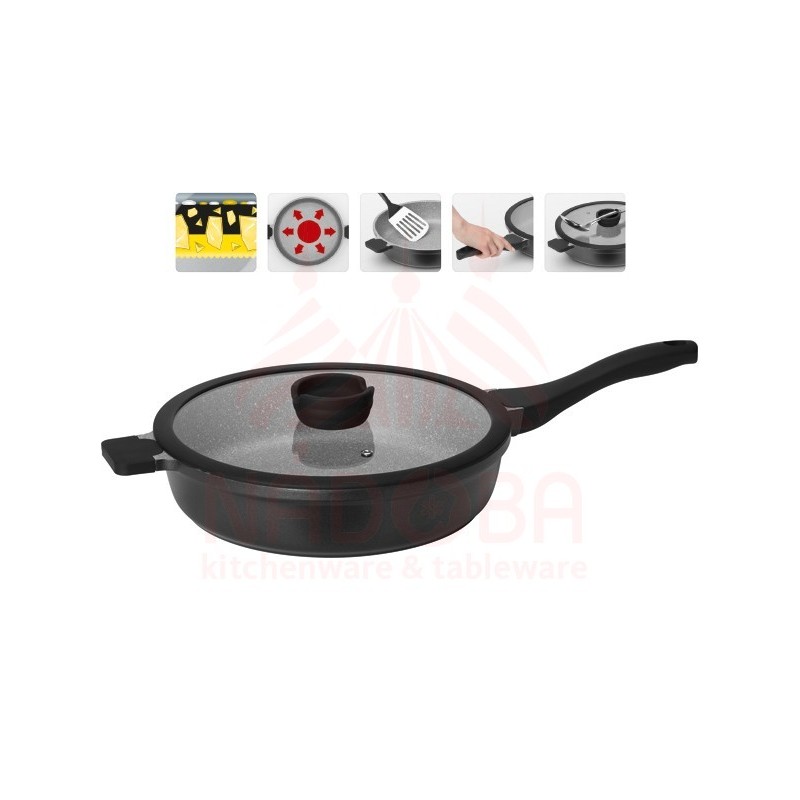 Сотейник с крышкой с антипригарным покрытием grania 28 см 728123. Диаметр 28 см Диаметр дна 22 см Для индукционной плиты да Съемная ручка Нет Вес 1982 грамма Объем 3,92 л Для духовки Да Антипригарное покрытие ILAG-Granitec (5-слойное, усиленно минералами, без PFOA) Материал Литой алюминий Длина с ручкой 53 см Толщина дна 6,2 мм (5 мм) Высота борта 6.8 см Цвет черно-серая Сотейник с крышкой с антипригарным покрытием GRANIA Диаметр сотейника - 28 см Изготовлен из литого алюминия с особо прочным 5-слойным антипригарным покрытием ILAG Granitec, усиленного минералами Антипригарное покрытие не содержит PFOA (перфтороктановой кислоты), кадмия, свинца и прочих вредных веществ Крышка выполнена из закаленного стекла, ободок крышки и ее ручка сделаны с добавлением высококачественного силикона Ручка у крышки может использоваться, как подставка для кухонных инструментов Ручка сотейника выполнена из прочного бакелита При работе ручка не нагревается и не выскальзывает из рук Массивный корпус из литого алюминия обеспечивает быстрый и равномерный нагрев всей поверхности Высокая прочность покрытия позволяет использовать неострые металлические иинструменты (ложки, лопатки и др.) Возможно использование в посудомоечной машине Сотейник подходит для любых типов плит, включая индукционные Сотейник с крышкой с антипригарным покрытием GRANIA 728115 Диаметр сотейника - 28 см Изготовлен из литого алюминия с особо прочным 5-слойным антипригарным покрытием ILAG Granitec, усиленного минералами Крышка выполнена из закаленного стекла Ручка у крышки может использоваться, как подставка для кухонных инструментов