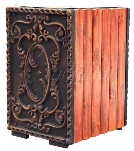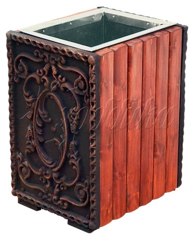 Урна чугунная «ампир комби-1» объём: ? литров. Подробные характеристики Материалы: Боковины: Чугунное художественное литьё. Покрыты порошковой полимерной краской. Возможность выбора цвета по каталогу RAL. Стандартный цвет (по умолчанию) - черный + бронзовое патинирование. Древесина: Сосна/ель (варианты исполнения: лиственница, композитные материалы). Ёмкость для мусора: Оцинкованное съёмное ведро. Технические характеристики: Объём: 30 л. Глубина: 41 см. Ширина: 34 см. Высота: 54 см. Вес: от 58 кг. О модели Комбинированная урна - дерево/чугун. Массивная, парковая урна, оборудованная съемным ведром. Размеры и вес урны обеспечивают ее сохранность. Данная модель популярна при обустройстве больших классических парков в сочетании со скамейками на чугунном основании. Добрались и до Кремля: наши скамейки на территории сквера Наши скамейки в Крыму: благоустроили Севастополь, Ялту, Саки, Судак Варианты цвета на выбор: , палисандр, махагон, тик, груша, еловая зелень, рябина,