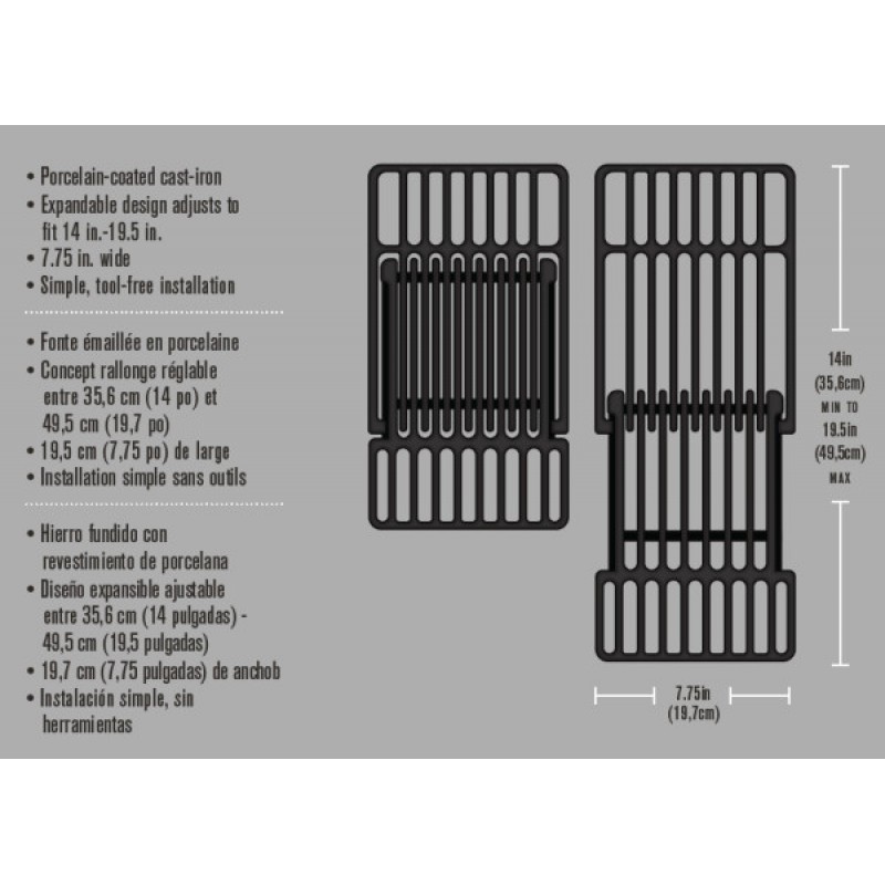 Решетка чугунная универсальная char-broil для сада. Дополнительная универсальная (раздвижная) чугунная решетка для грилей. Вид Дополнительное оснащение Материал Чугун Размеры, см 35,6 - 49,5 Х 19,7 Х 1 Вес, кг 2 Артикул производителя 9748605