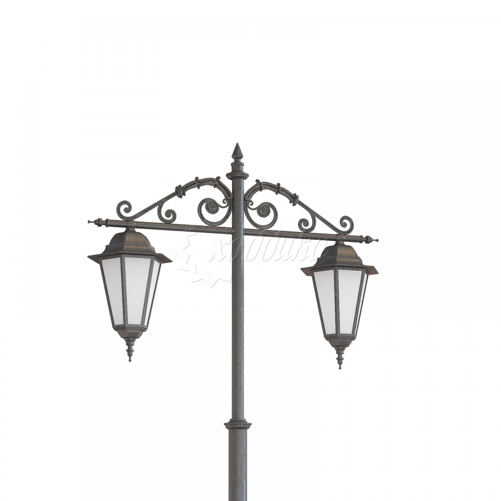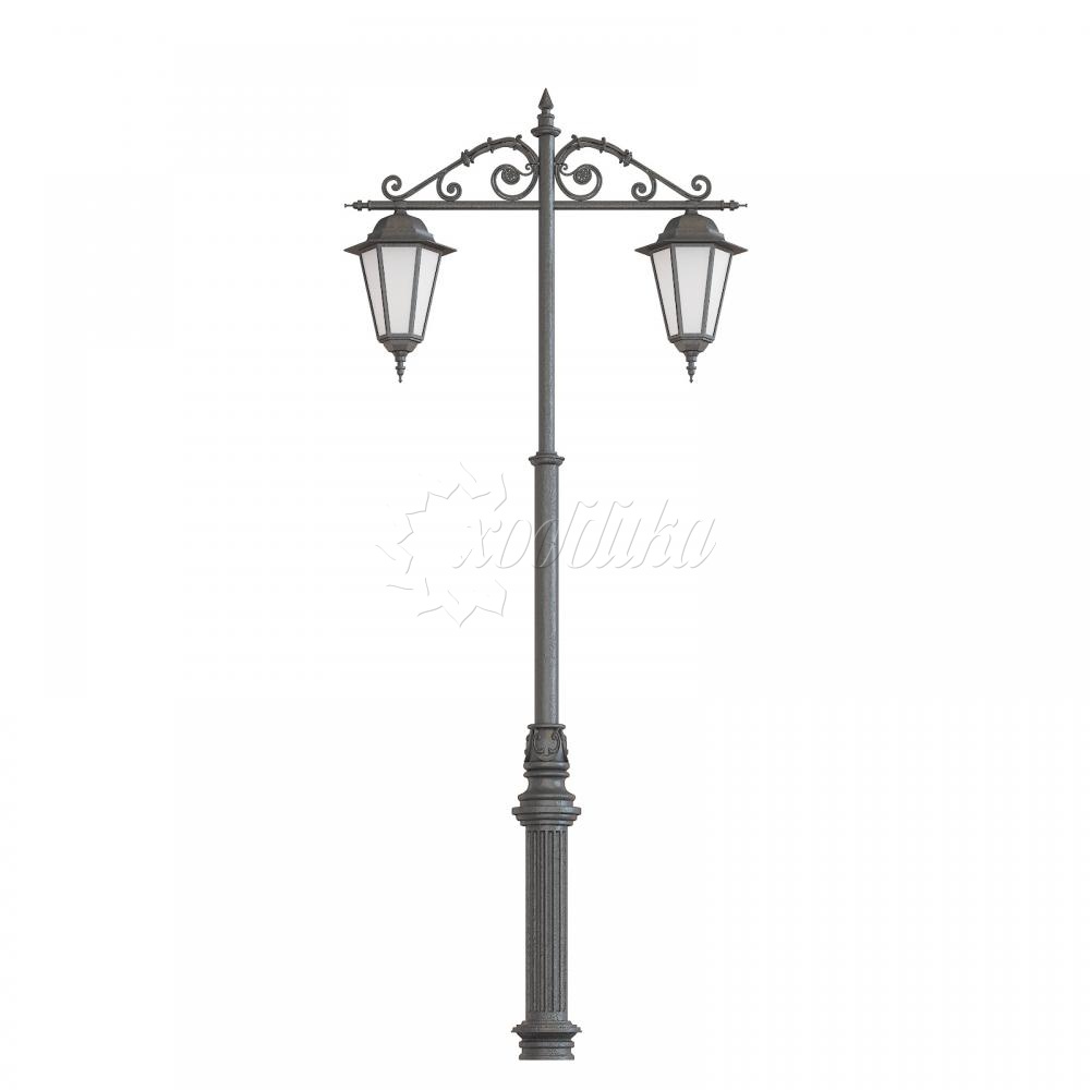 Фонарный столб а-02-2 со светильниками 4,117 м.. Подробные характеристики Материалы: Основание и кронштейн: Чугунное художественное литьё. Покрыты порошковой полимерной краской. Возможность выбора цвета по каталогу RAL. Стандартный цвет (по умолчанию) - черный + бронзовое патинирование. Стойка: Сталь. Покрыта порошковой полимерной краской. Возможность выбора цвета по каталогу. Стандартный цвет (по умолчанию) - черный + бронзовое патинирование. Светильник: Бремен. Технические характеристики: Источник света: Патрон E-27 под лампу накаливания до 150 Вт, либо энергосберегающую лампу. Возможна комплектация ПРА под Nat70, Nat100, ДРЛ80, ДРЛ125 и источником света. Возможно комплектование светодиодными модулями. Высота: от 4,117 до 5,617 м Вес: от 96 кг Установка производится путем бетонирования стойки (закладного фундамента), либо бетонированием закладной детали с последующим креплением стойки болтовым соединением. Закладной фундамент заказывается отдельно и в цену не входит. О модели Используется для освещения парков, скверов, коттеджных поселков, частных домов, прилегающих территорий зданий. Установка производится путем бетонирования стойки (закладного фундамента), либо бетонированием закладной детали с последующим креплением стойки болтовым соединением.