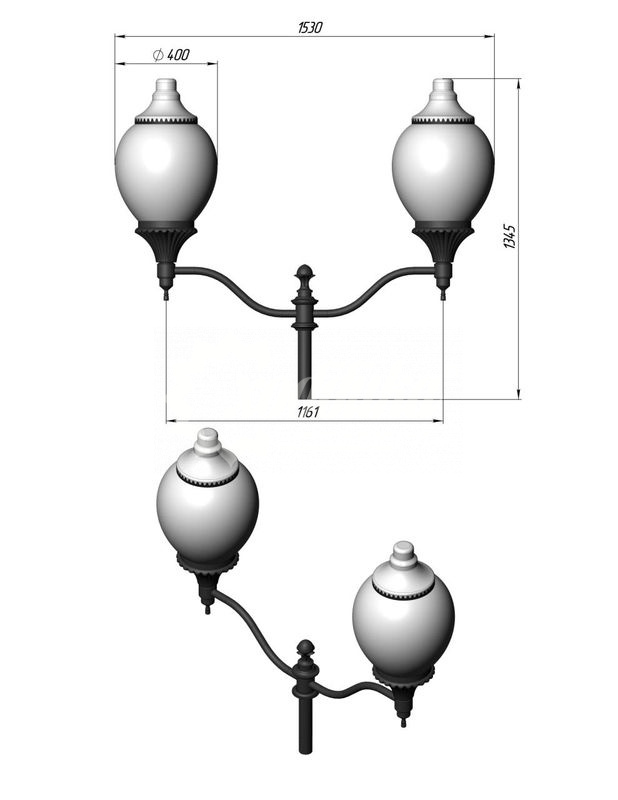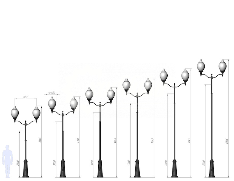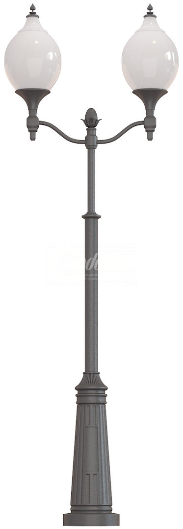Фонарный столб л-05-2 со светильниками 4,845 м. Подробные характеристики Материалы: Основание и кронштейн: Чугунное художественное литьё. Покрыты порошковой полимерной краской. Возможность выбора цвета по каталогу RAL. Стандартный цвет (по умолчанию) - черный + бронзовое патинирование. Стойка: Сталь. Покрыта порошковой полимерной краской. Возможность выбора цвета по каталогу. Стандартный цвет (по умолчанию) - черный + бронзовое патинирование. Светильник: Лотос. Технические характеристики: Источник света: Патрон E-27 под лампу накаливания до 150 Вт, либо энергосберегающую лампу. Возможна комплектация ПРА под Nat70, Nat100, ДРЛ80, ДРЛ125 и источником света. Возможно комплектование светодиодными модулями. Высота: от 3,845 до 6,345 м Вес: от 115 кг Установка производится путем бетонирования стойки (закладного фундамента), либо бетонированием закладной детали с последующим креплением стойки болтовым соединением. Закладной фундамент заказывается отдельно и в цену не входит. О модели Используется для освещения парков, скверов, коттеджных поселков, частных домов, прилегающих территорий зданий. Установка производится путем бетонирования стойки (закладного фундамента), либо бетонированием закладной детали с последующим креплением стойки болтовым соединением.