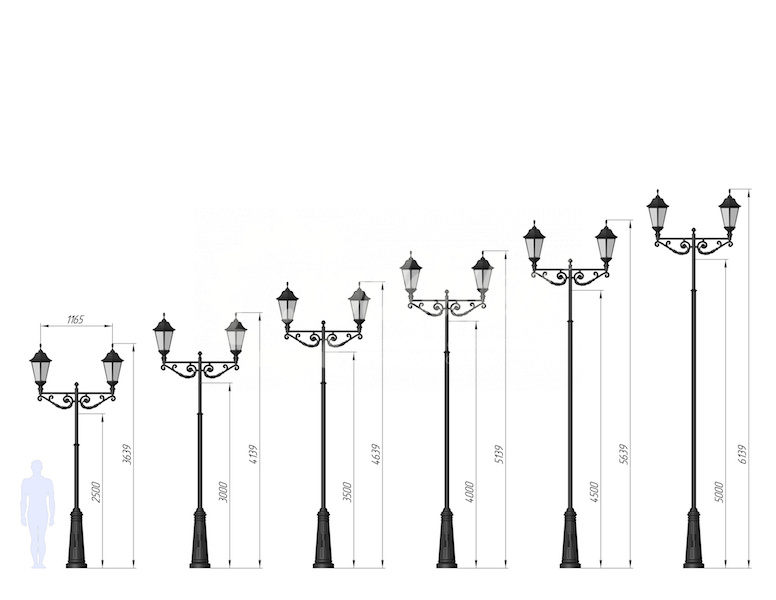 Фонарный столб л-06-2 со светильниками 3,639 м. Подробные характеристики Материалы: Основание и кронштейн: Чугунное художественное литьё. Покрыты порошковой полимерной краской. Возможность выбора цвета по каталогу RAL. Стандартный цвет (по умолчанию) - черный + бронзовое патинирование. Стойка: Сталь. Покрыта порошковой полимерной краской. Возможность выбора цвета по каталогу. Стандартный цвет (по умолчанию) - черный + бронзовое патинирование. Светильник: Бремен. Технические характеристики: Источник света: Патрон E-27 под лампу накаливания до 150 Вт, либо энергосберегающую лампу. Возможна комплектация ПРА под Nat70, Nat100, ДРЛ80, ДРЛ125 и источником света. Возможно комплектование светодиодными модулями. Высота: от 3,639 до 6,139 м Вес: от 120 кг Установка производится путем бетонирования стойки (закладного фундамента), либо бетонированием закладной детали с последующим креплением стойки болтовым соединением. Закладной фундамент заказывается отдельно и в цену не входит. О модели Светильники и закладной фундамент заказываются отдельно и в цену не входят. Используется для освещения парков, скверов, коттеджных поселков, частных домов, прилегающих территорий зданий. Установка производится путем бетонирования стойки (закладного фундамента), либо бетонированием закладной детали с последующим креплением стойки болтовым соединением.