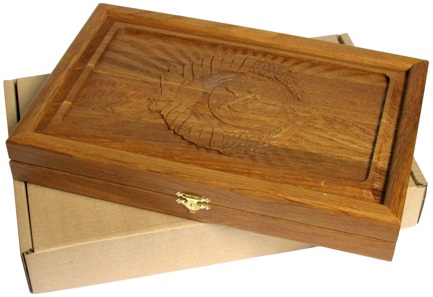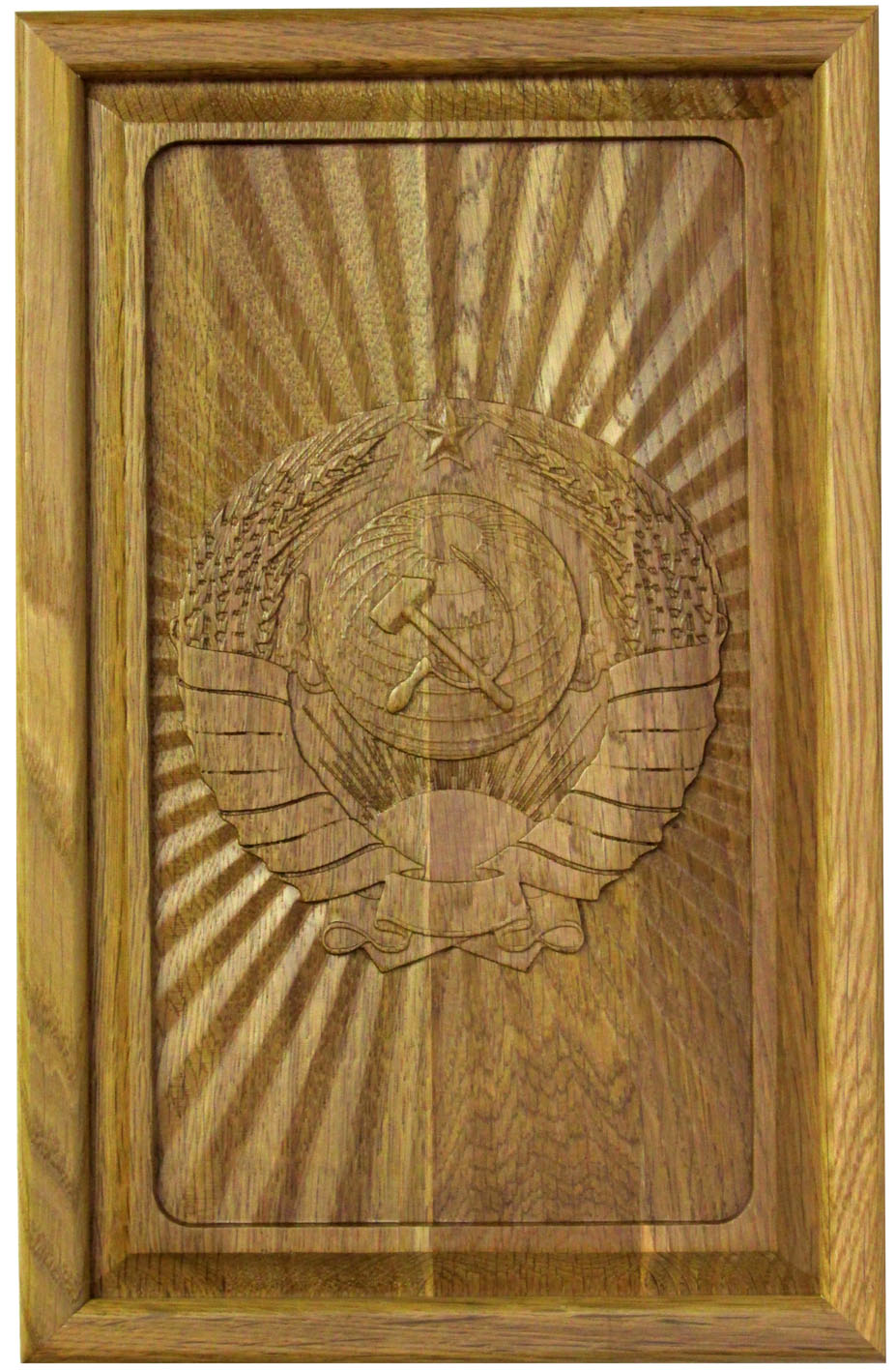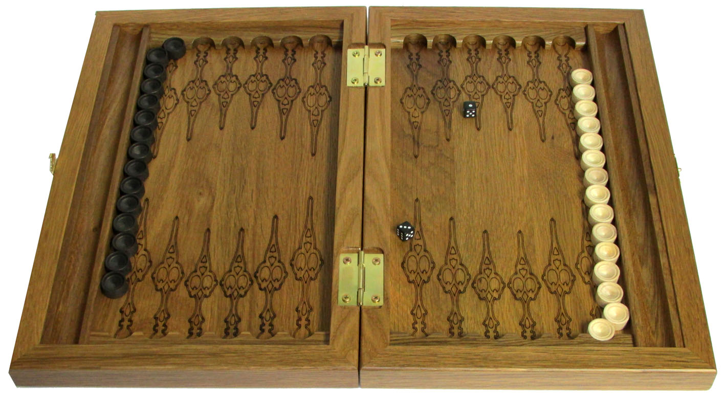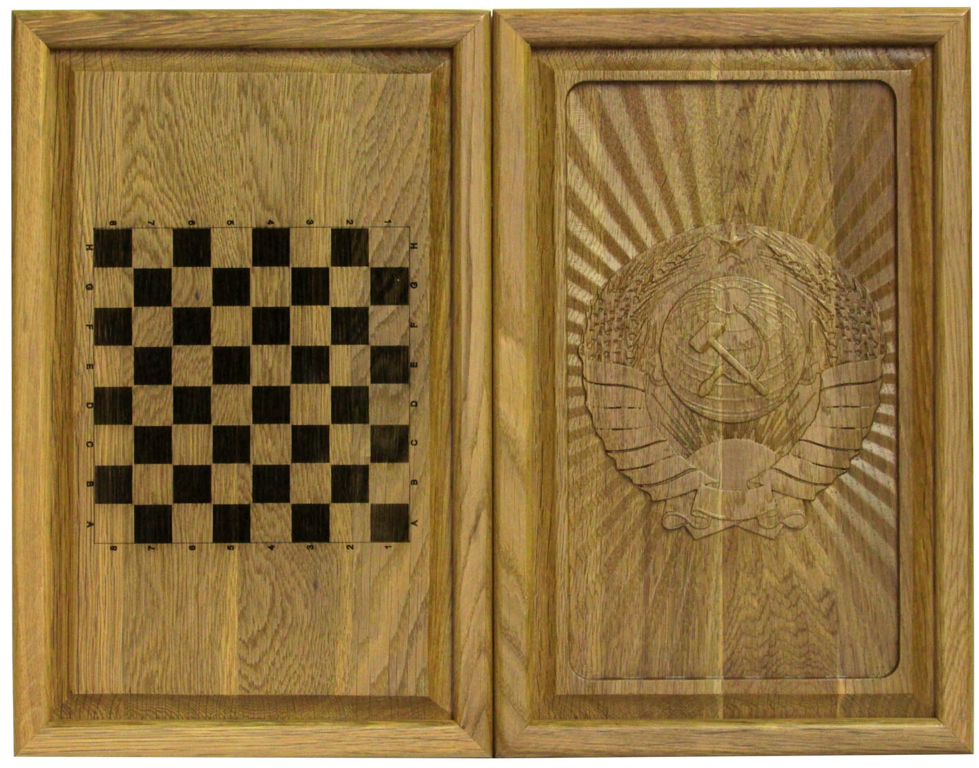 Резные объемные нарды+шашки дорожного размера из массива мореного дуба &qu. Артикул: 75-14 Наименование: Резные объемные нарды+шашки дорожного размера из массива мореного дуба Герб СССР Размер: 36 х 46 см Описание: Материал: Мореный дуб Технология: Резьба по массивуОдна из лучших досок дорожного размера. Размер не самый маленький (встречаются нарды и меньших размеров), однако нашей целью было создать нарды минимального из УДОБНЫХ размеров. Эта доска соответствует всем основным запросам любителей игры в нарды: - Деревянные фишки из массива березы с углублением по центру легко перемещаются пальцами. Диаметр фишки 19 мм - Возможность выставить все фишки вдоль края поля, что важно при игре в длинные нарды - Удобные ячейки из массива мореного дуба - Ложемент для хранения фишек и костей по краю поля С внешней стороны на лицевой филенке вырезан объемный герб СССР. На оборотной филенке вырезана доска для игры в шашки. Упаковка: транспортная картонная коробка. ВАЖНО: Нарды будут иметь такой же резной рисунок, у них будет такая же фурнитура и точно так же будут выделены стрелки на поле, НО рисунок дерева неповторим. Поэтому Вы не сможете получить точно такие же нарды, как на сайте. Для того, чтобы игра в нарды доставила Вам еще большее удовольствие, предлагаем заменить фишки штатной комплектации на изысканные фишки из экзотического самшита и золотистого розового дерева, диаметром 19 мм, которые помогут дополнить эту игру еще и замечательным звучанием драгоценных пород деревьев.