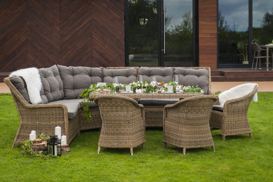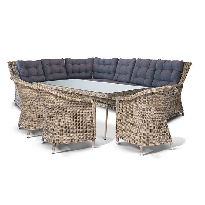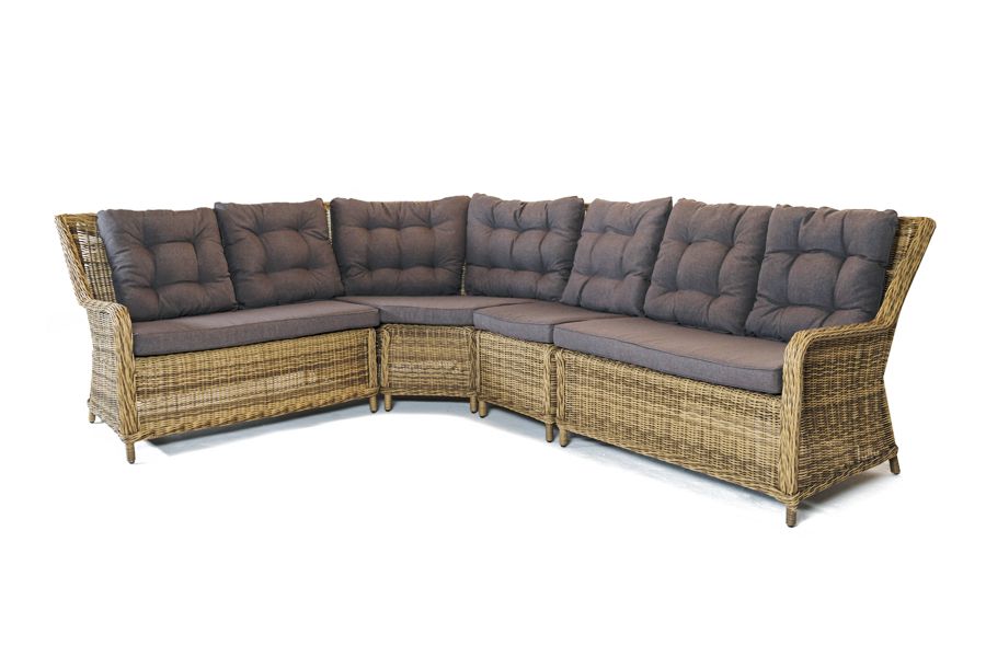 Модульная зона с мягким сиденьем и спинкой из высококачественного и неприхотливого искусственный ротанг серо-желтого оттенка Круглое плетение Все предметы компонуются по модульному принципу, создавая угловые и линейные композиции. Прочный алюминиевый каркас, выдерживающий до 200 кг Подушки выполнены из водостойкой полиэфирной ткани для защиты мебели от дождя и солнца Съемные чехлы серого цвета Столешница обеденного стола изготовлена из закаленного стекла толщиной 5мм Вся мебель сделана вручную нашими квалифицированными специалистами В солнечных лучах плетение приобретает более светлый и яркий оттенок Подходит для использования внутри помещения и на открытом воздухе В комплект лаунж зоны входят угловой модуль, правый и левый модули, прямой модуль, три кресла, обеденный стол и подушки.