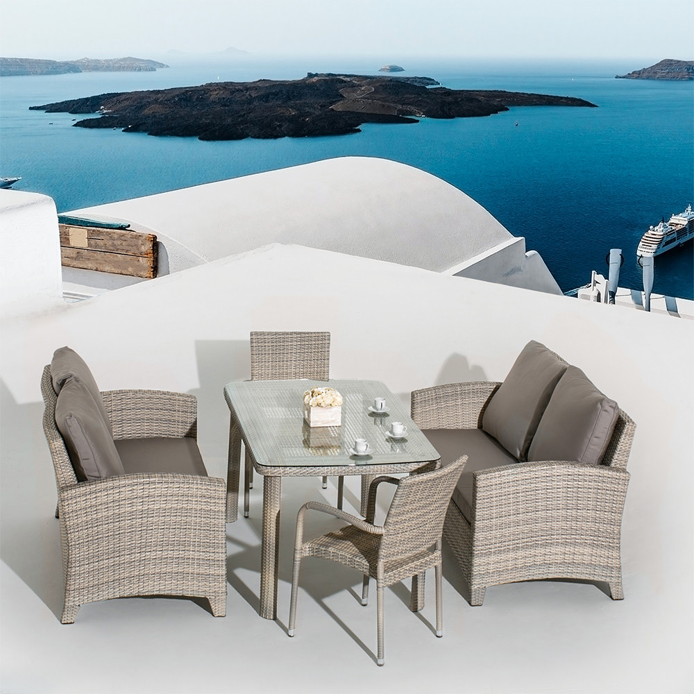 Стильная обеденная группа на 6+ человек, каркас выполнен из углеродистой стали с защитным покрытием, плетение плоское фактурное выполнено в ручную, столешница из закаленного стекла толщиной 5 мм. В комплекте 2 дивана, 2 стула nbsp