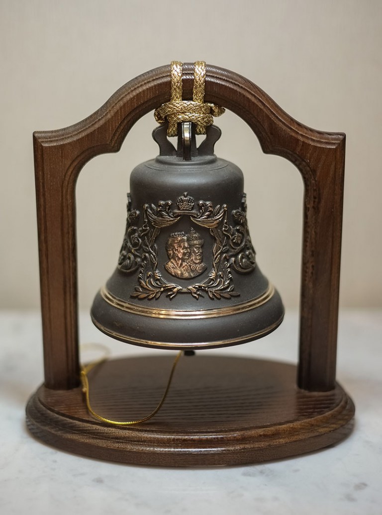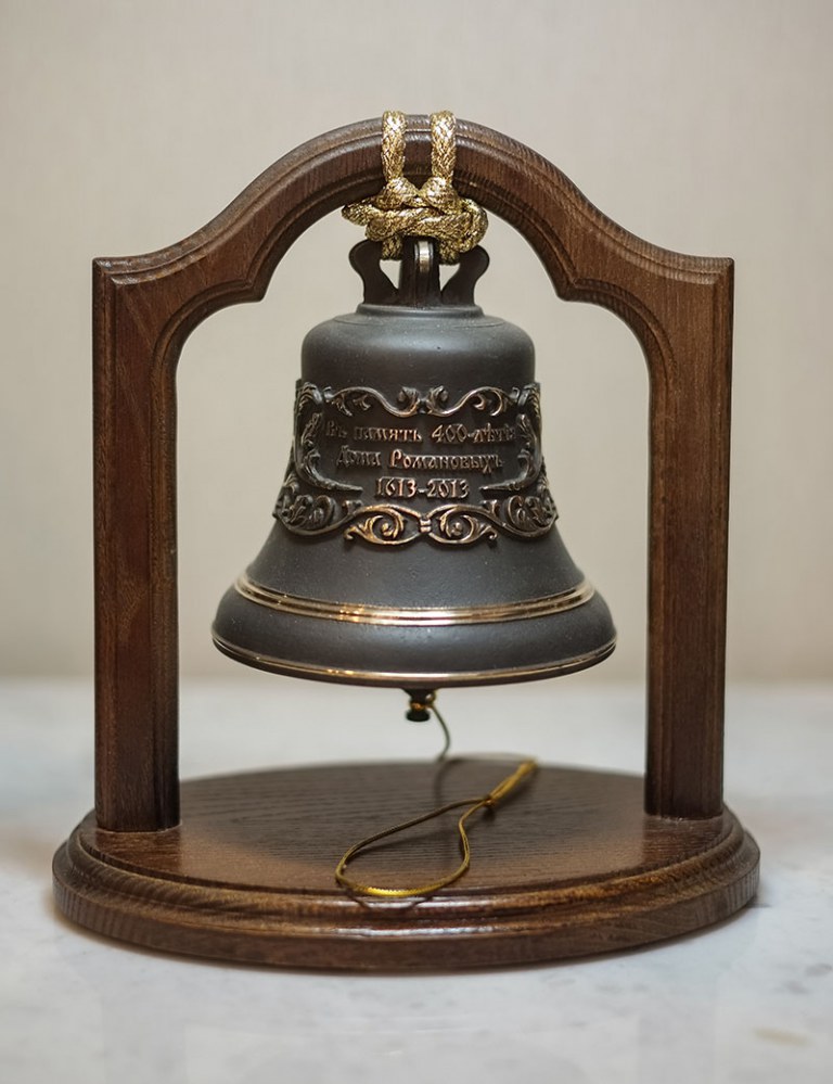 Колокол 1кг п 400 лет дома романовых на дубовой подставке. В основе символики колокола использованы погрудные портреты Главы российского Императорского Дома Государыни Великой Княгини Марии Владимировны и родоначальника царственной династии Михаила Федоровича Романова. По окружности колокола дарственная надпись: «В память 400-летия Дома Романовых 1613 - 2013».