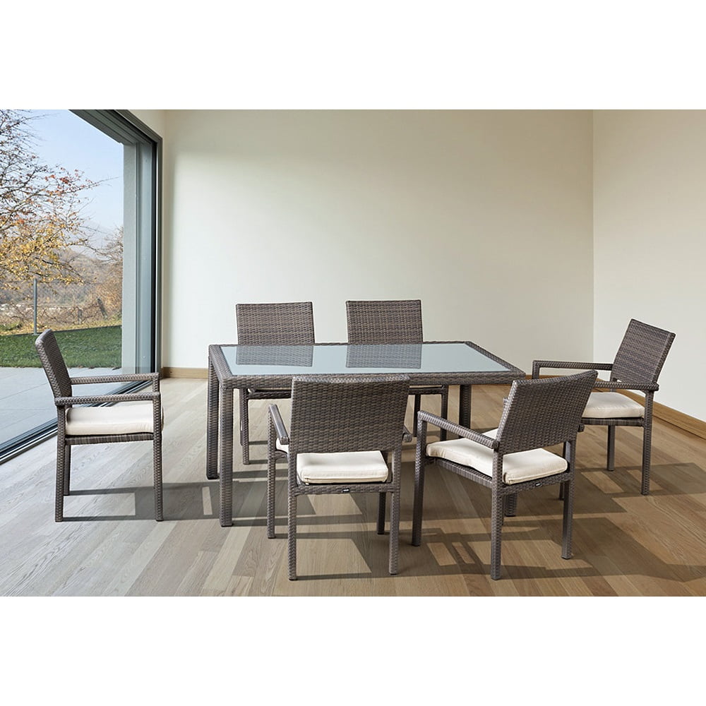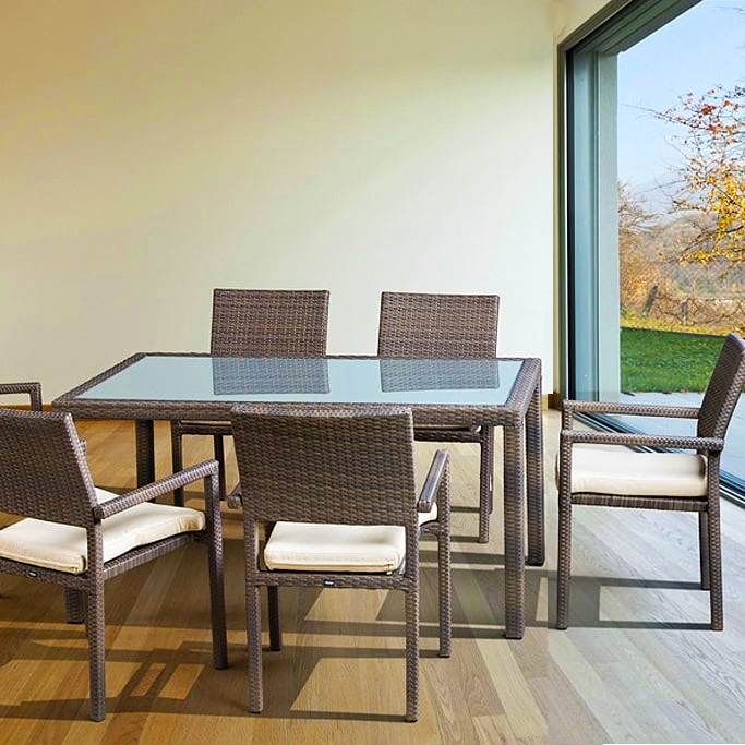 Набор садовой мебели для обеда mi casa roca seis matt, садовая мебель. Классический удобный всепогодный набор садовой мебели на 6 персон. Отлично смотрится как на улице, так и в помещениях. Плоское плетение. Столешница из закаленного матового стекла с обработкой кромки. Подушки в комплекте. Стул, см 88 Х 56 Х 50 Обеденный стол, см 150 Х 90 Х 79 Материал каркаса Всепогодный алюминий Материал изделия Искусственный ротанг Материал столешницы Закаленное стекло