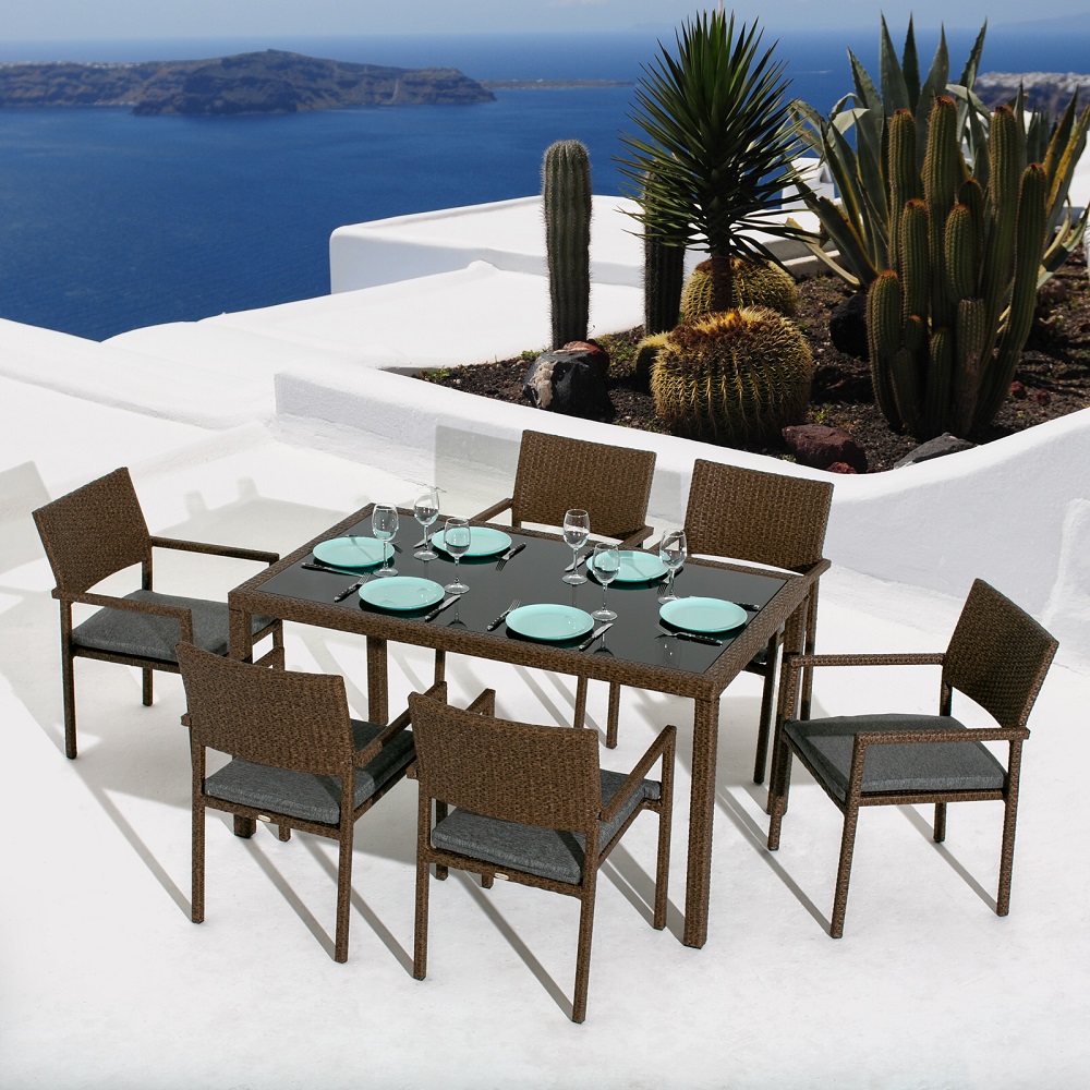 Набор садовой мебели для обеда mi casa roca seis, садовая мебель. Классический удобный всепогодный набор садовой мебели на 6 персон. Отлично смотрится как на улице, так и в помещениях. Плоское плетение. Столешница из закаленного матового стекла черного цвета с обработкой кромки. Подушки в комплекте. Стул, см 88 Х 56 Х 50 Обеденный стол, см 150 Х 90 Х 79 Материал каркаса Всепогодный алюминий Материал изделия Искусственный ротанг Материал столешницы Закаленное стекло