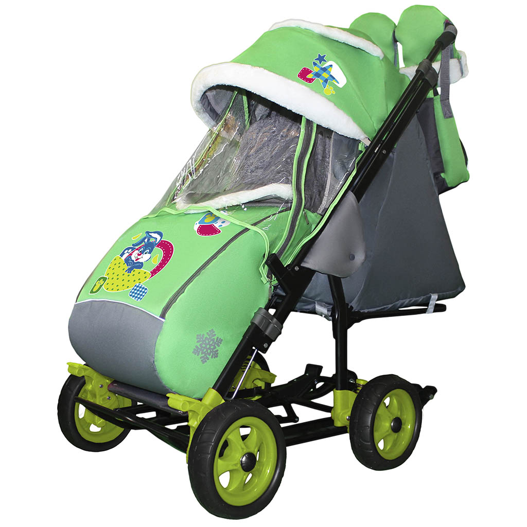 Санки-коляска Snow Galaxy City-3-1 зайка синий на зелёном на больших колёс