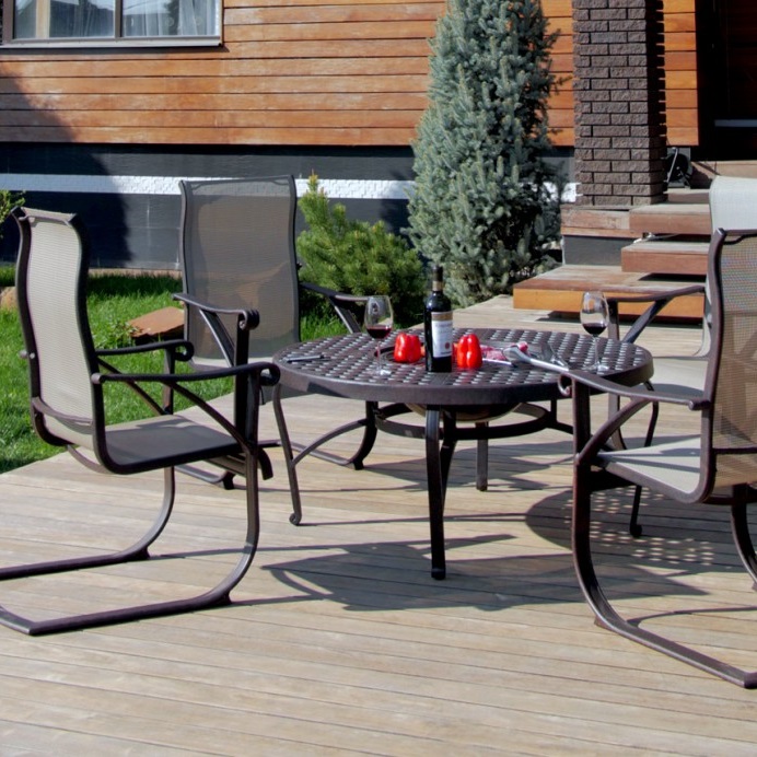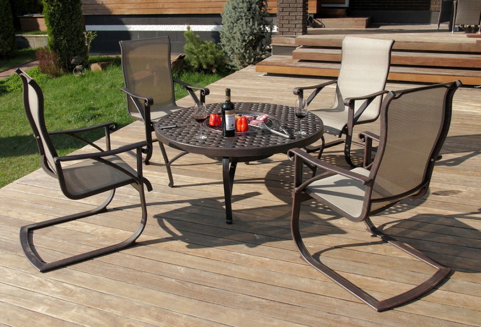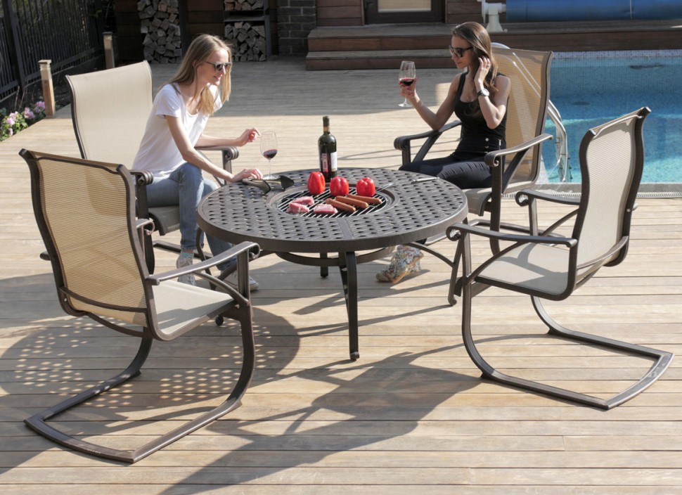 Обеденная группа lite etna, садовая мебель. Набор садовой мебели из литого алюминия патио со столиком с барбекю на четыре персоны. Мебель из литого алюминия прекрасно гармонирует с современными стилями, помимо классики, все чаще встречаются модели оригинального органического и футуристического дизайна. Литой алюминий является более предпочтительным материалом для садовой мебели, поскольку он не только устойчив к коррозии, но и имеет легкий вес. В качестве обивки кресел применен текстилен – плетеное полотно из полиэстера с полихлорвиниловым покрытием. Этот материал устойчив к УФ-излучению, пропускает воздух, и плюс ко всему обладает отталкивающими от грязи свойствами. Комплектация : Стол круглый с барбекю ? 120 см, внутренний круг стола ? 56 см, высота 55 см, 4 кресла. Кресло, см 55 X 51 X 106 Обеденный стол, см 55 Х 120D Материал каркаса Всепогодный алюминий Страна бренда Испания Вес, кг 75.5