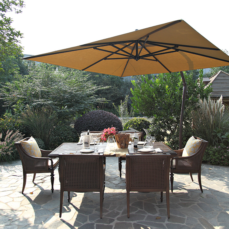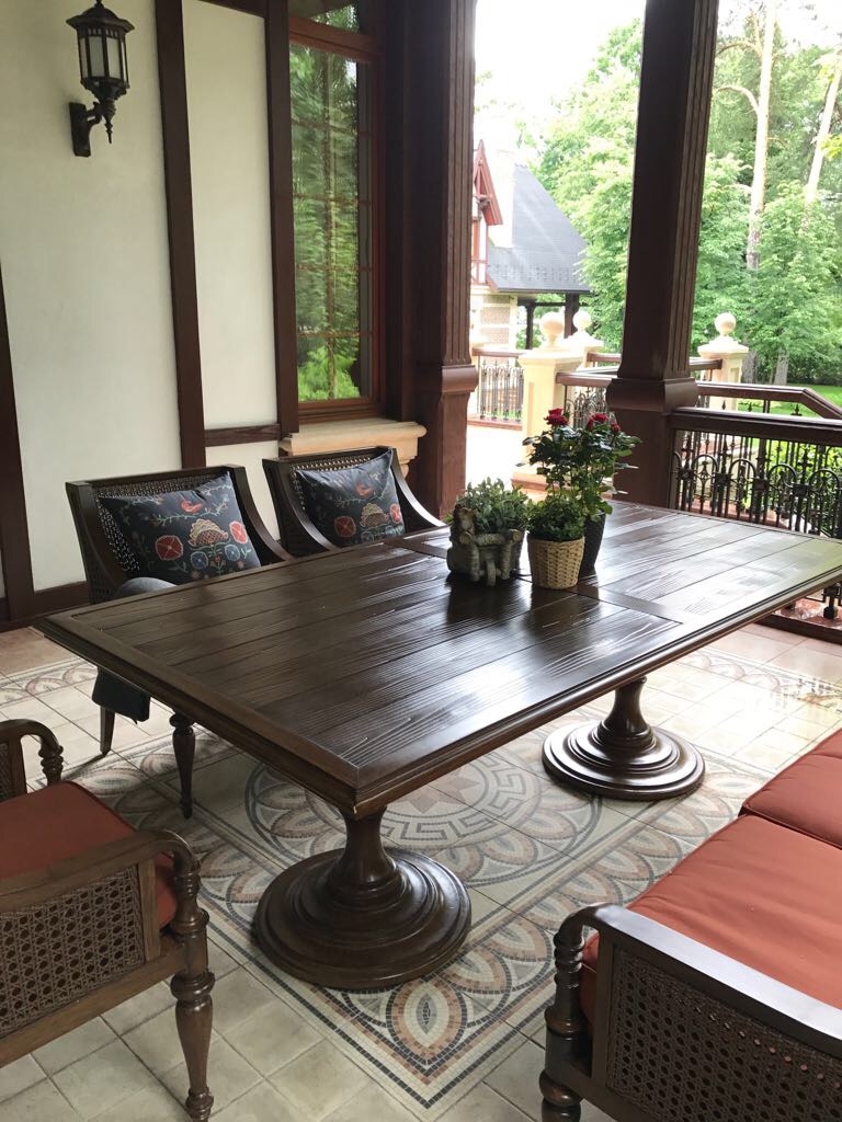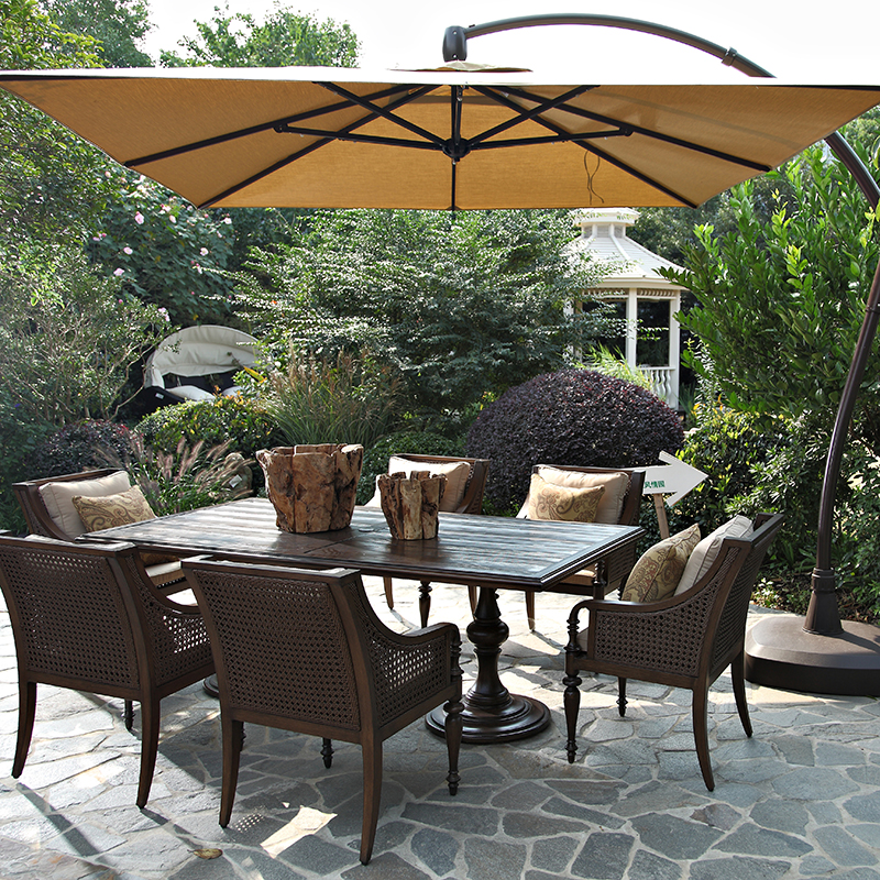 Обеденная группа вишневый садъ альберо колониале 2, садовая мебель. Обеденная группа из литого алюминия включает в себя 6 кресел и большой обеденный стол. Подушки входят в комплект, цвет подушек можно выбрать. Мебель изготовлена из прочного литого алюминия с многослойной окраской под натуральную древесину и античной патиной, придающей мебели роскошный старинный вид. Спинка кресел декорирована под изящное ротанговое плетение. Мебель имеет большой срок службы и может эксплуатироваться в температурном диапазоне от -70 до +80 градусов Цельсия. Алюминий легко переносит перепады температур, осадки и другие неблагоприятные погодные воздействия и может эксплуатироваться на улице круглый год. Подушки могут быть пошиты в любом оттенке уличных тканей премиум-класса Sunbrella. Эти ткани устойчивы к влаге, не накапливают загрязнения, в них не заводятся грибки и паразиты, а окраска волокна еще на этапе производства позволяет ткани долго сохранять первоначальный яркий цвет. Кресло, см 89 X 73 X 90 Обеденный стол, см 218 X 112 X 75 Материал каркаса Всепогодный алюминий Материал изделия Литой алюминий Материал столешницы Литой алюминий