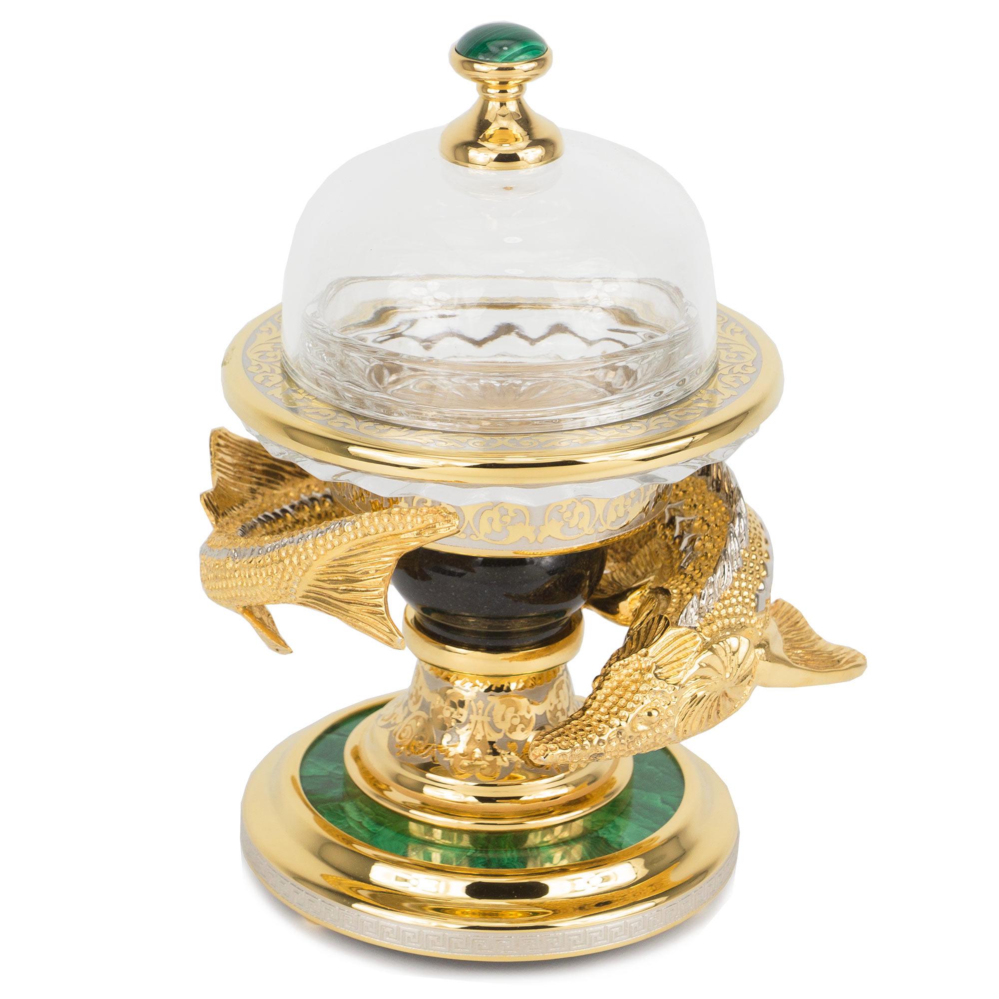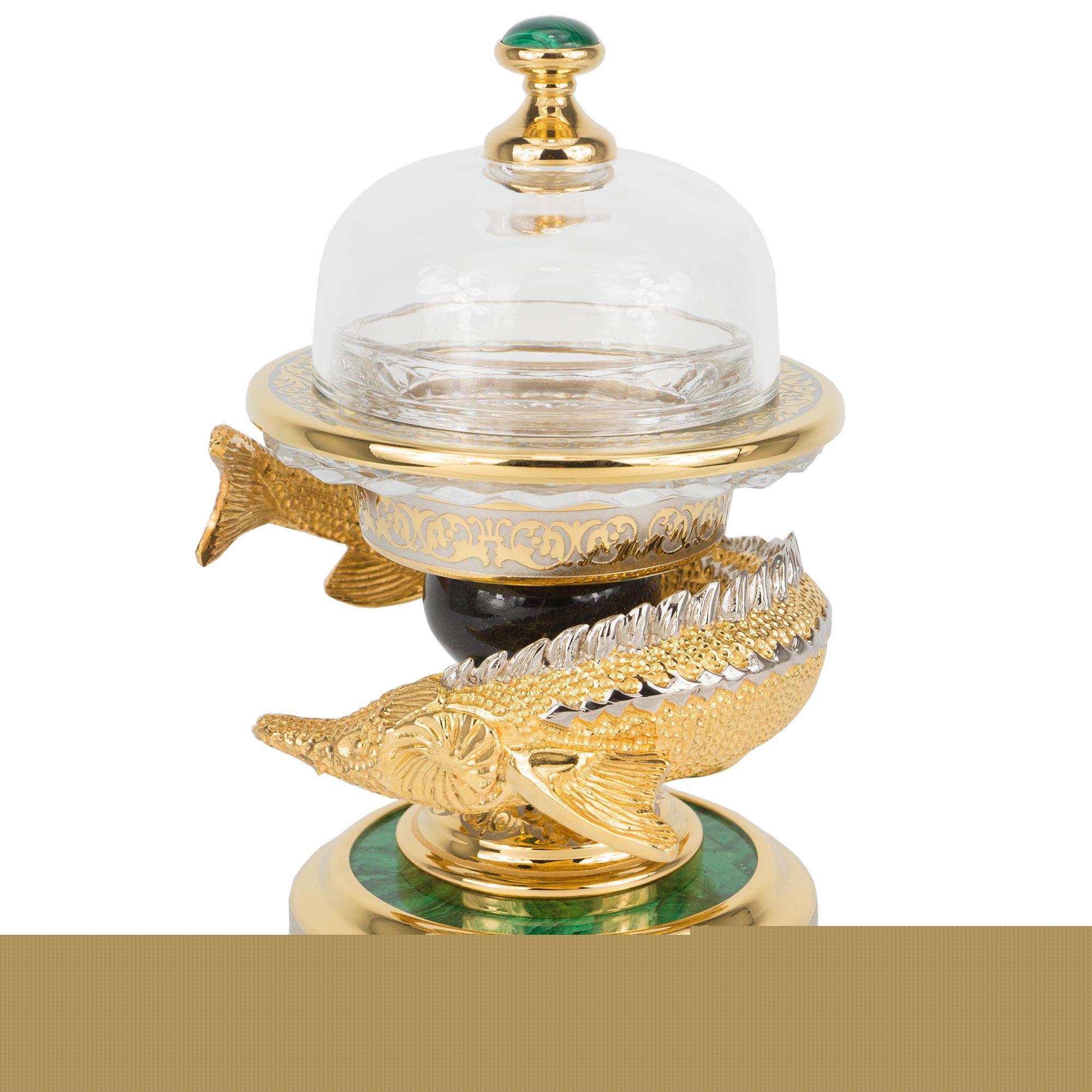 Икорница "осетр" малахит позолота 160х140х215 мм 4800 гр.. Вес 4800 г Размер 16х14х21,5 см Материал малахит, хрусталь, латунь, никель, покрытие золотом (999,9).  развернуть описание ▼