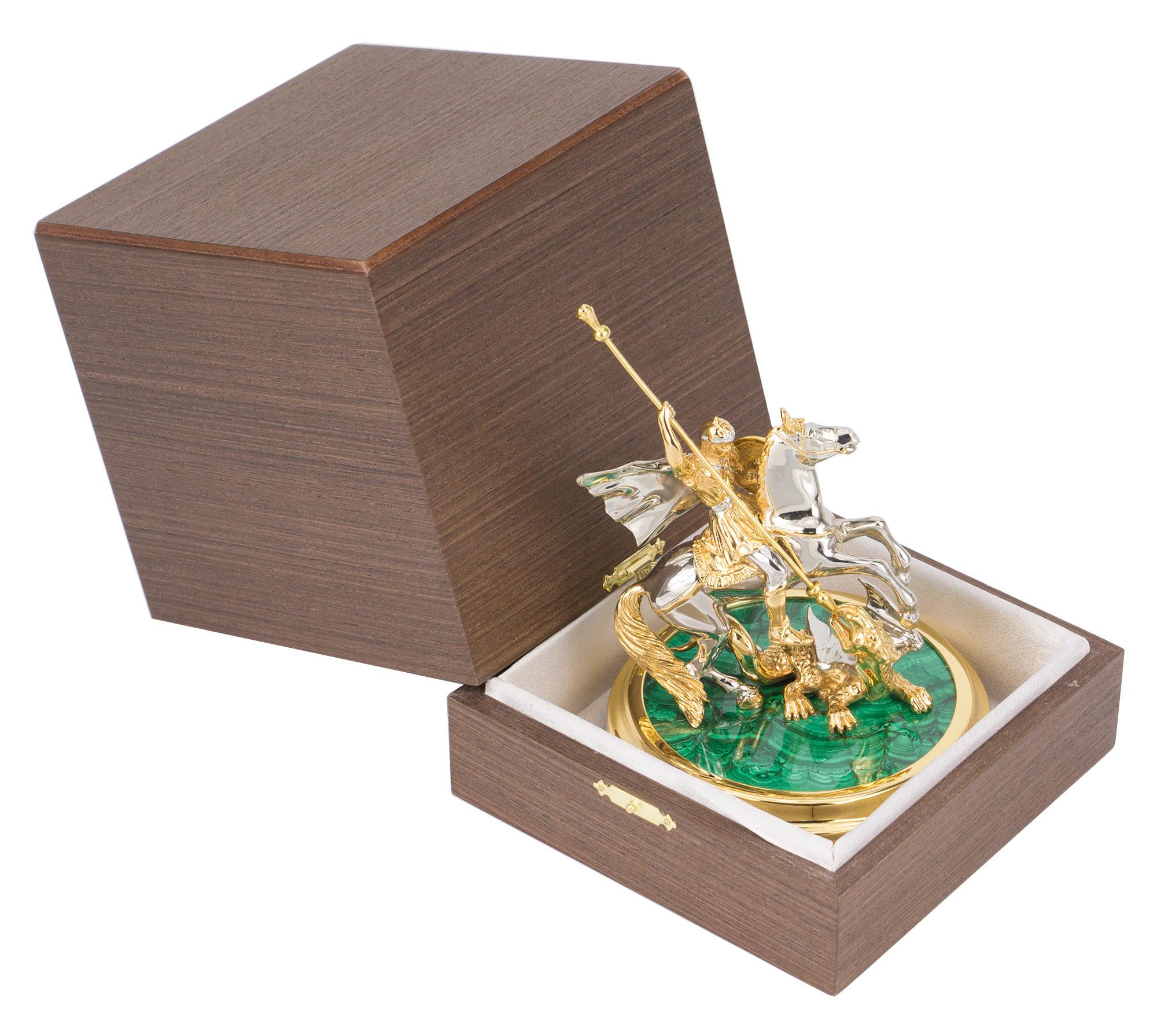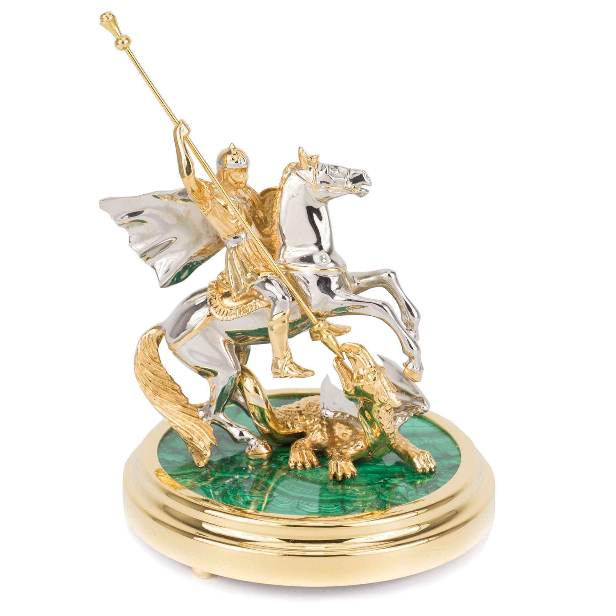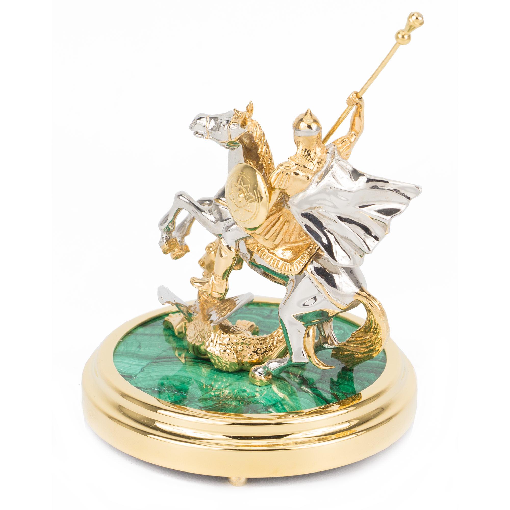 Статуэтка "георгий победоносец" малахит позолота 125х125х135 220. Вес 2200 г Размер 12,5х12,5х13,5 см Материал малахит, латунь, никель, покрытие золотом (999,9).  развернуть описание ▼