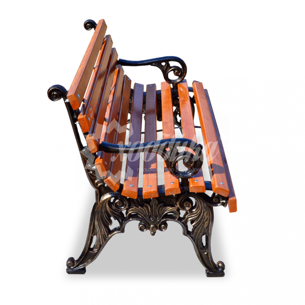 Скамейка чугунная «белые ночи» с подлокотниками кресло. Подробные характеристики Скамейка поставляется в разобранном виде! Лиственница лучше чем сосна! В производстве чугунных скамеек мы используем лиственницу. Внимание, остерегайтесь подделок! Материалы: Опоры: Чугунное художественное литьё. Покрыты порошковой полимерной краской. Возможность выбора цвета по каталогу RAL. Стандартный цвет (по умолчанию) - черный + бронзовое патинирование. Сиденье и спинка: Брус - ангарская сосна/лиственница (вариант исполнения: композитные материалы) различного сечения. Огнебиозащитные пропитки + тонировочный состав с антисептиком + два слоя яхтного лака с промежуточным шлифованием. Возможность выбора цвета из палитры. Фурнитура: Оцинкованная. Возможность выбора цвета фурнитуры по каталогу RAL. Стандартный цвет (по умолчанию) - серебристый. Возможность использования потайной/скрытой фурнитуры. Технические характеристики: Высота: 810 мм Ширина: 710 мм Длина: 600 - 3000 мм Высота сиденья: 450 мм Ширина сиденья: 460 мм Длина посадочного места: 480 - 2880 мм Вес версии 0.6 м: 96.73 кг Вес версии 1.2 м: 102.71 кг Вес версии 1.5 м: 105.45 кг Вес версии 1.8 м: 108.09 кг Вес версии 2.0 м (2 опоры): 109.85 кг Вес версии 2.0 м (3 опоры): 147.50 кг Вес версии 2.5 м (3 опоры): 153.10 кг Вес версии 3.0 м (3 опоры): 157.50 кг О модели Чугунная скамейка Белые ночи с подлокотниками. Скамейка выполнена в классическом стиле, художественное литьё чугунных опор обладает высоким качеством отливки, которые в совокупности с брусом из отборной лиственницы создают неповторимую композицию по доступной цене. Композиционная линия серии скамеек Белые ночи предполагает несколько вариантов исполнения: вы можете выбрать скамейку без подлокотников или с изящными чугунными подлокотниками. Также предусмотрена возможность покрытия бруса маслом для наружных работ. (Стоимость уточняйте у менеджера). Варианты цвета на выбор: , палисандр, тик, махагон,