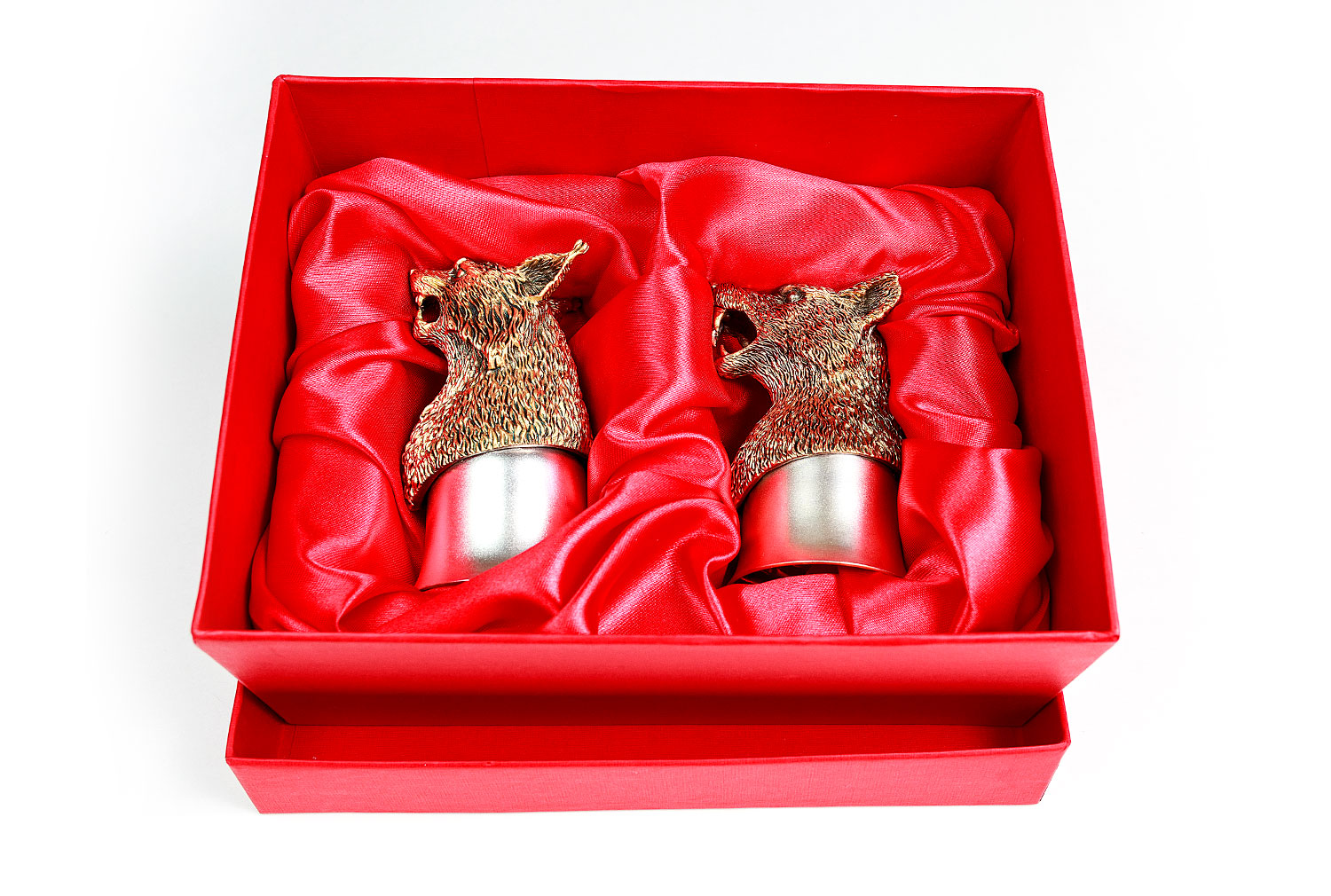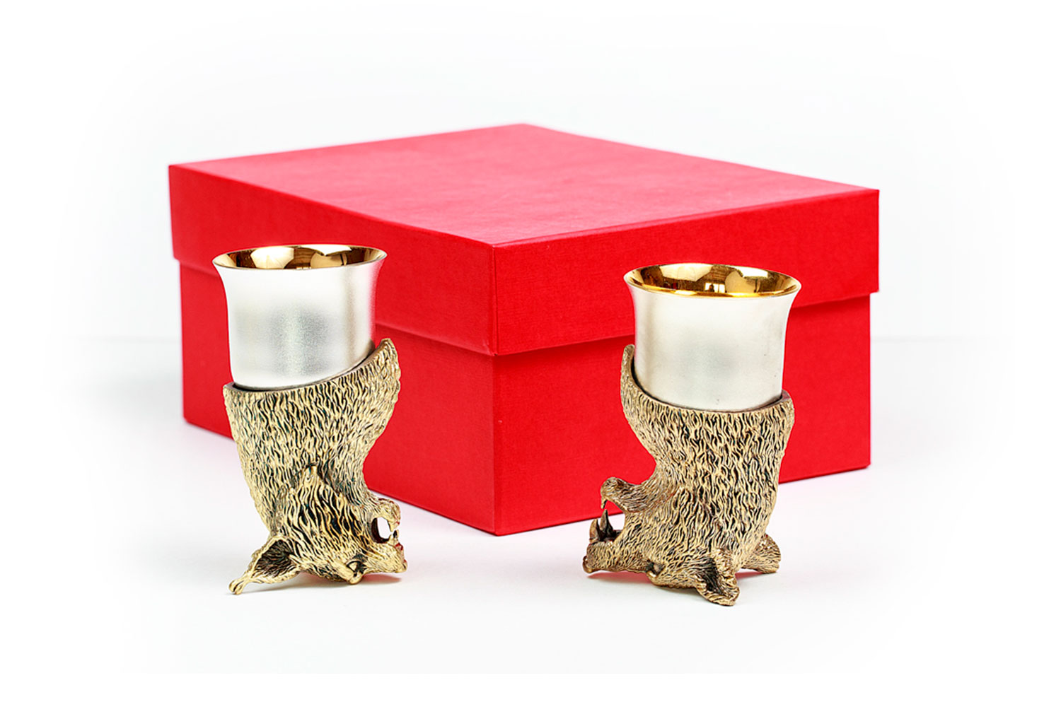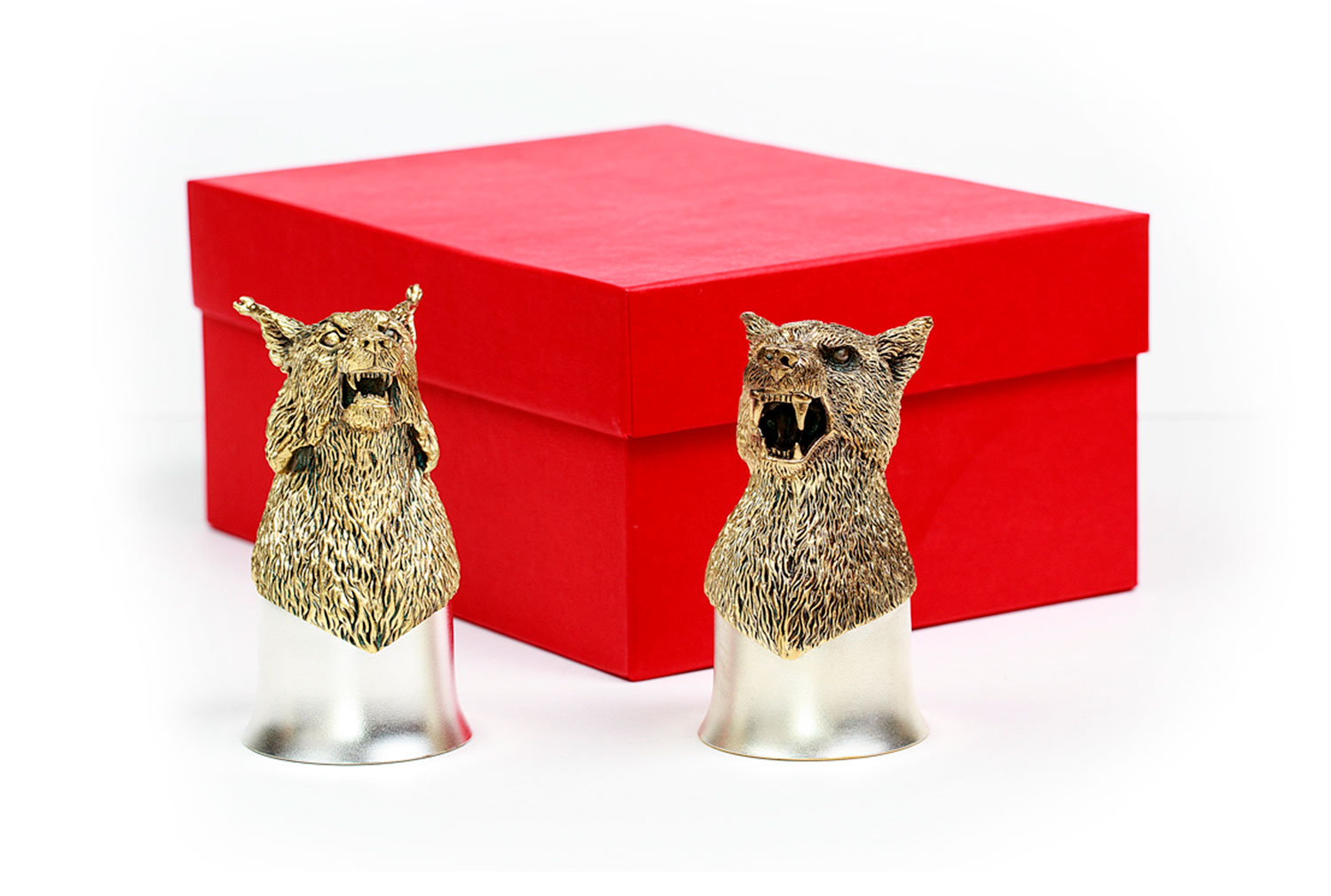 Стопки элит (волк, рысь). Описание: Стопки элит (Рысь, Лось, Заяц, Кабан) представляют из себя набор из четырех стопок перевертышей, каждая из которых уникальна по своей форме. Данный набор подойдет не только для людей, увлекающихся охотой, но и станет отличным сувениром партнерам по бизнесу или коллегам. Метод изготовления:  художественное литье из латуни (ручная работа) Рюмка: Мельхиор, Производитель: Мстерский Ювелир, Страна: Россия, Объем: 50 мл, Покрытие на 1 изделие: Серебра 3,47г, Золота 0,06г  Комплектация:  2-е стопки (голова латунь, стопка мельхиор  -  позолоченная, посеребренная) Упаковка:  дизайнерский картон, ложемент: атлас