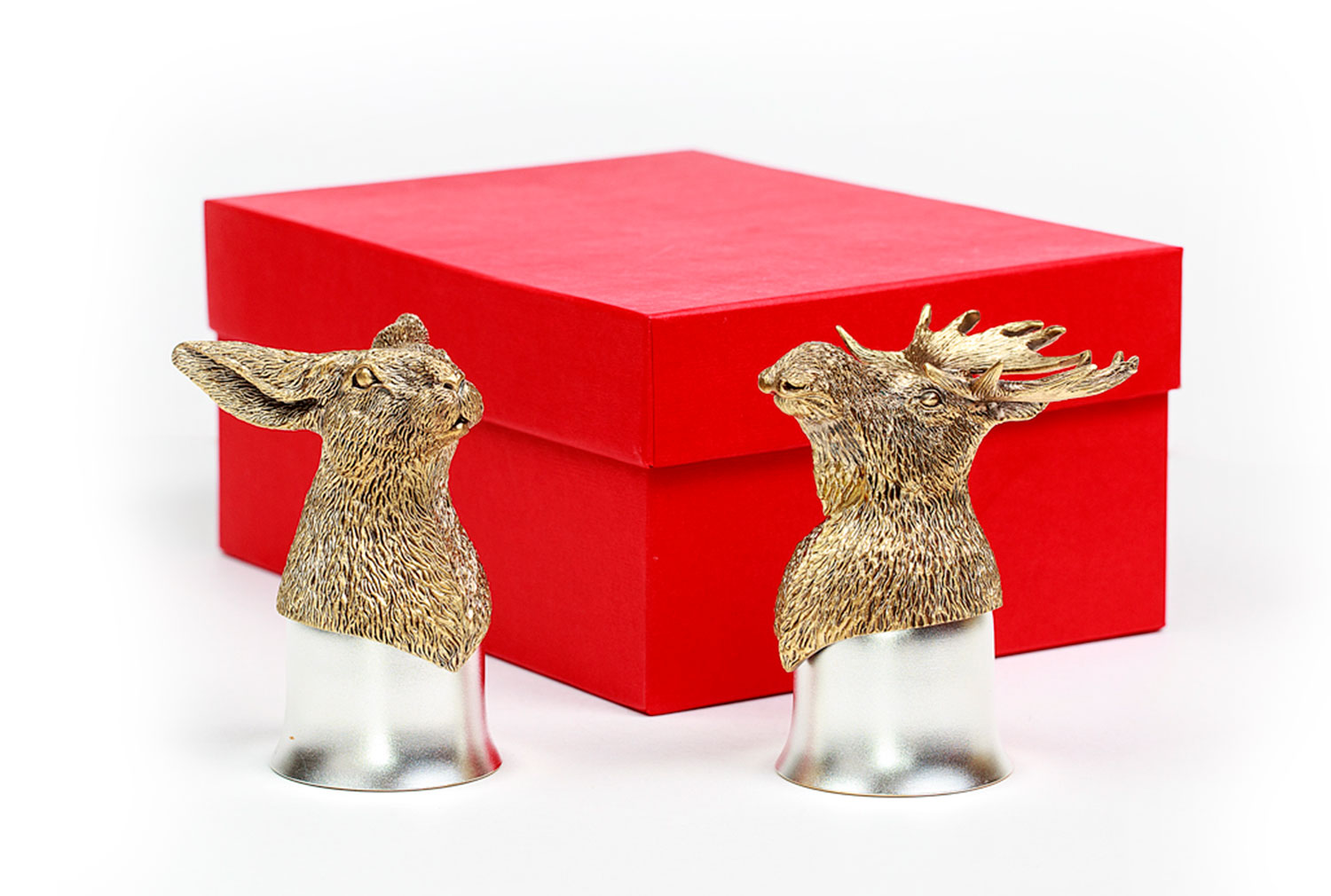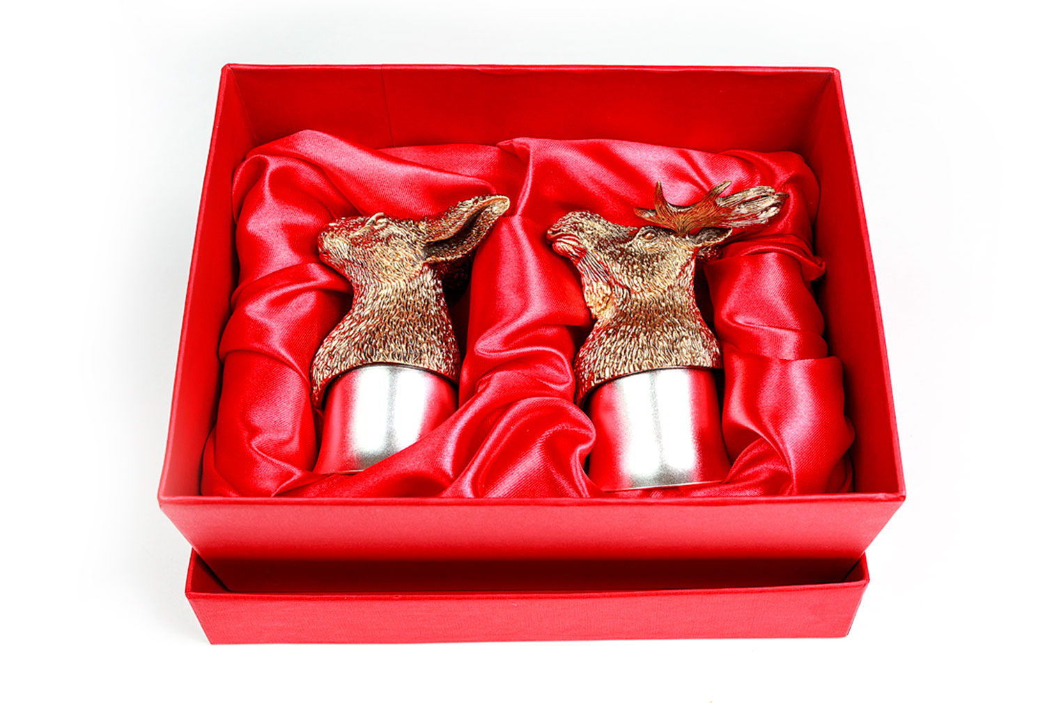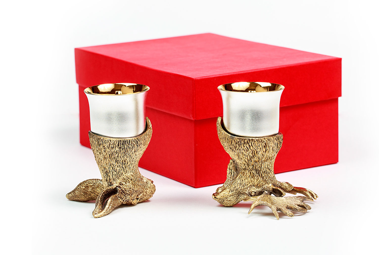 Стопки элит (заяц, лось). Описание: Стопки элит (Кабан, Волк, Рысь) станут оригинальным подарком для солидного мужчины. Каждая стопка уникальна в своем исполнении, что подчеркнет индивидульность обладателя. Метод изготовления: художественное литье из латуни (ручная работа) Рюмка: Мельхиор, Производитель: Мстерский Ювелир, Страна: Россия, Объем: 50 мл, Покрытие на 1 изделие: Серебра 3,47г, Золота 0,06г Комплектация: 2-е стопки (голова латунь, стопка мельхиор - позолоченная, посеребренная) Упаковка: дизайнерский картон, ложемент: атлас