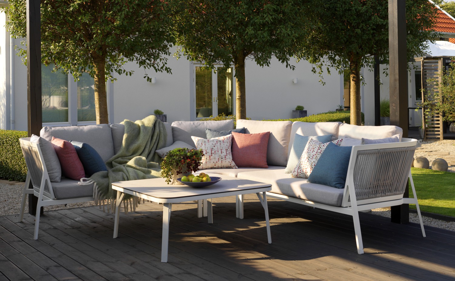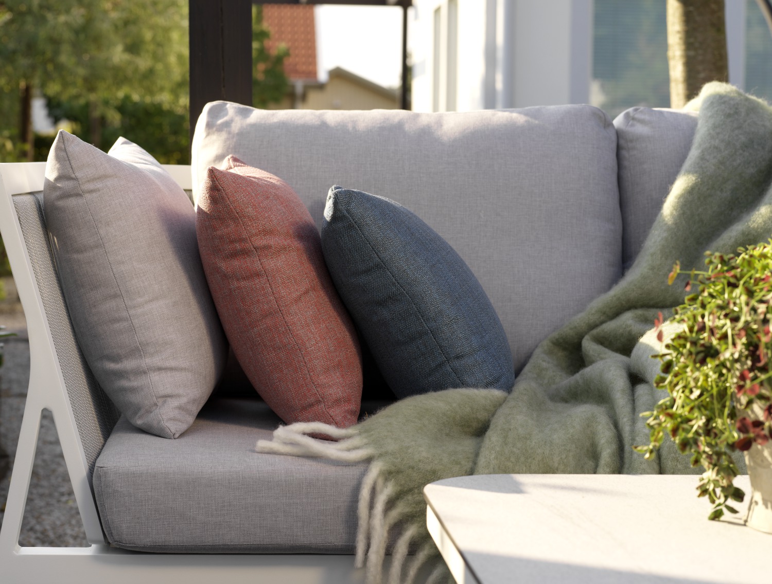 Очень удобный и элегантный алюминиевый ассортимент с матово-белой рамой, светло-серыми подушками и серой тканой веревкой сзади. Большая посадочная высота и прилагаемый журнальный столик имеют прочный верх HPL с гранитным рисунком. Ассортимент состоит из модульных частей, небольшой группы отдыха с двухместным диваном и креслом плюс обеденный стул - все с упором на элегантную форму. nbsp