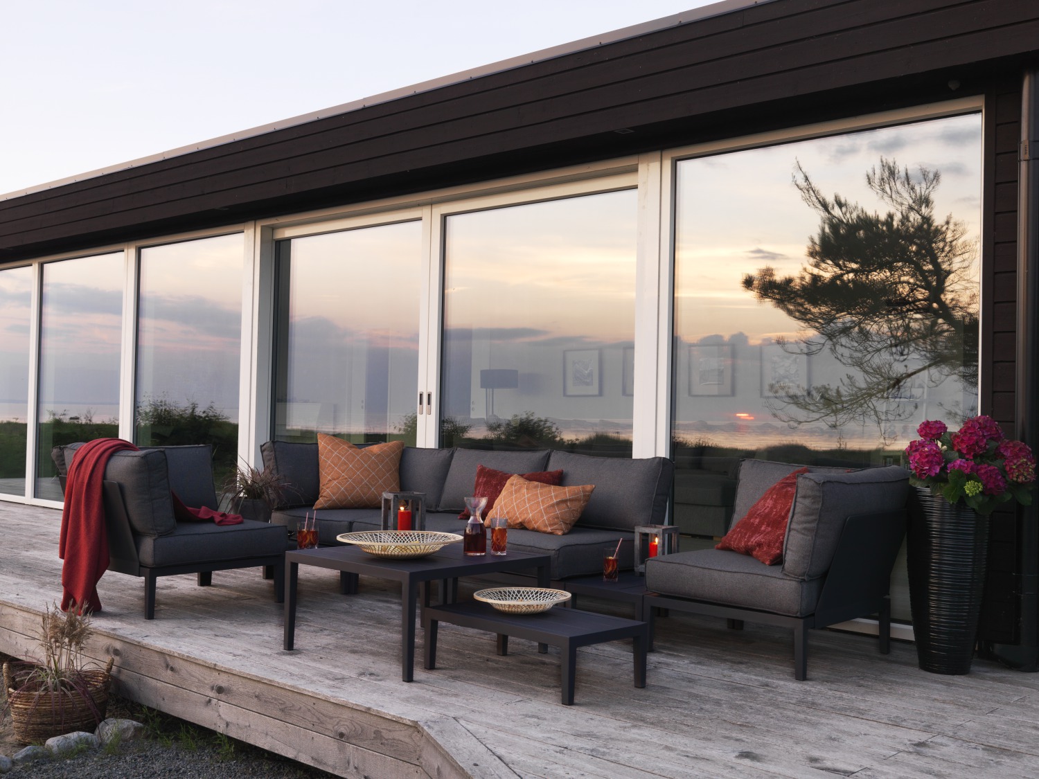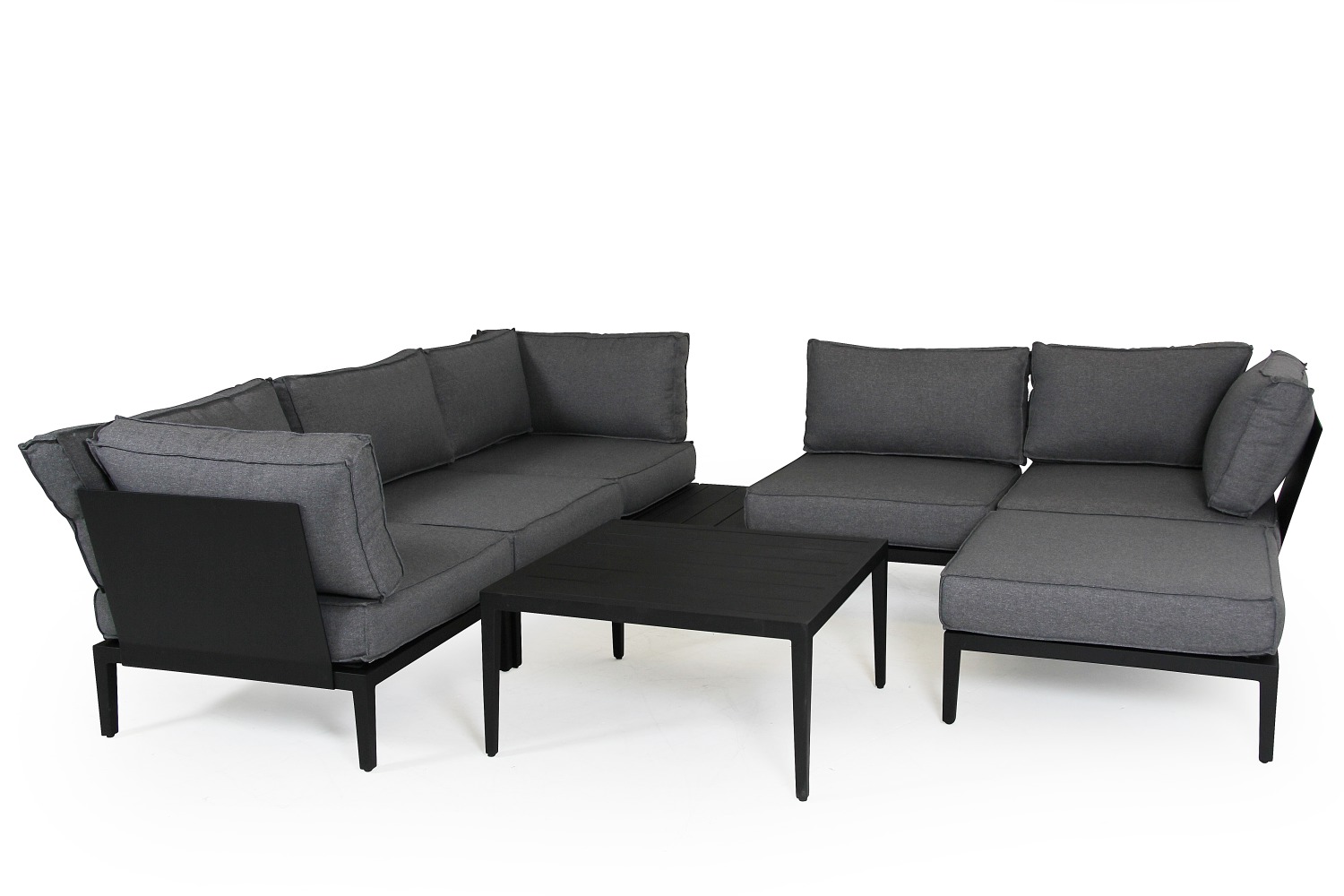 Mackenzie - восхитительная сборочная серия для гостиной из матового белого или матового черного алюминия с серыми подушками. Серия включает в себя угловую и центральную части и два стола. Меньший стол можно вставить под большой стол, а также установить между строительными элементами.