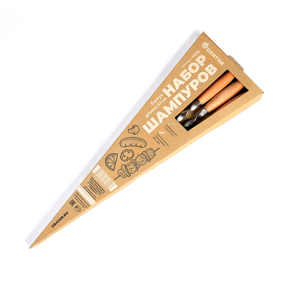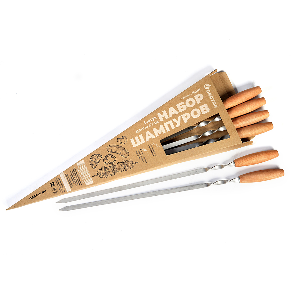 Набор шампуров. Подходят ко всем мангалам Gratar. Шесть долговечных шампуров длиной 57 см. Нержавеющая сталь 2х11 мм Продается только при покупке мангала от компании Gratar Ручка из ценных пород дерева (бук, дуб)