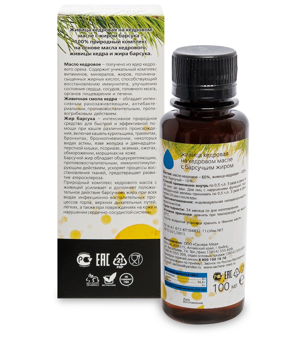 Med-09/06 живица кедровая на кедровом масле с жиром барсука, 100 мл. Параметры товара Страна производства: Россия Размеры упаковки Длина: 5 см; Ширина: 4 см; Высота: 14 см; Вес: 0.136 кг.